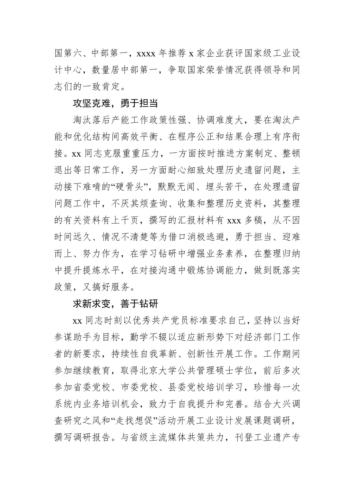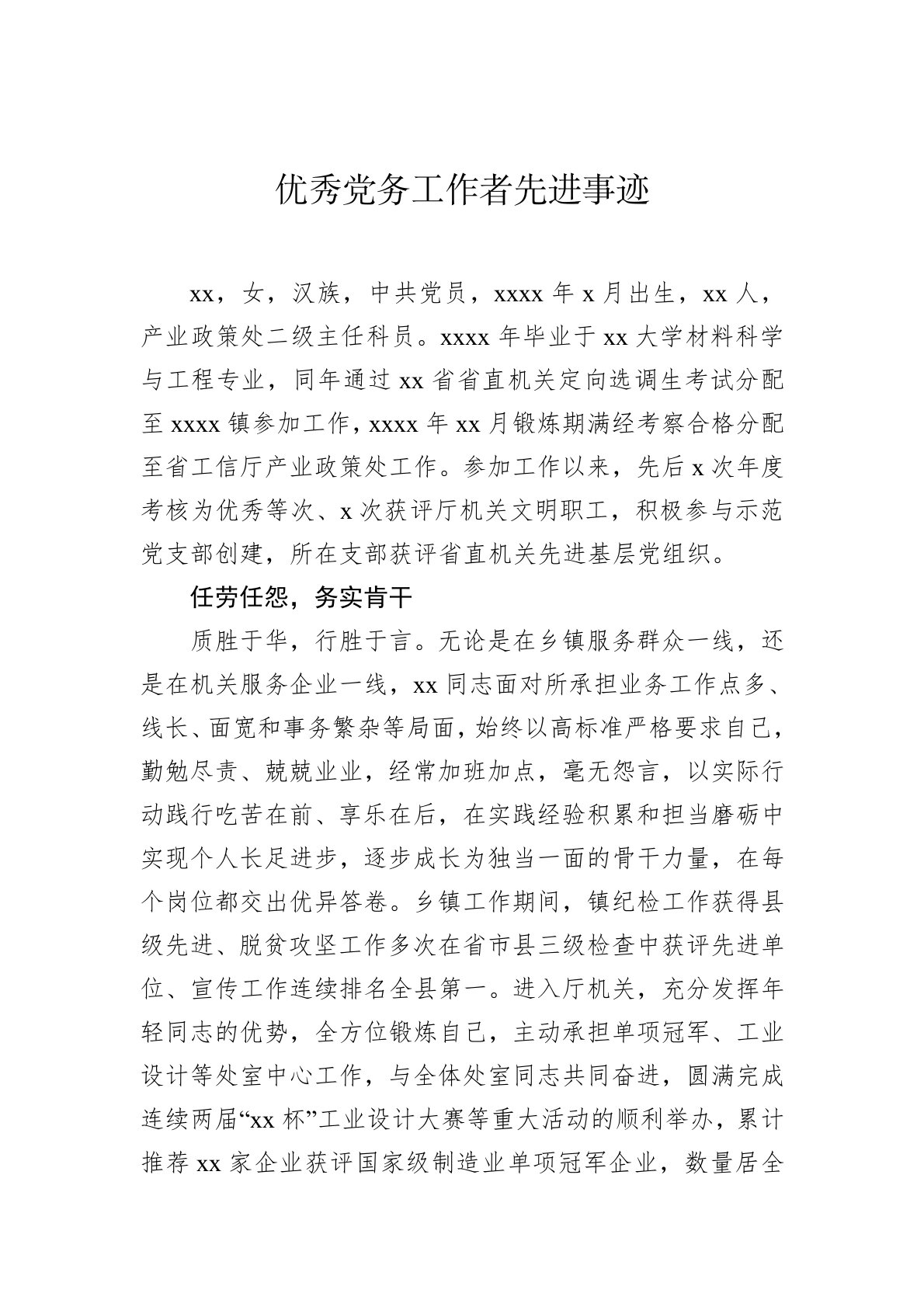 xx,女,汉族,中共党员,xxxx年x月出生,xx人,产业政策处二级主任科员。xxxx年毕业于xx大学材料科学与工程专业,同年通过xx省省直机关定向选调生考试分配至xxxx镇参加工作,xxxx年xx月锻炼期满经考察合格分配至省工信厅产业政策处工作。参加工作以来,先后x次年度考核为优秀等次、x次获评厅机关文明职工,积极参与示范党支部创建,所在支部获评省直机关先进基层党组织。任劳任怨,务实肯干质胜于华,行胜于言。无论是在乡镇服务群众一线,还是在机关服务企业一线,xx同志面对所承担业务工作点多、线长、面宽和事务繁杂等局面,始终以高标准严格要求自己,勤勉尽责、兢兢业业,经常加班加点,毫无怨言,以实际行动践行吃苦在前、享乐在后,在实践经验积累和担当磨砺中实现个人长足进步,逐步成长为独当一面的骨干力量,...