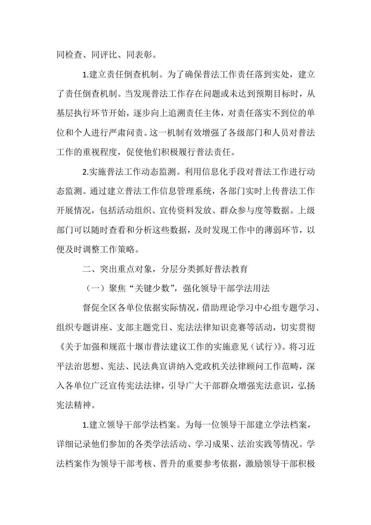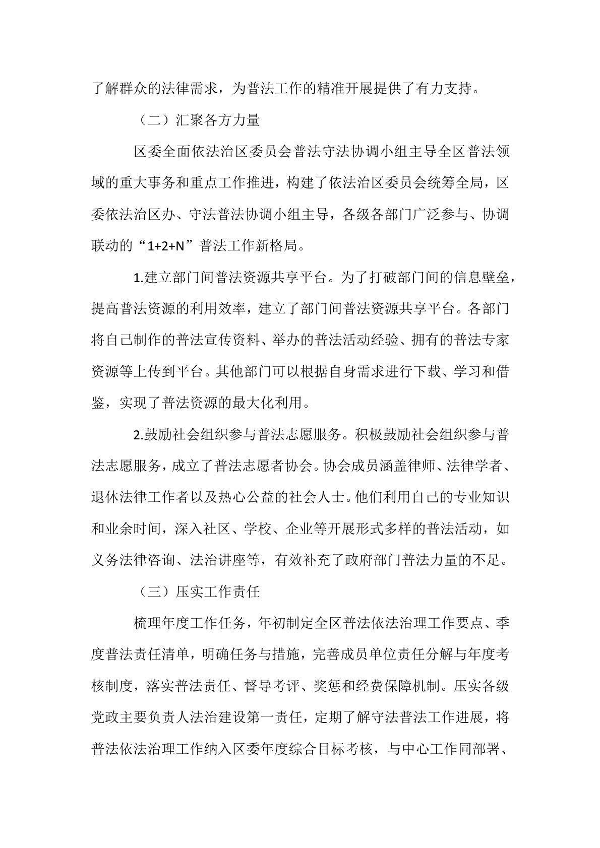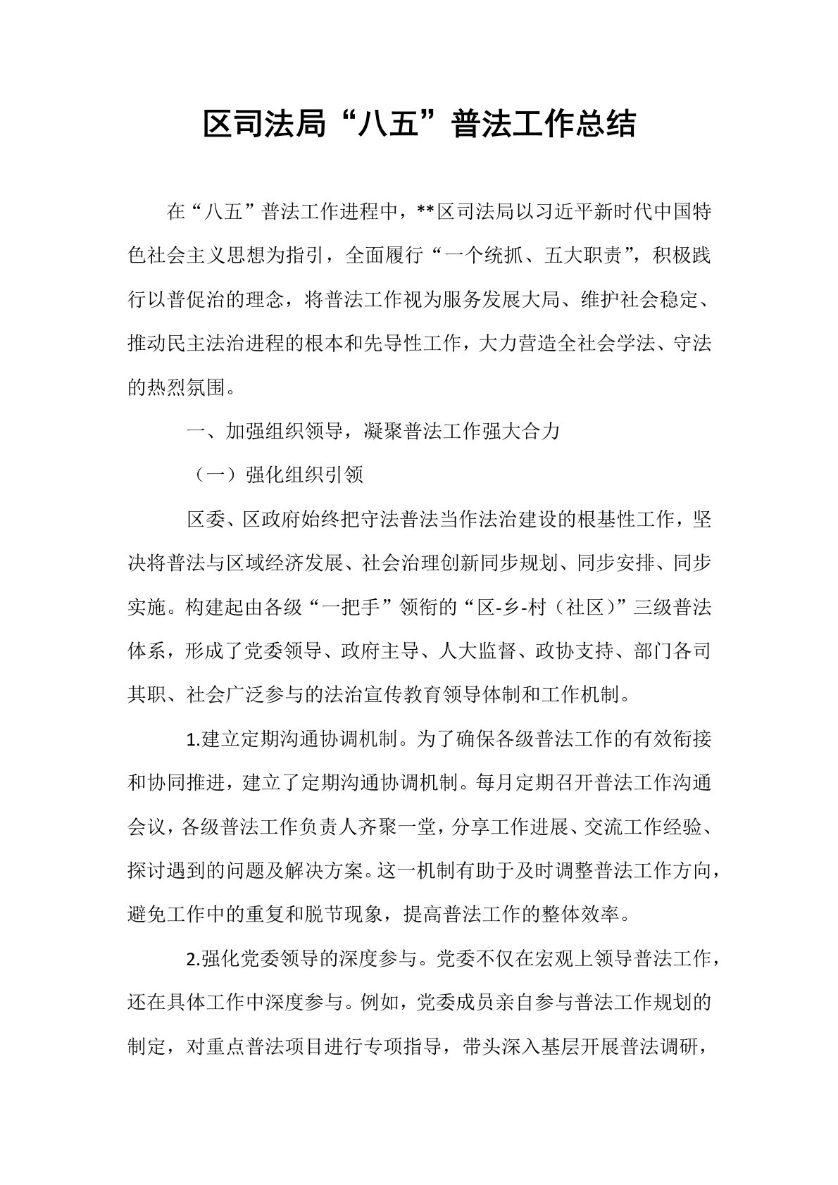 区司法局“八五”普法工作总结在“八五”普法工作进程中,**区司法局以习近平新时代中国特色社会主义思想为指引,全面履行“一个统抓、五大职责”,积极践行以普促治的理念,将普法工作视为服务发展大局、维护社会稳定、推动民主法治进程的根本和先导性工作,大力营造全社会学法、守法的热烈氛围。一、加强组织领导,凝聚普法工作强大合力(一)强化组织引领区委、区政府始终把守法普法当作法治建设的根基性工作,坚决将普法与区域经济发展、社会治理创新同步规划、同步安排、同步实施。构建起由各级“一把手”领衔的“区-乡-村(社区)”三级普法体系,形成了党委领导、政府主导、人大监督、政协支持、部门各司其职、社会广泛参与的法治宣传教育领导体制和工作机制。1.建立定期沟通协调机制。为了确保各级普法工作的有效衔接和协同推进,建立了定...