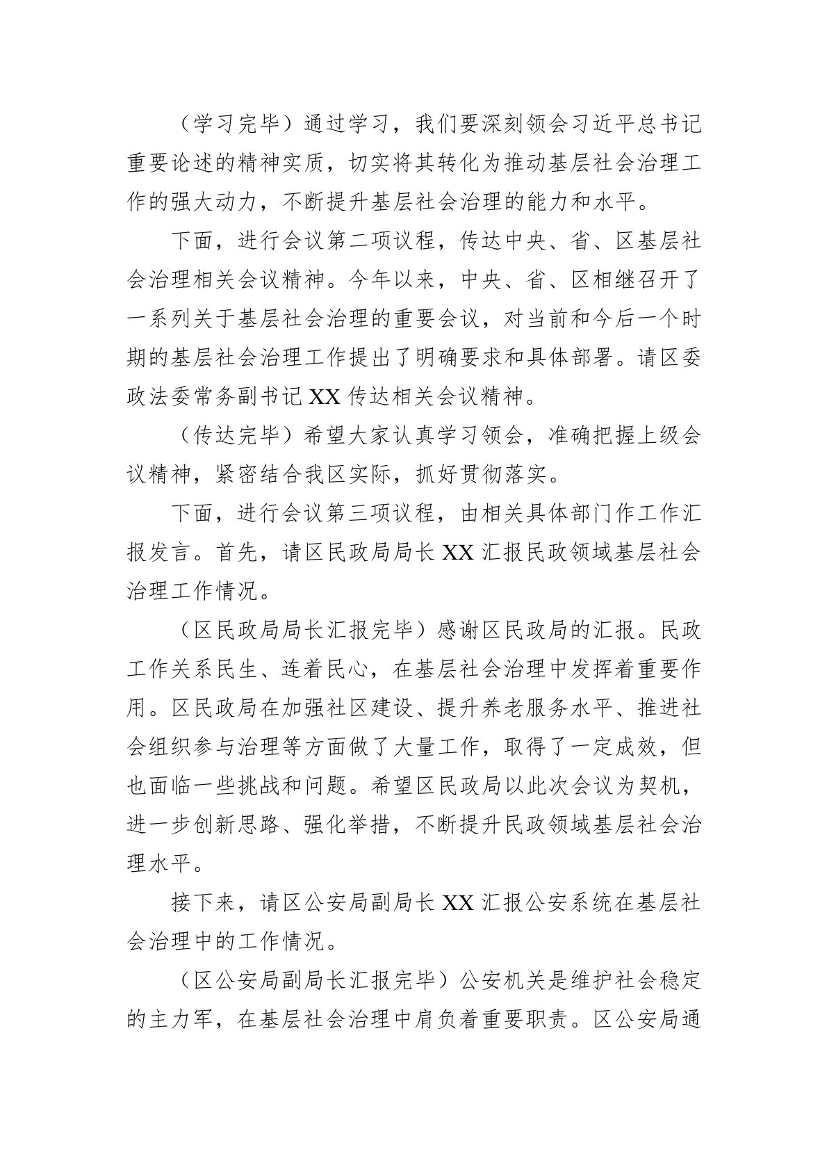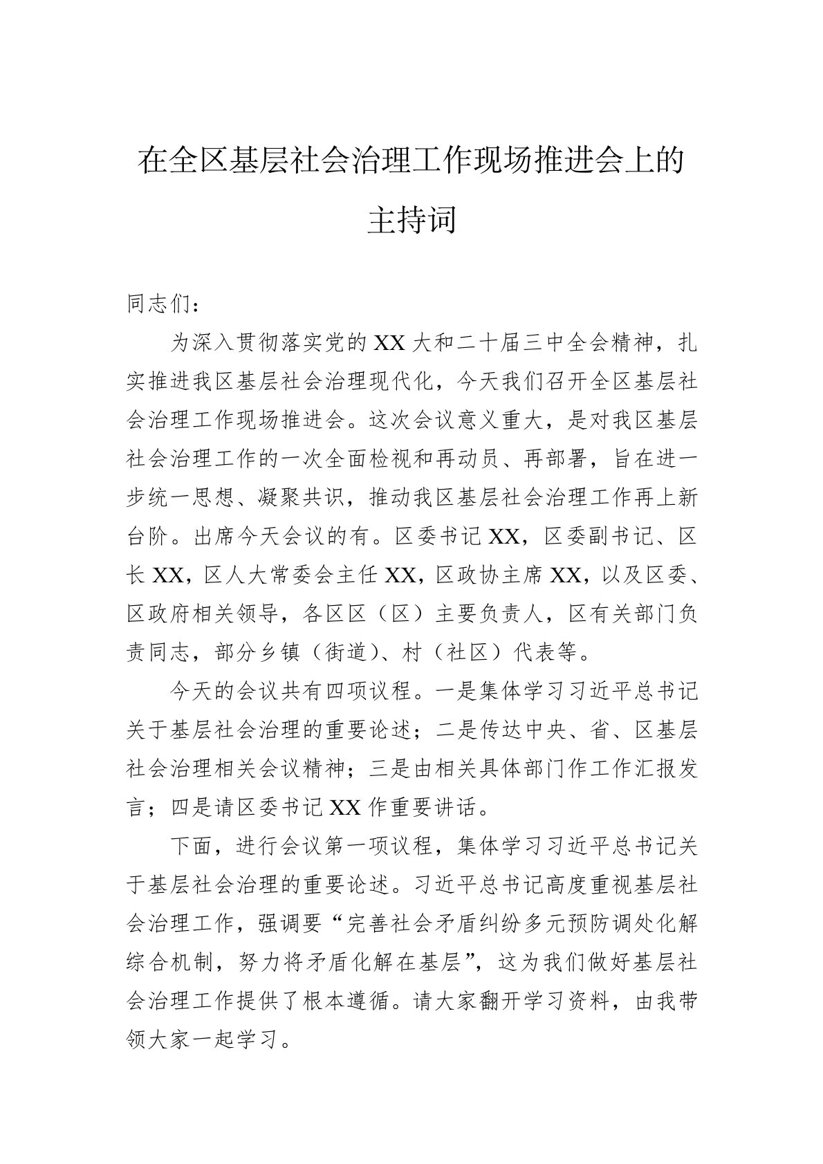同志们:为深入贯彻落实党的XX大和二十届三中全会精神,扎实推进我区基层社会治理现代化,今天我们召开全区基层社会治理工作现场推进会。这次会议意义重大,是对我区基层社会治理工作的一次全面检视和再动员、再部署,旨在进一步统一思想、凝聚共识,推动我区基层社会治理工作再上新台阶。出席今天会议的有。区委书记XX,区委副书记、区长XX,区人大常委会主任XX,区政协主席XX,以及区委、区政府相关领导,各区区(区)主要负责人,区有关部门负责同志,部分乡镇(街道)、村(社区)代表等。今天的会议共有四项议程。一是集体学习习近平总书记关于基层社会治理的重要论述;二是传达中央、省、区基层社会治理相关会议精神;三是由相关具体部门作工作汇报发言;四是请区委书记XX作重要讲话。下面,进行会议第一项议程,集体学习习近平总书记...