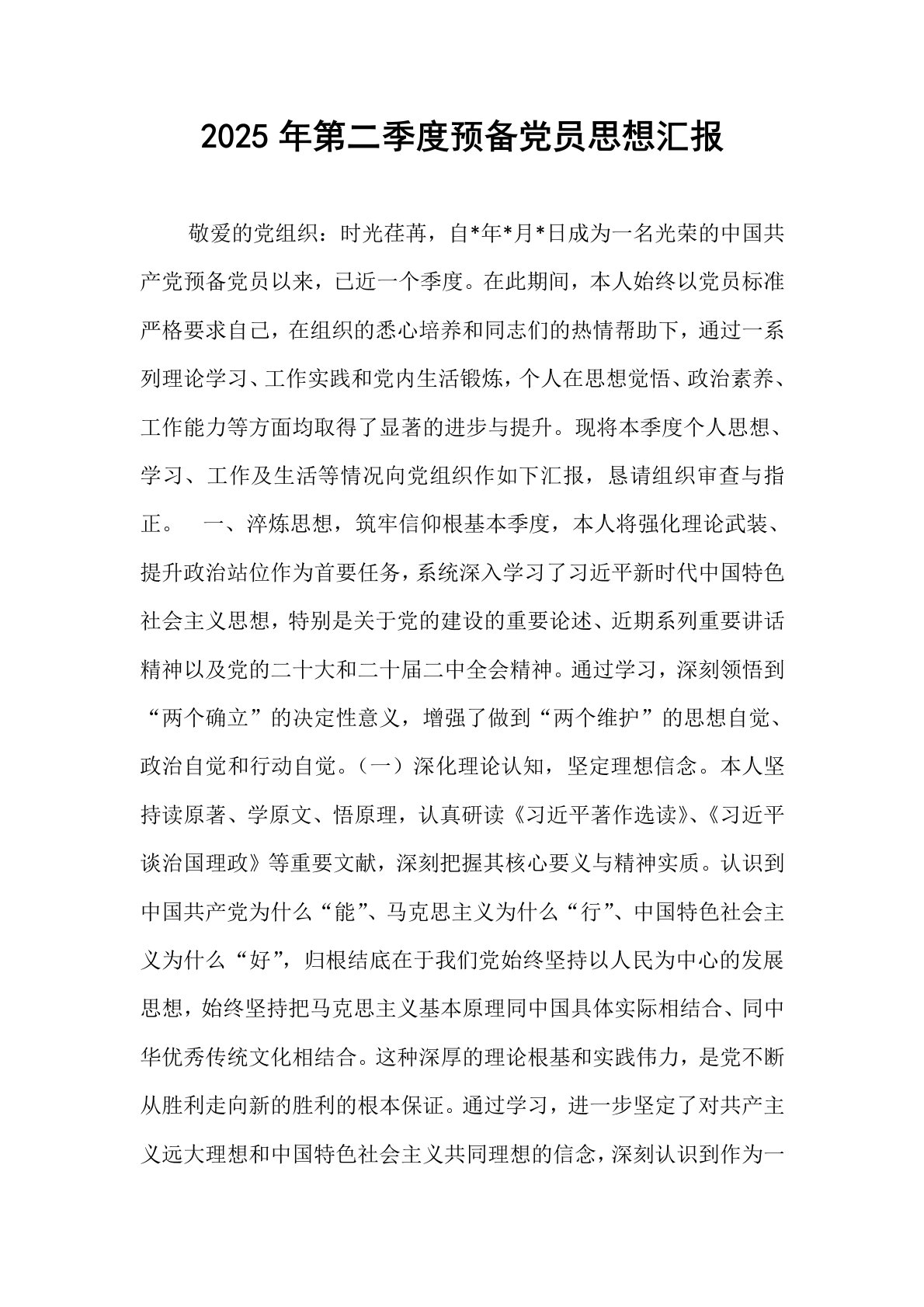 2025年第二季度预备党员思想汇报 敬爱的党组织:时光荏苒,自*年*月*日成为一名光荣的中国共产党预备党员以来,已近一个季度。在此期间,本人始终以党员标准严格要求自己,在组织的悉心培养和同志们的热情帮助下,通过一系列理论学习、工作实践和党内生活锻炼,个人在思想觉悟、政治素养、工作能力等方面均取得了显著的进步与提升。现将本季度个人思想、学习、工作及生活等情况向党组织作如下汇报,恳请组织审查与指正。 一、淬炼思想,筑牢信仰根基本季度,本人将强化理论武装、提升政治站位作为首要任务,系统深入学习了习近平新时代中国特色社会主义思想,特别是关于党的建设的重要论述、近期系列重要讲话精神以及党的二十大和二十届二中全会精神。通过学习,深刻领悟到“两个确立”的决定性意义,增强了做到“两个维护”的思想自觉、...