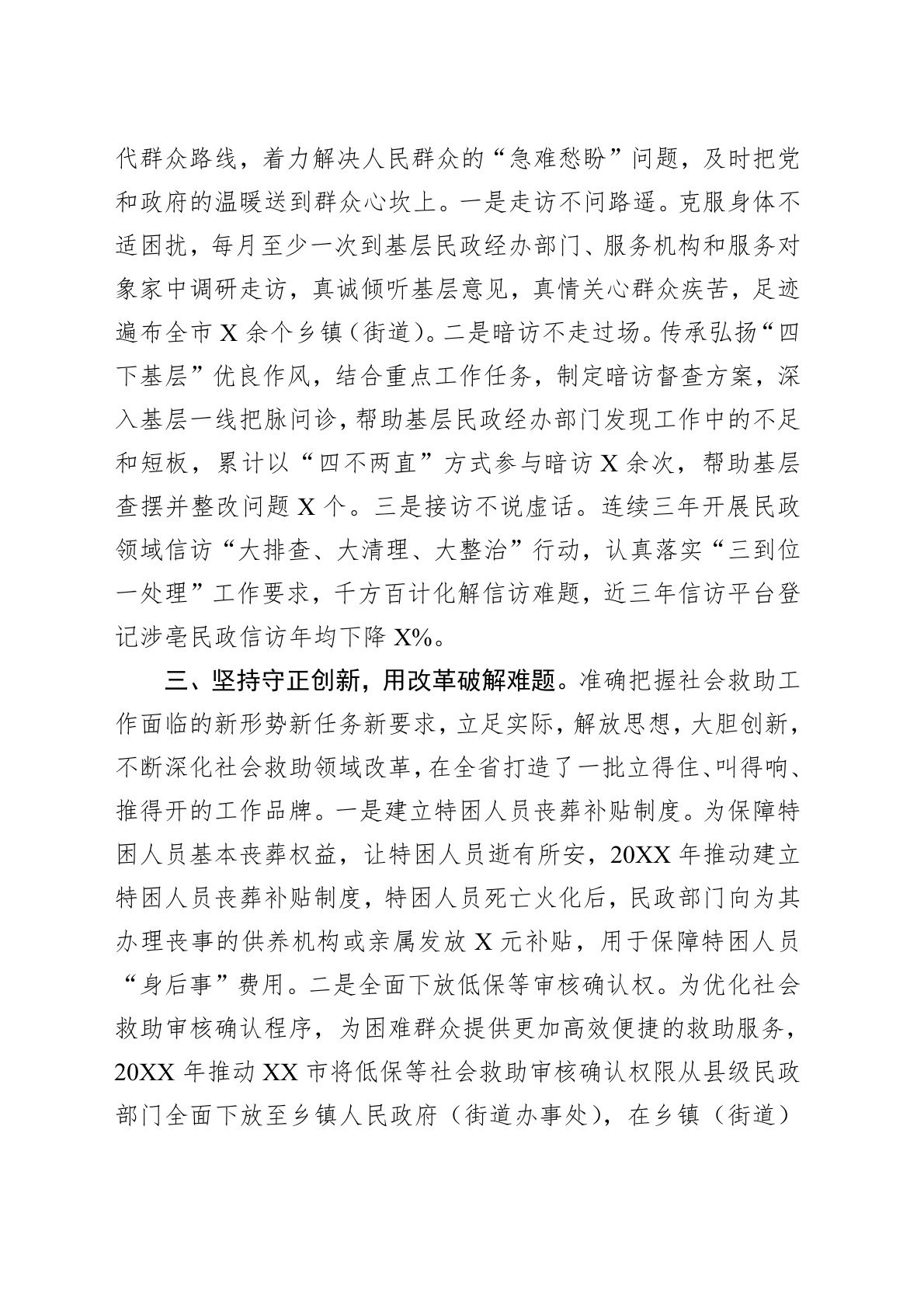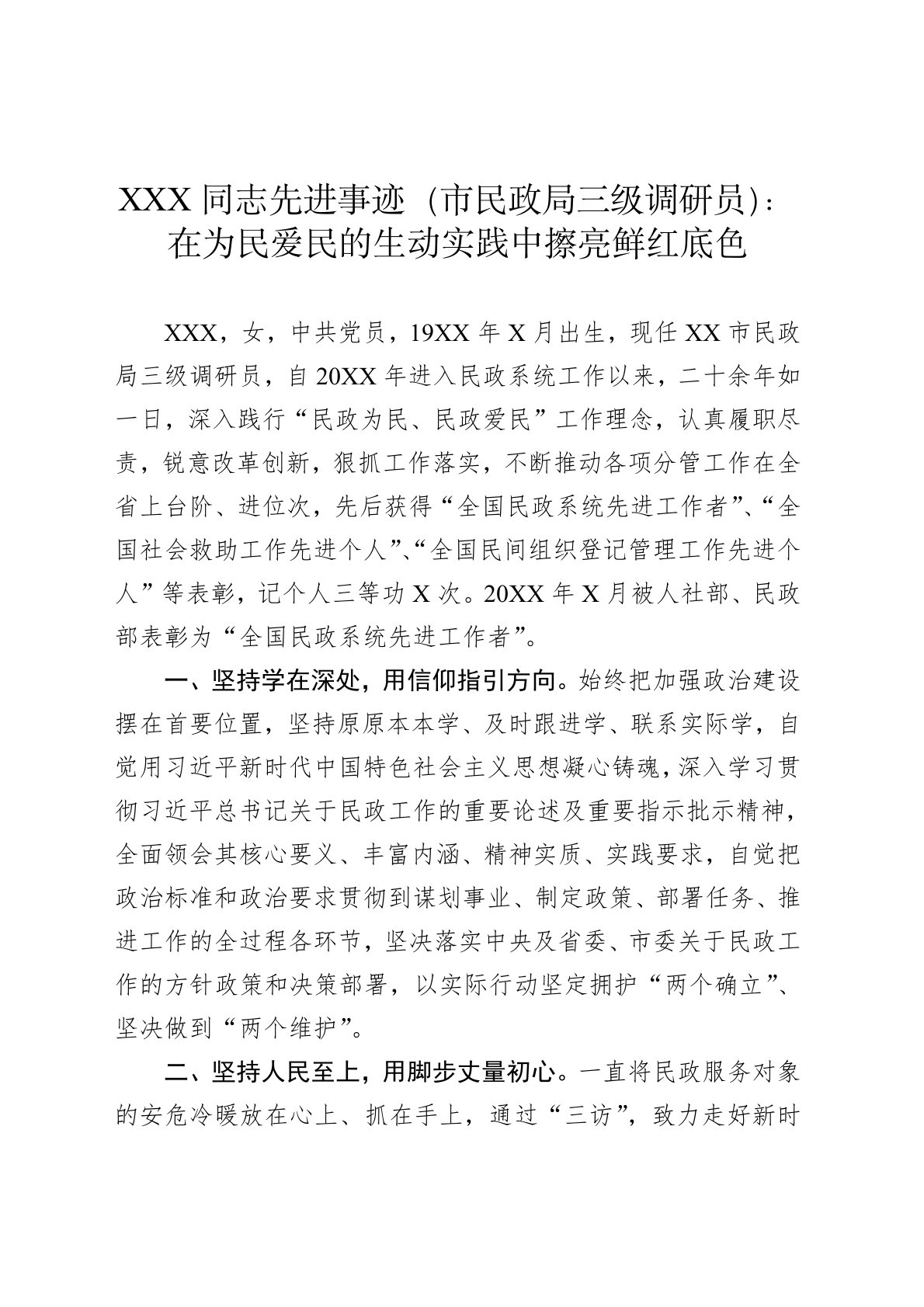 XXX,女,中共党员,19XX年X月出生,现任XX市民政局三级调研员,自20XX年进入民政系统工作以来,二十余年如一日,深入践行“民政为民、民政爱民”工作理念,认真履职尽责,锐意改革创新,狠抓工作落实,不断推动各项分管工作在全省上台阶、进位次,先后获得“全国民政系统先进工作者”、“全国社会救助工作先进个人”、“全国民间组织登记管理工作先进个人”等表彰,记个人三等功X次。20XX年X月被人社部、民政部表彰为“全国民政系统先进工作者”。一、坚持学在深处,用信仰指引方向。始终把加强政治建设摆在首要位置,坚持原原本本学、及时跟进学、联系实际学,自觉用习近平新时代中国特色社会主义思想凝心铸魂,深入学习贯彻习近平总书记关于民政工作的重要论述及重要指示批示精神,全面领会其核心要义、丰富内涵、精神实质、实践...