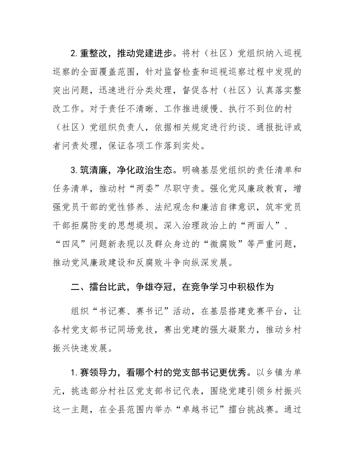 县区党支部书记擂台比武经验材料今年以来,为解决基层党建特色不显、集体经济发展缓慢、村党支部书记工作不力等问题,我县积极探索新的工作方式,强化工作措施,大力开展“擂台竞技,夺旗争优”活动,极大地调动了基层党员干部干事创业的积极性,有力地发挥了“关键少数”的带头示范作用。一、精心布局,明确责任,于党性坚守中强化担当秉持“书记带头抓、层层抓落实”的理念,层层传导压力,保障管党治党主体责任有效落实。1.强监督,确保责任履行。乡镇党委的第一书记以身作则,主动承担责任,每年至少与乡镇党委班子成员进行x次深入的谈心谈话;各乡镇党委书记每年至少与村常职干部开展x次谈心交流。借助谈话提醒的方式,提前进行监督防范。同时,县纪检监察部门利用“大数据+智能监督”的方式,针对公务用车、加油卡、ETC卡以及脱贫攻坚领域...