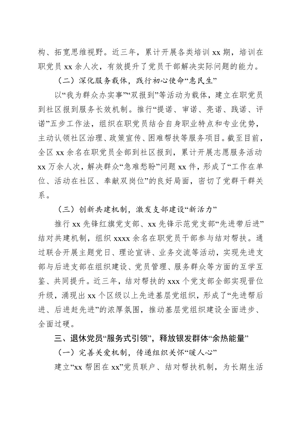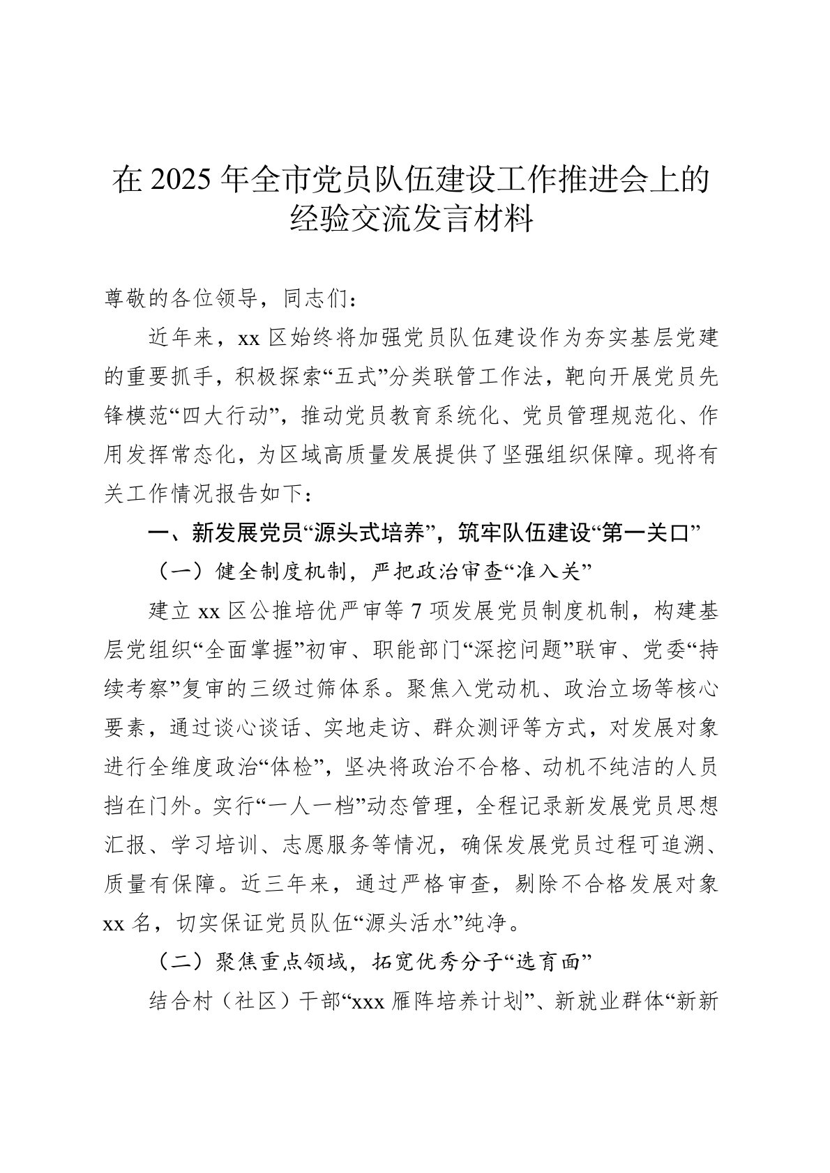 尊敬的各位领导,同志们:近年来,xx区始终将加强党员队伍建设作为夯实基层党建的重要抓手,积极探索“五式”分类联管工作法,靶向开展党员先锋模范“四大行动”,推动党员教育系统化、党员管理规范化、作用发挥常态化,为区域高质量发展提供了坚强组织保障。现将有关工作情况报告如下:一、新发展党员“源头式培养”,筑牢队伍建设“第一关口”(一)健全制度机制,严把政治审查“准入关”建立xx区公推培优严审等7项发展党员制度机制,构建基层党组织“全面掌握”初审、职能部门“深挖问题”联审、党委“持续考察”复审的三级过筛体系。聚焦入党动机、政治立场等核心要素,通过谈心谈话、实地走访、群众测评等方式,对发展对象进行全维度政治“体检”,坚决将政治不合格、动机不纯洁的人员挡在门外。实行“一人一档”动态管理,全程记录新发展党员...