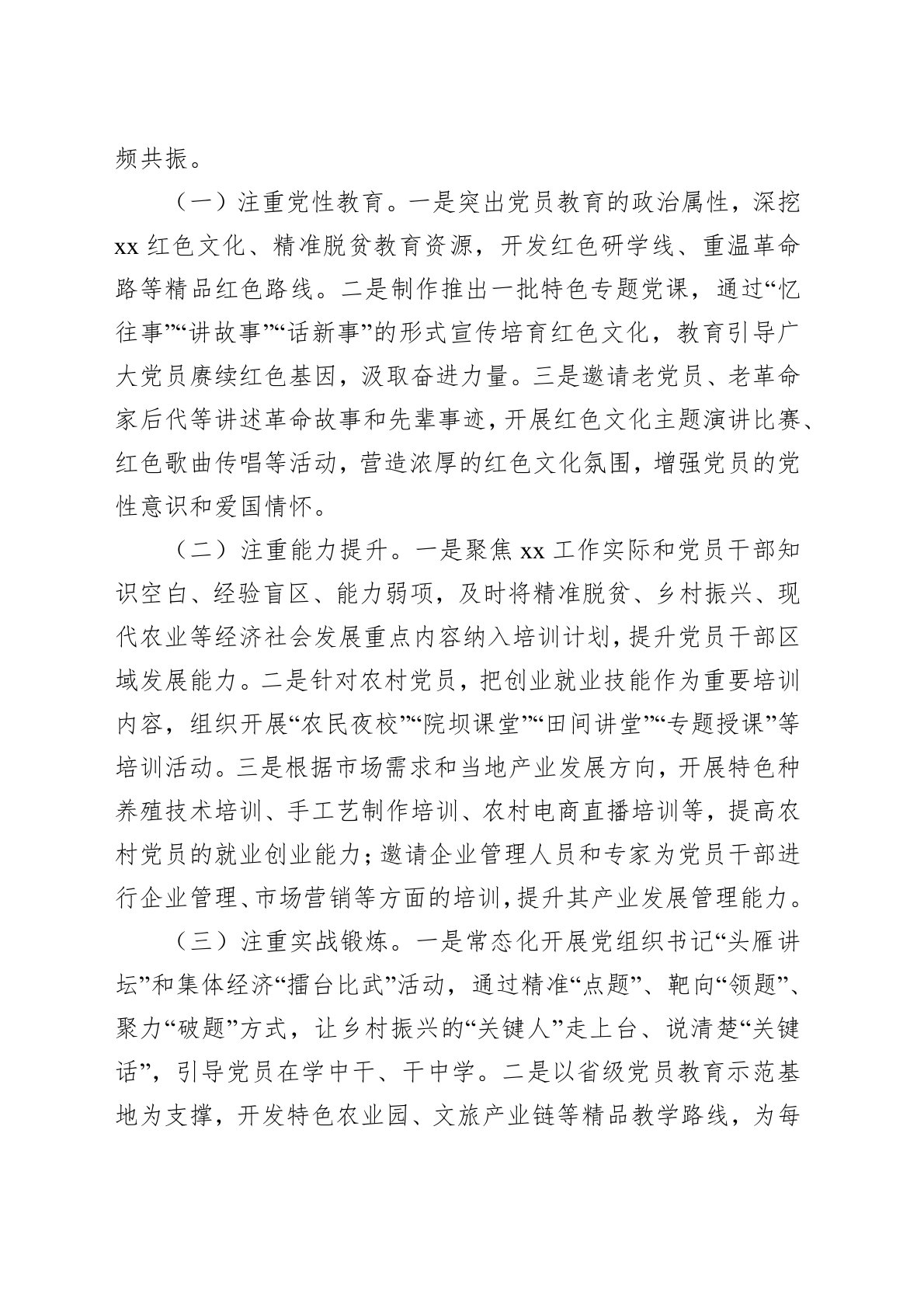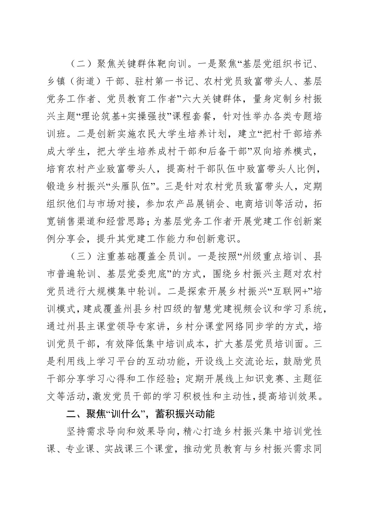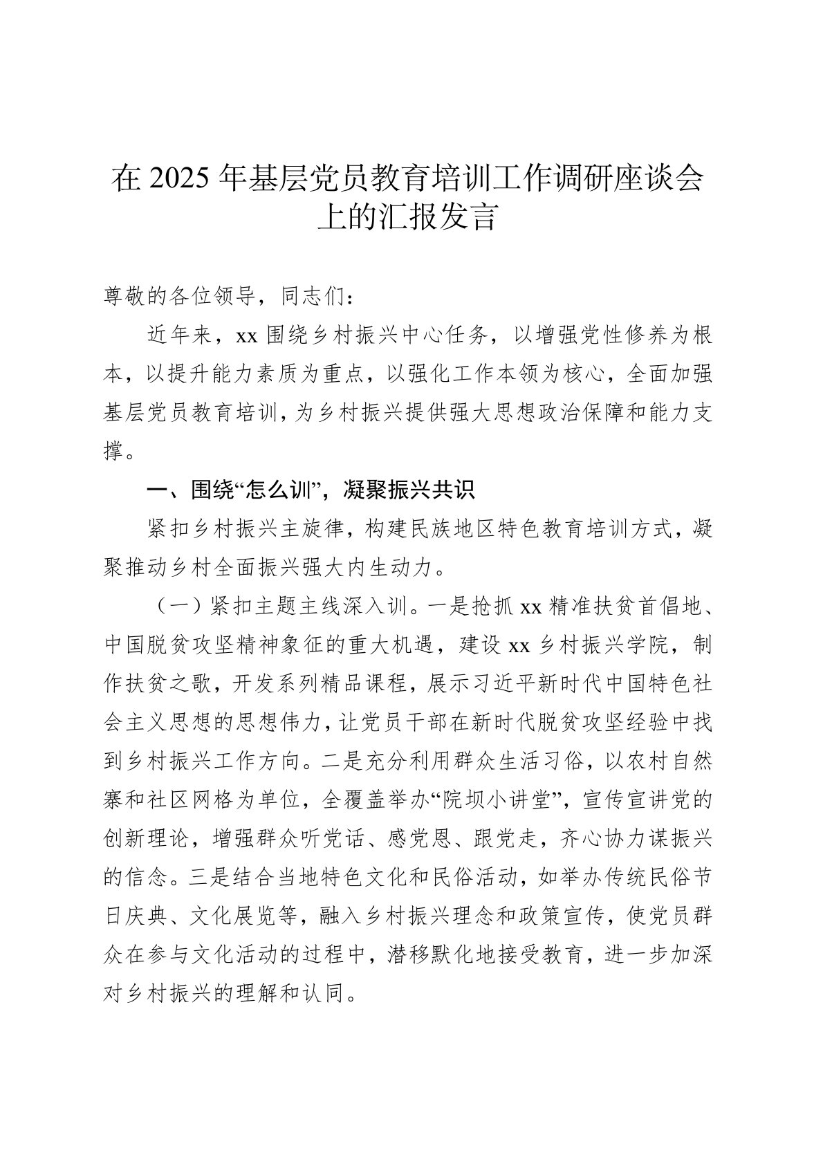尊敬的各位领导,同志们:近年来,xx围绕乡村振兴中心任务,以增强党性修养为根本,以提升能力素质为重点,以强化工作本领为核心,全面加强基层党员教育培训,为乡村振兴提供强大思想政治保障和能力支撑。一、围绕“怎么训”,凝聚振兴共识紧扣乡村振兴主旋律,构建民族地区特色教育培训方式,凝聚推动乡村全面振兴强大内生动力。(一)紧扣主题主线深入训。一是抢抓xx精准扶贫首倡地、中国脱贫攻坚精神象征的重大机遇,建设xx乡村振兴学院,制作扶贫之歌,开发系列精品课程,展示习近平新时代中国特色社会主义思想的思想伟力,让党员干部在新时代脱贫攻坚经验中找到乡村振兴工作方向。二是充分利用群众生活习俗,以农村自然寨和社区网格为单位,全覆盖举办“院坝小讲堂”,宣传宣讲党的创新理论,增强群众听党话、感党恩、跟党走,齐心协力谋振兴...