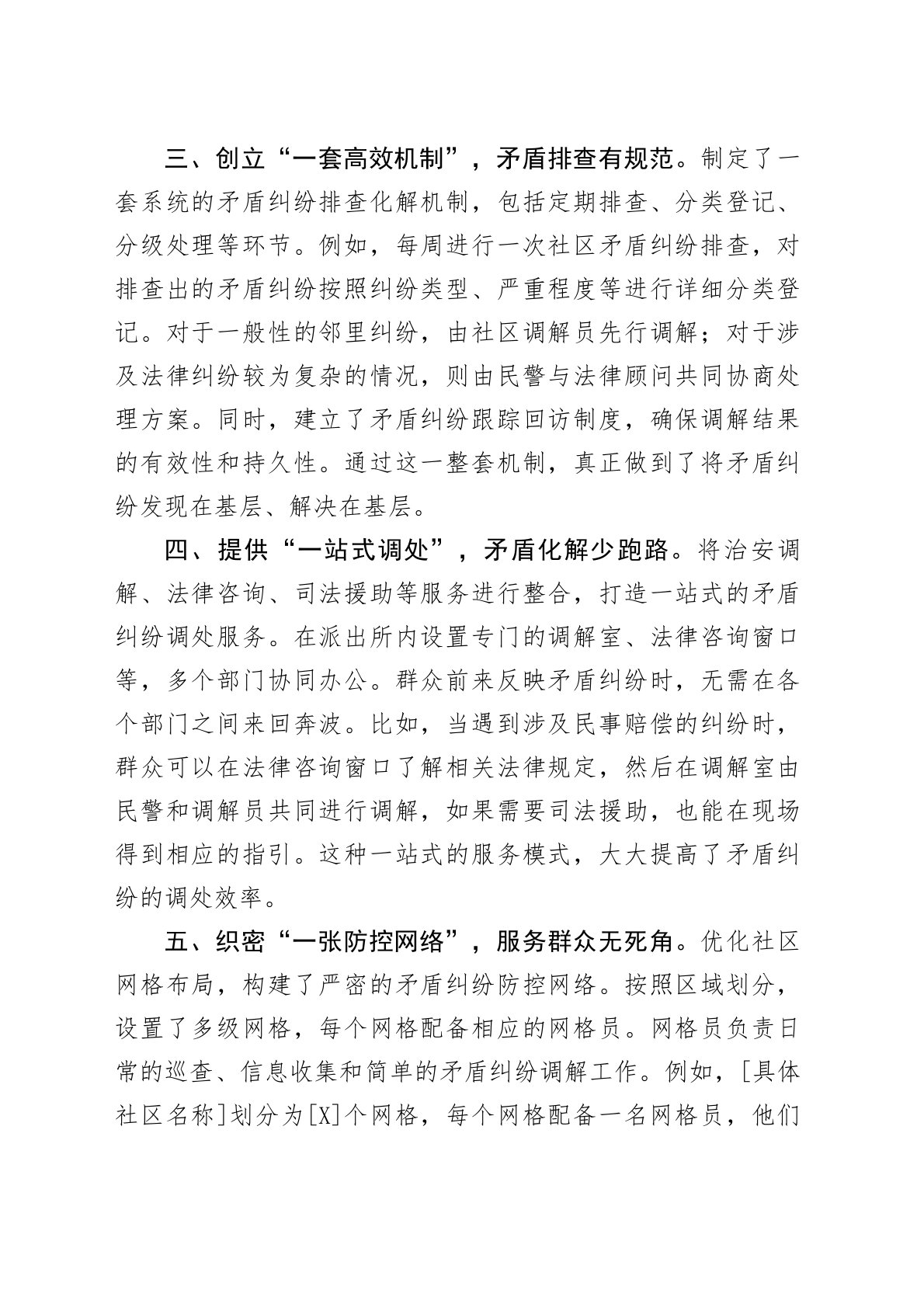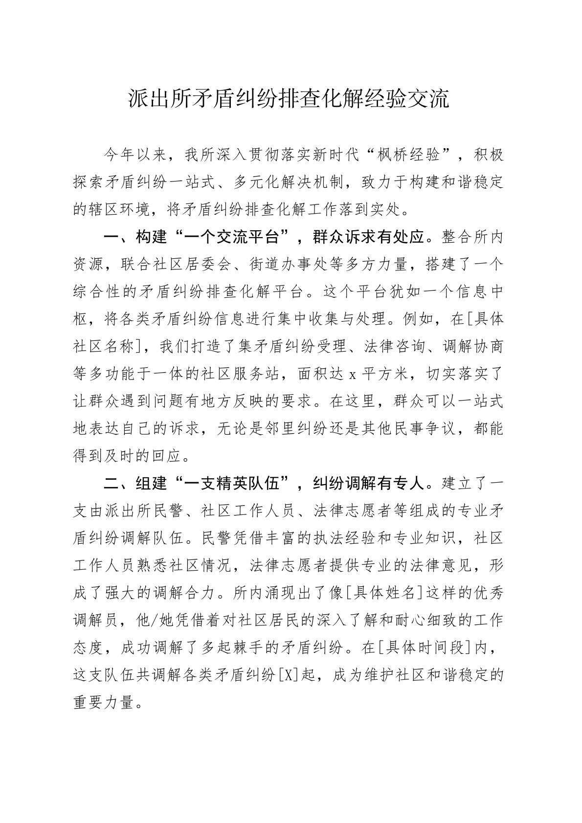 派出所矛盾纠纷排查化解经验交流今年以来,我所深入贯彻落实新时代“枫桥经验”,积极探索矛盾纠纷一站式、多元化解决机制,致力于构建和谐稳定的辖区环境,将矛盾纠纷排查化解工作落到实处。一、构建“一个交流平台”,群众诉求有处应。整合所内资源,联合社区居委会、街道办事处等多方力量,搭建了一个综合性的矛盾纠纷排查化解平台。这个平台犹如一个信息中枢,将各类矛盾纠纷信息进行集中收集与处理。例如,在[具体社区名称],我们打造了集矛盾纠纷受理、法律咨询、调解协商等多功能于一体的社区服务站,面积达x平方米,切实落实了让群众遇到问题有地方反映的要求。在这里,群众可以一站式地表达自己的诉求,无论是邻里纠纷还是其他民事争议,都能得到及时的回应。二、组建“一支精英队伍”,纠纷调解有专人。建立了一支由派出所民警、社区工作人...