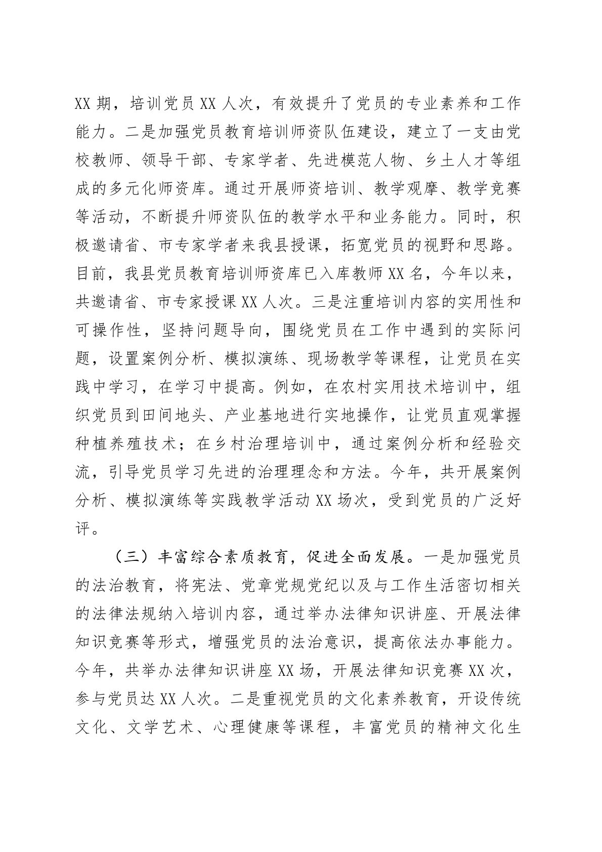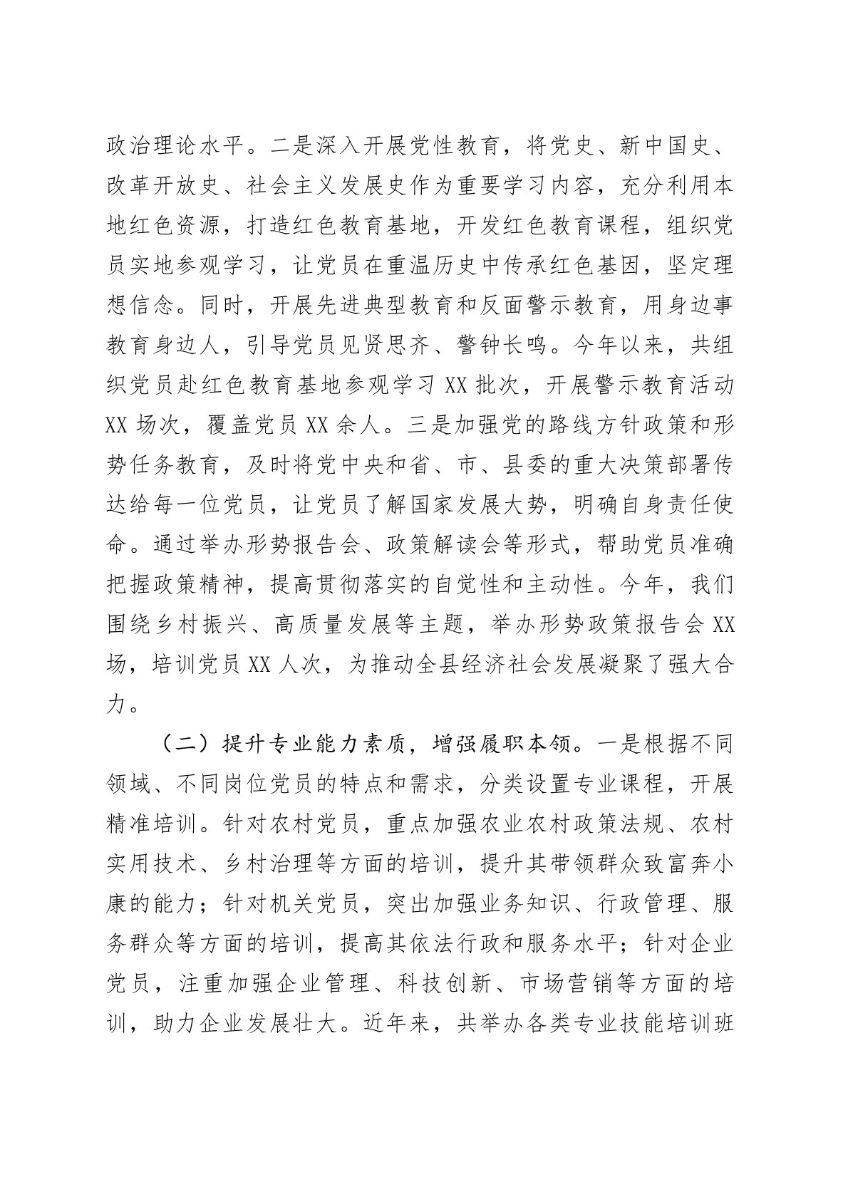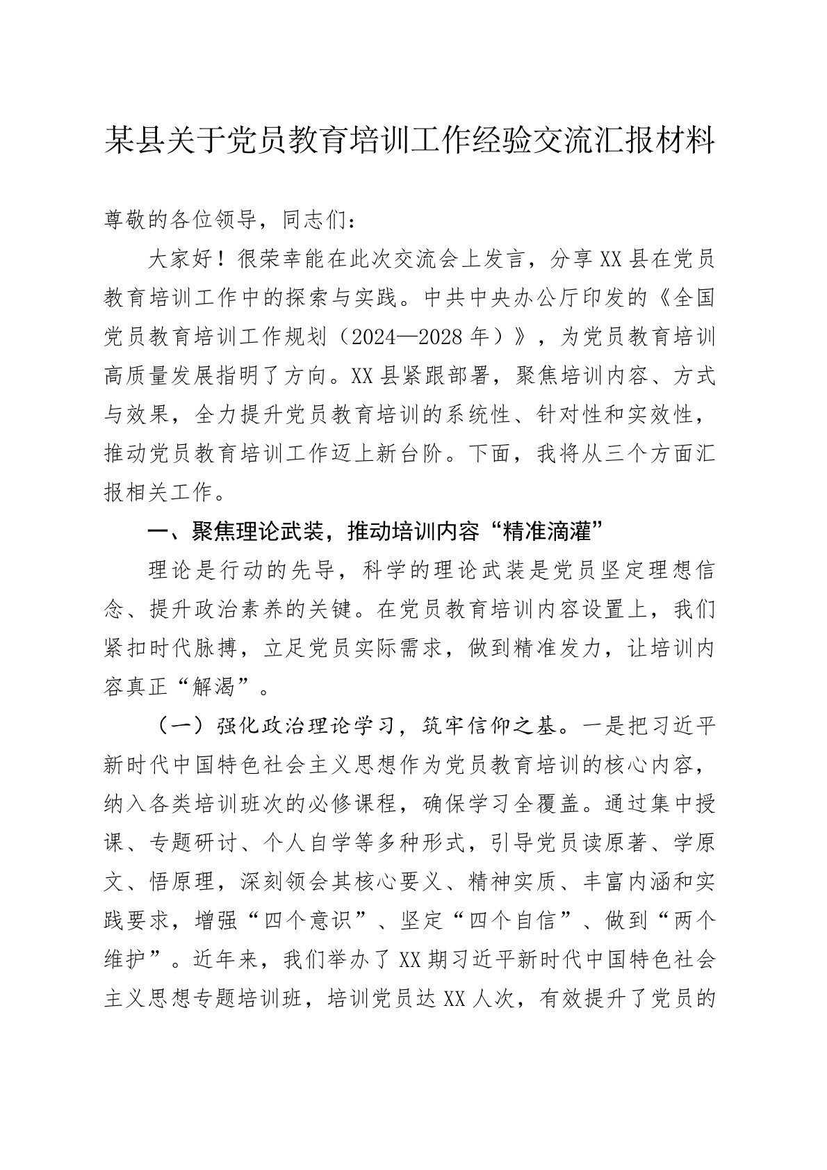 某县关于党员教育培训工作经验交流汇报材料尊敬的各位领导,同志们:大家好!很荣幸能在此次交流会上发言,分享XX县在党员教育培训工作中的探索与实践。中共中央办公厅印发的《全国党员教育培训工作规划(2024—2028年)》,为党员教育培训高质量发展指明了方向。XX县紧跟部署,聚焦培训内容、方式与效果,全力提升党员教育培训的系统性、针对性和实效性,推动党员教育培训工作迈上新台阶。下面,我将从三个方面汇报相关工作。一、聚焦理论武装,推动培训内容“精准滴灌”理论是行动的先导,科学的理论武装是党员坚定理想信念、提升政治素养的关键。在党员教育培训内容设置上,我们紧扣时代脉搏,立足党员实际需求,做到精准发力,让培训内容真正“解渴”。(一)强化政治理论学习,筑牢信仰之基。一是把习近平新时代中国特色社会主义思想作...