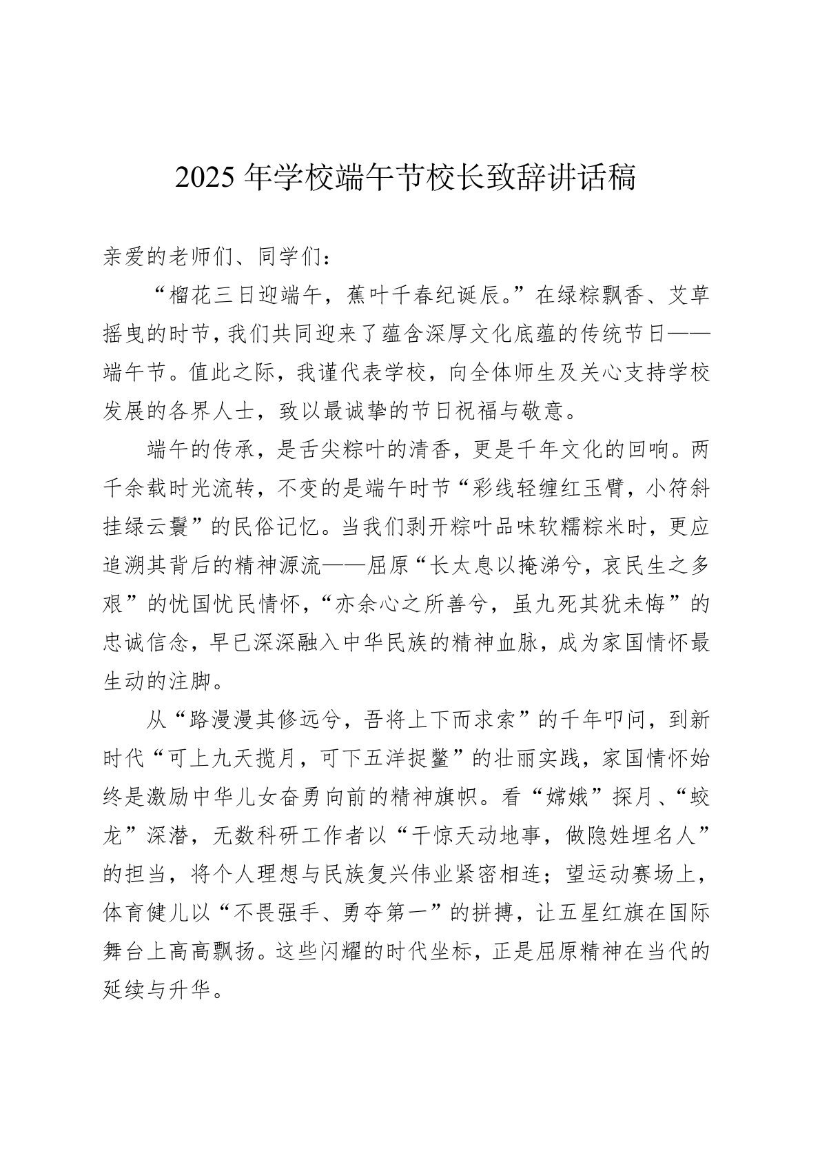 亲爱的老师们、同学们:“榴花三日迎端午,蕉叶千春纪诞辰。”在绿粽飘香、艾草摇曳的时节,我们共同迎来了蕴含深厚文化底蕴的传统节日——端午节。值此之际,我谨代表学校,向全体师生及关心支持学校发展的各界人士,致以最诚挚的节日祝福与敬意。端午的传承,是舌尖粽叶的清香,更是千年文化的回响。两千余载时光流转,不变的是端午时节“彩线轻缠红玉臂,小符斜挂绿云鬟”的民俗记忆。当我们剥开粽叶品味软糯粽米时,更应追溯其背后的精神源流——屈原“长太息以掩涕兮,哀民生之多艰”的忧国忧民情怀,“亦余心之所善兮,虽九死其犹未悔”的忠诚信念,早已深深融入中华民族的精神血脉,成为家国情怀最生动的注脚。从“路漫漫其修远兮,吾将上下而求索”的千年叩问,到新时代“可上九天揽月,可下五洋捉鳖”的壮丽实践,家国情怀始终是激励中华儿女奋...