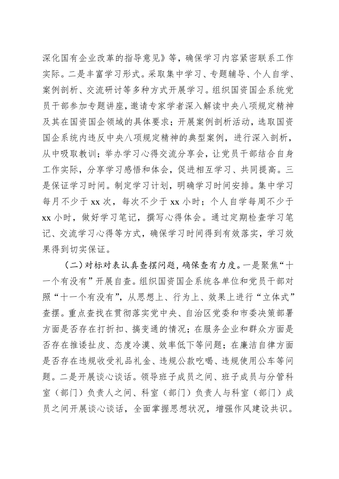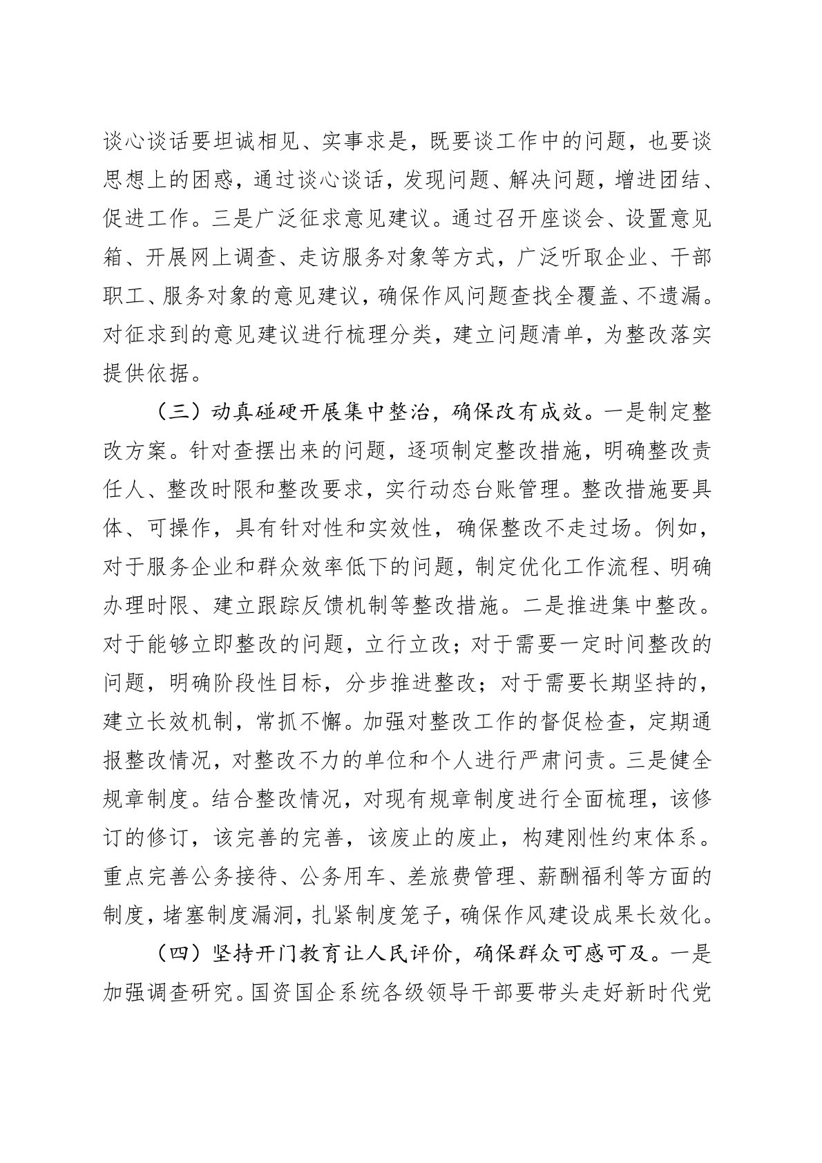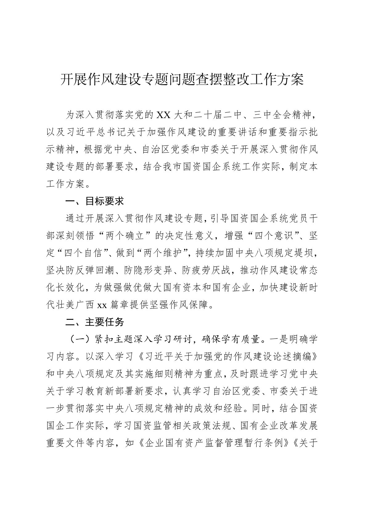 为深入贯彻落实党的XX大和二十届二中、三中全会精神,以及习近平总书记关于加强作风建设的重要讲话和重要指示批示精神,根据党中央、自治区党委和市委关于开展深入贯彻作风建设专题的部署要求,结合我市国资国企系统工作实际,制定本工作方案。一、目标要求通过开展深入贯彻作风建设专题,引导国资国企系统党员干部深刻领悟“两个确立”的决定性意义,增强“四个意识”、坚定“四个自信”、做到“两个维护”,持续加固中央八项规定堤坝,坚决防反弹回潮、防隐形变异、防疲劳厌战,推动作风建设常态化长效化,为做强做优做大国有资本和国有企业,加快建设新时代壮美广西xx篇章提供坚强作风保障。二、主要任务(一)紧扣主题深入学习研讨,确保学有质量。一是明确学习内容。以深入学习《习近平关于加强党的作风建设论述摘编》和中央八项规定及其实施细...