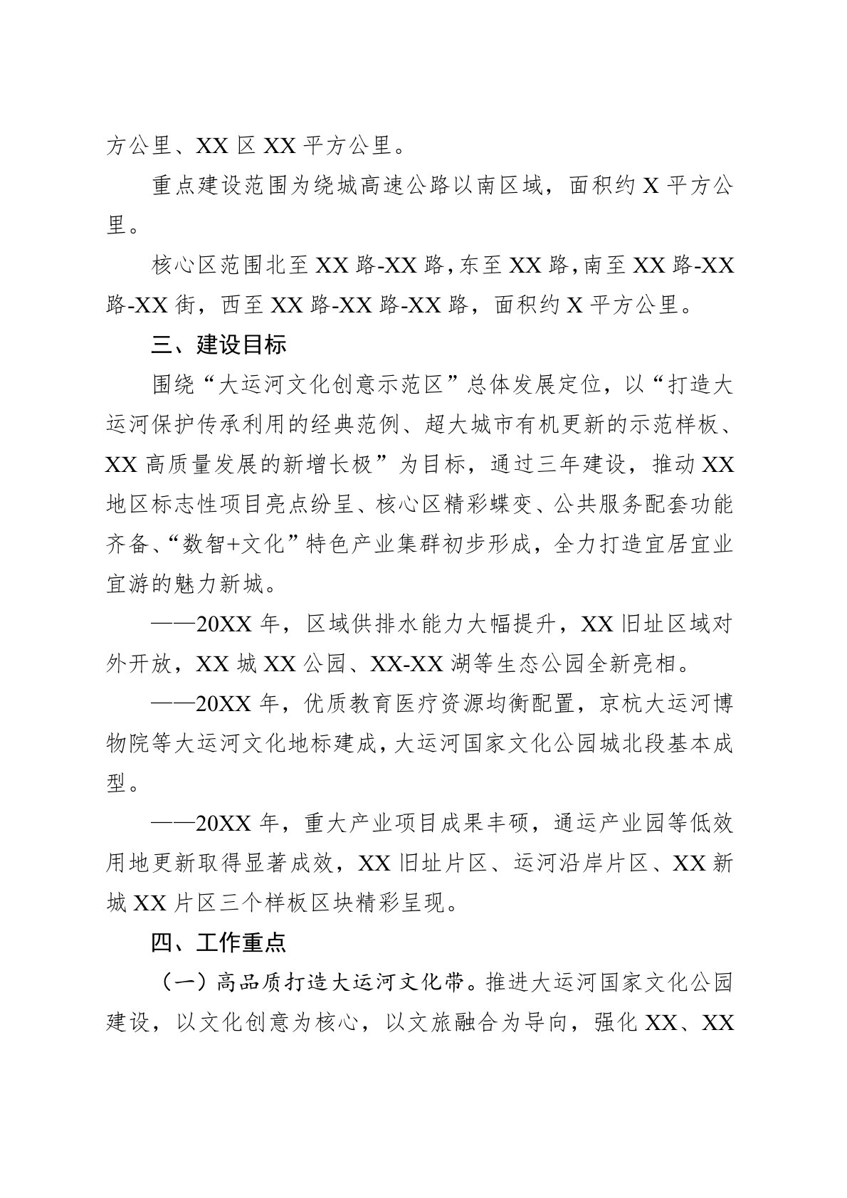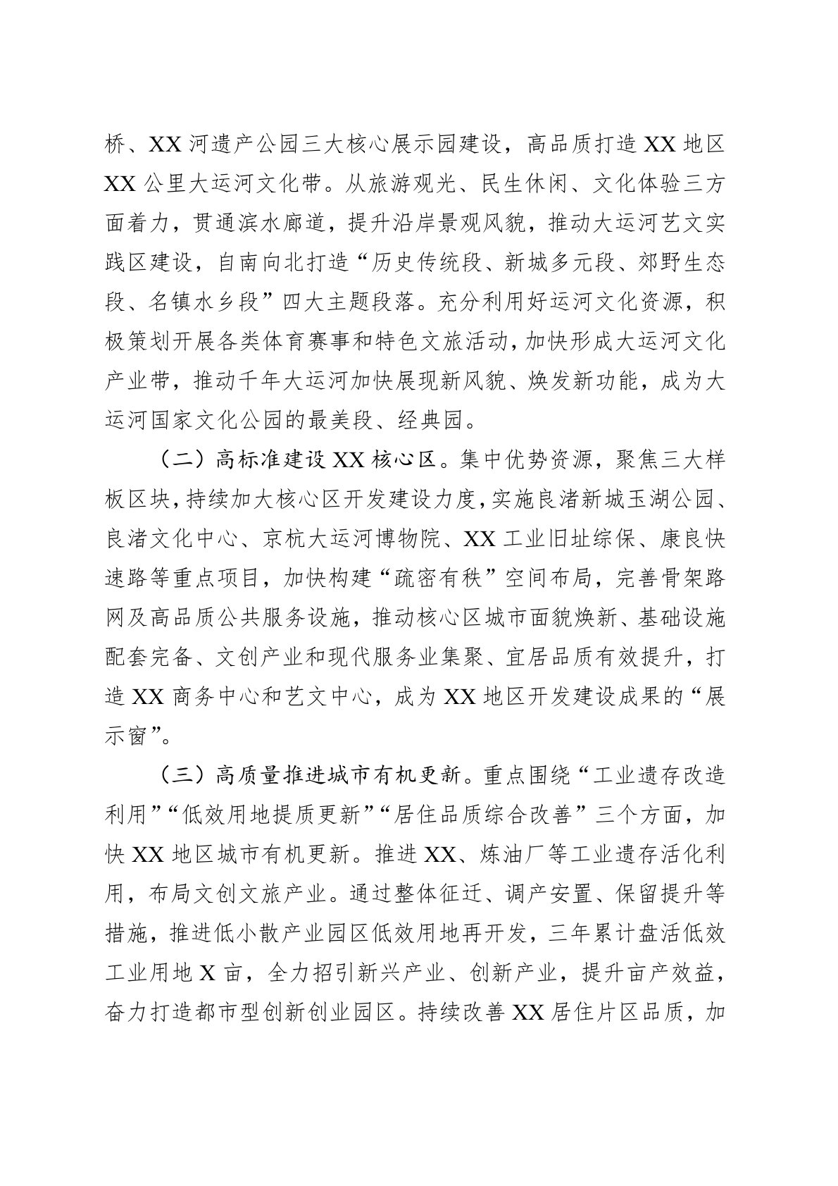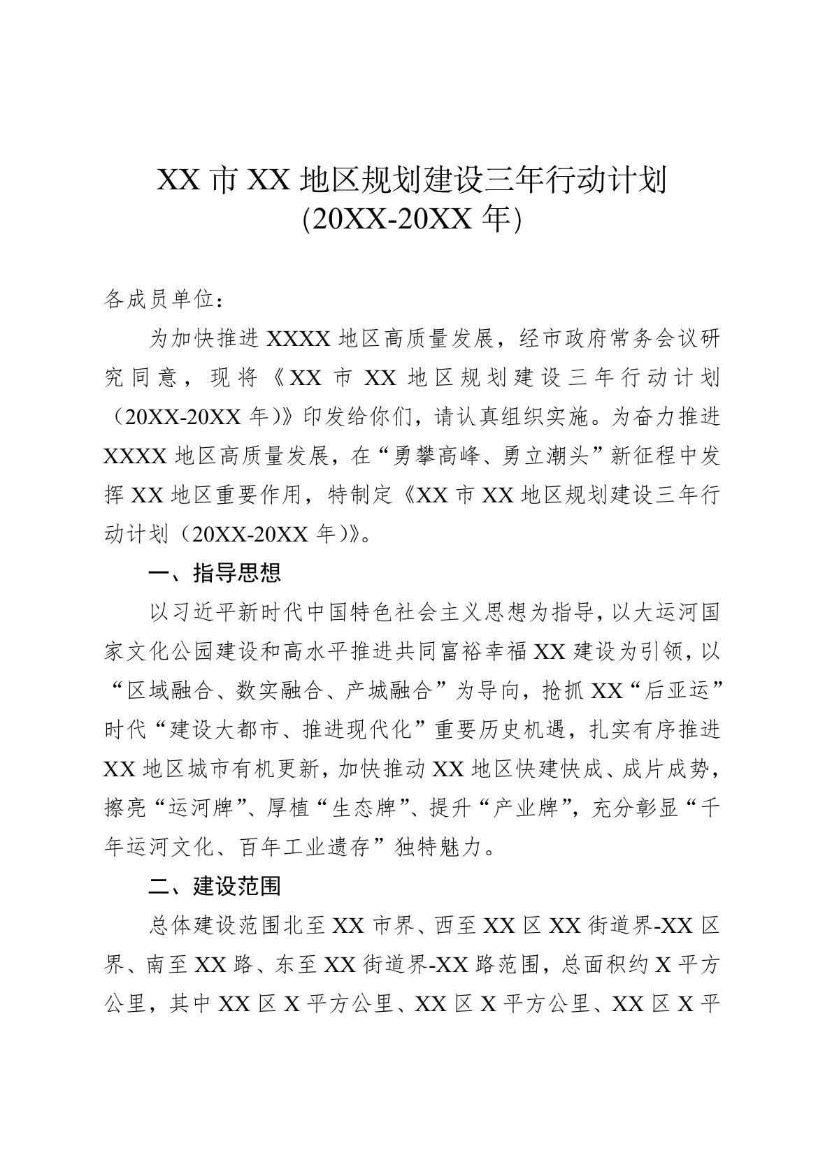 各成员单位:为加快推进XXXX地区高质量发展,经市政府常务会议研究同意,现将《XX市XX地区规划建设三年行动计划(20XX-20XX年)》印发给你们,请认真组织实施。为奋力推进XXXX地区高质量发展,在“勇攀高峰、勇立潮头”新征程中发挥XX地区重要作用,特制定《XX市XX地区规划建设三年行动计划(20XX-20XX年)》。一、指导思想以习近平新时代中国特色社会主义思想为指导,以大运河国家文化公园建设和高水平推进共同富裕幸福XX建设为引领,以“区域融合、数实融合、产城融合”为导向,抢抓XX“后亚运”时代“建设大都市、推进现代化”重要历史机遇,扎实有序推进XX地区城市有机更新,加快推动XX地区快建快成、成片成势,擦亮“运河牌”、厚植“生态牌”、提升“产业牌”,充分彰显“千年运河文化、百年工业遗存...
