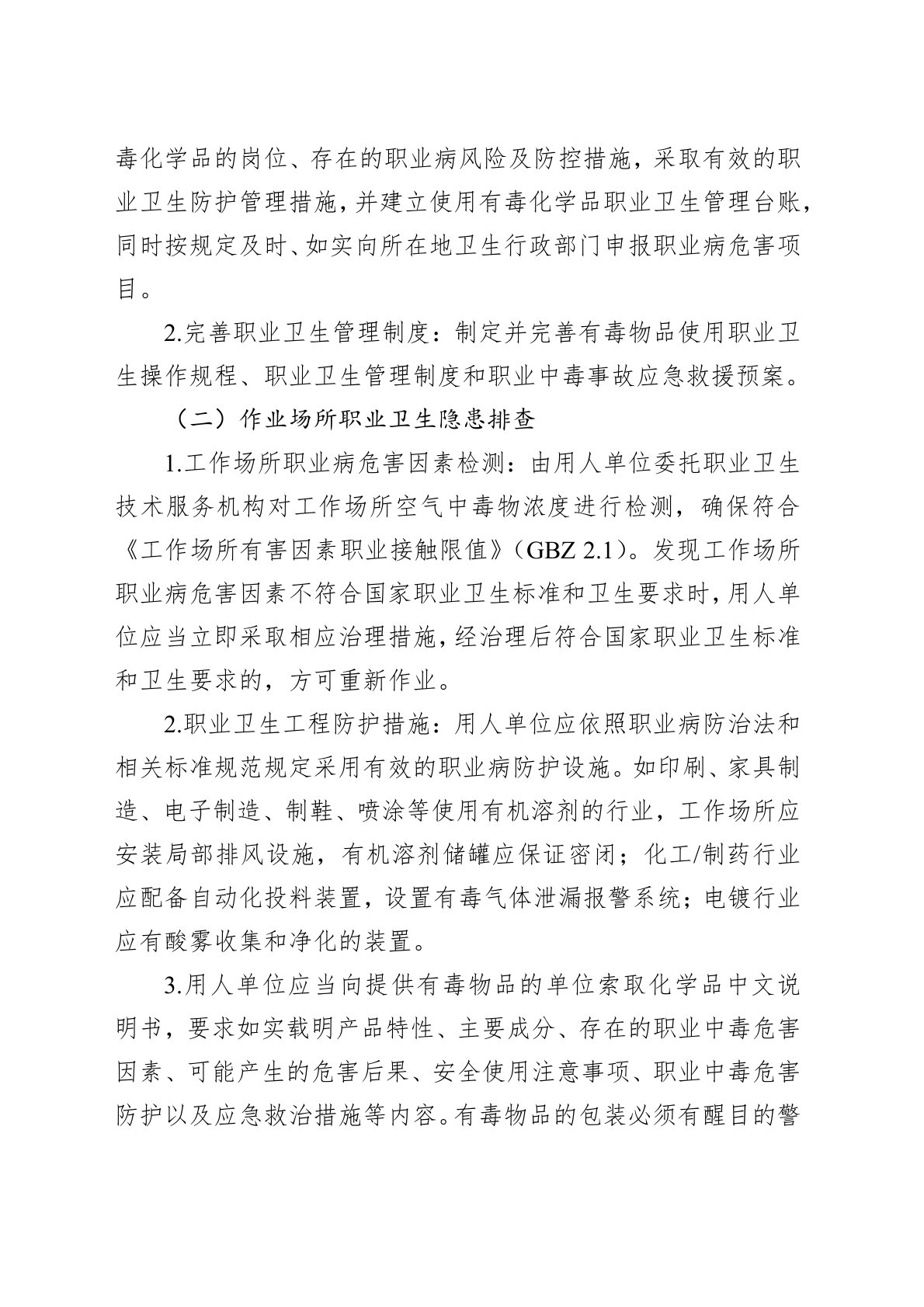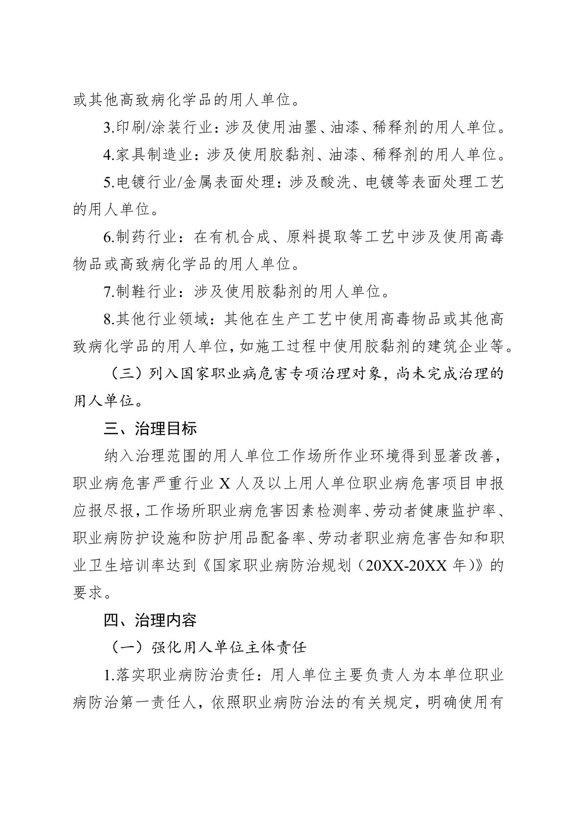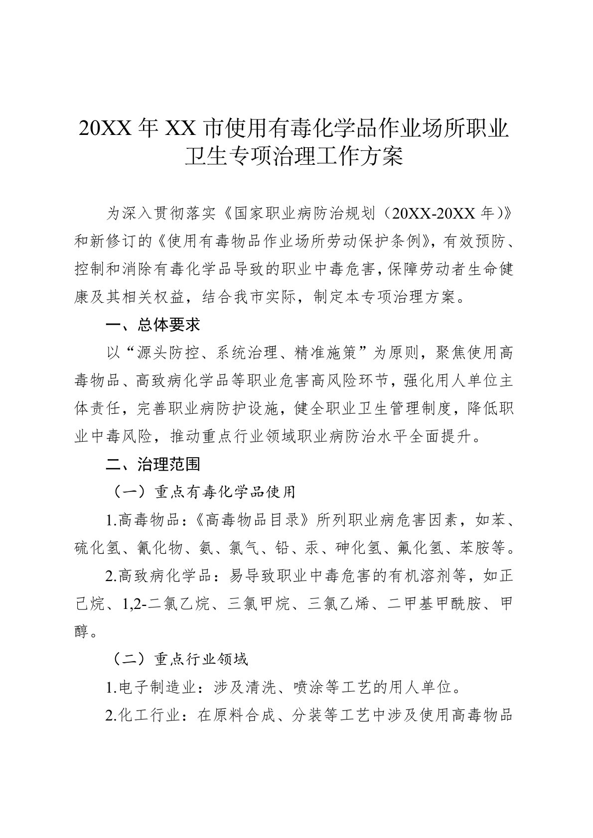 为深入贯彻落实《国家职业病防治规划(20XX-20XX年)》和新修订的《使用有毒物品作业场所劳动保护条例》,有效预防、控制和消除有毒化学品导致的职业中毒危害,保障劳动者生命健康及其相关权益,结合我市实际,制定本专项治理方案。一、总体要求以“源头防控、系统治理、精准施策”为原则,聚焦使用高毒物品、高致病化学品等职业危害高风险环节,强化用人单位主体责任,完善职业病防护设施,健全职业卫生管理制度,降低职业中毒风险,推动重点行业领域职业病防治水平全面提升。二、治理范围(一)重点有毒化学品使用1.高毒物品:《高毒物品目录》所列职业病危害因素,如苯、硫化氢、氰化物、氨、氯气、铅、汞、砷化氢、氟化氢、苯胺等。2.高致病化学品:易导致职业中毒危害的有机溶剂等,如正己烷、1,2-二氯乙烷、三氯甲烷、三氯乙烯、...