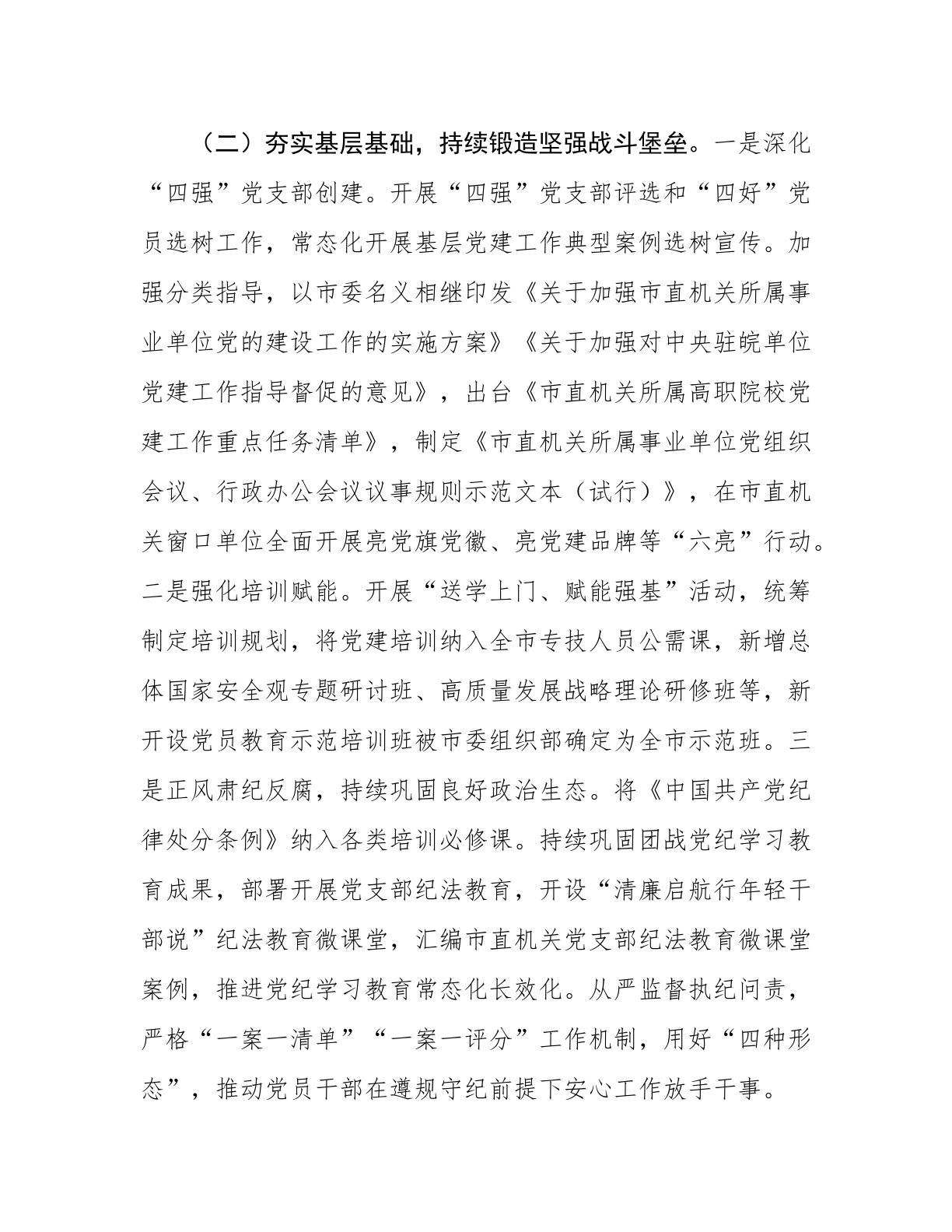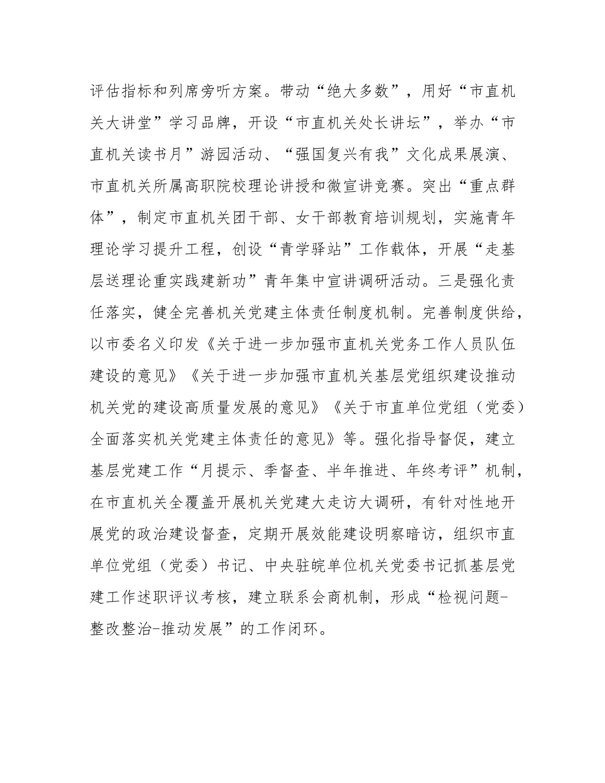 市直机关工委上半年党建工作总结今年以来,市直机关工委坚持以新时代中国特色社会主义思想为指导,深入贯彻新时代党的建设总要求,深刻领会“全面提高机关党建质量”的目标任务和“以高质量党建促进高质量发展”的丰富内涵,强化使命担当,狠抓工作落实,为奋力推进中国式现代化我市实践注入强劲动能。一、主要工作情况(一)强化政治引领,健全机关党建责任体系。一是践行“两个维护”,持续推进模范机关建设。坚持以党的政治建设为统领,持续深化理想信念教育、对党忠诚教育、政治机关意识教育。召开深入学习贯彻总书记“7·9”重要讲话精神暨“两优一先”表彰大会,推出“带头坚持和加强党中央集中统一领导”十佳案例。出台建设模范机关实施意见、创建举措,召开“推进模范机关建设、争当‘三个表率’”经验交流会,评比表彰创建模范机关活动先进单...