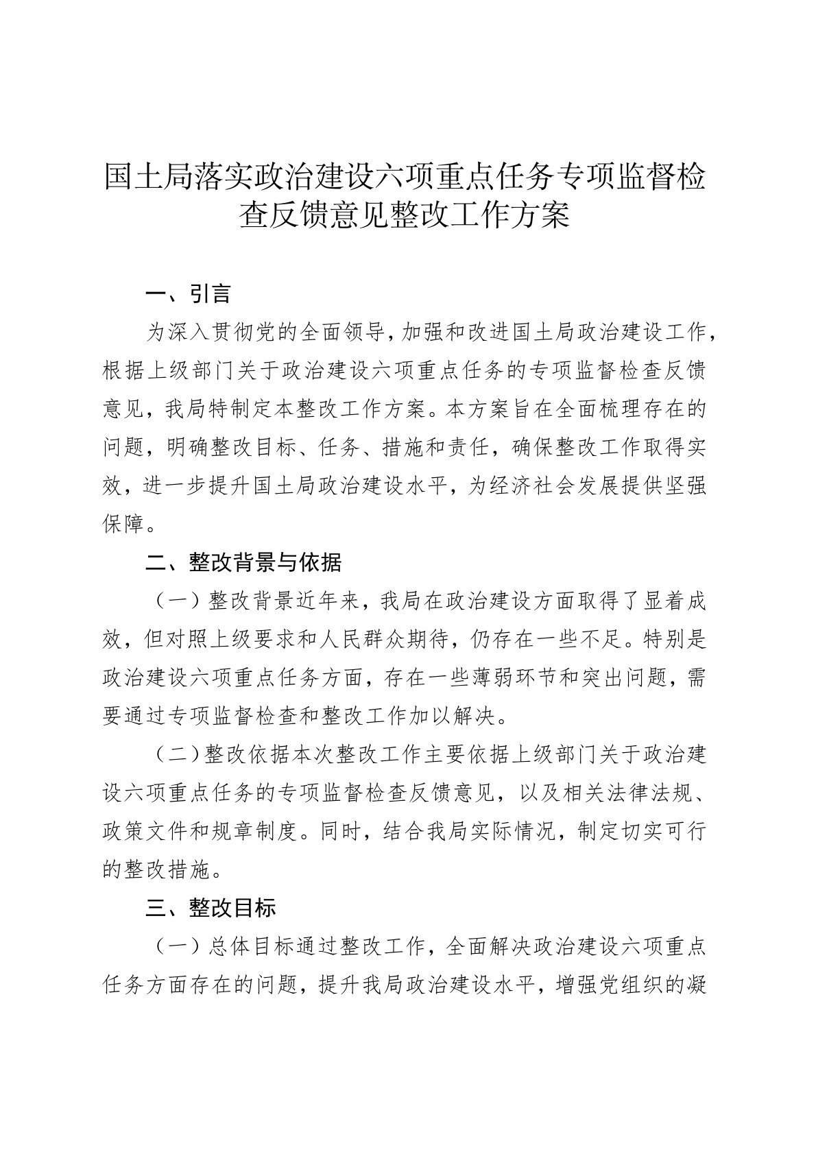 国土局落实政治建设六项重点任务专项监督检查反馈意见整改工作方案