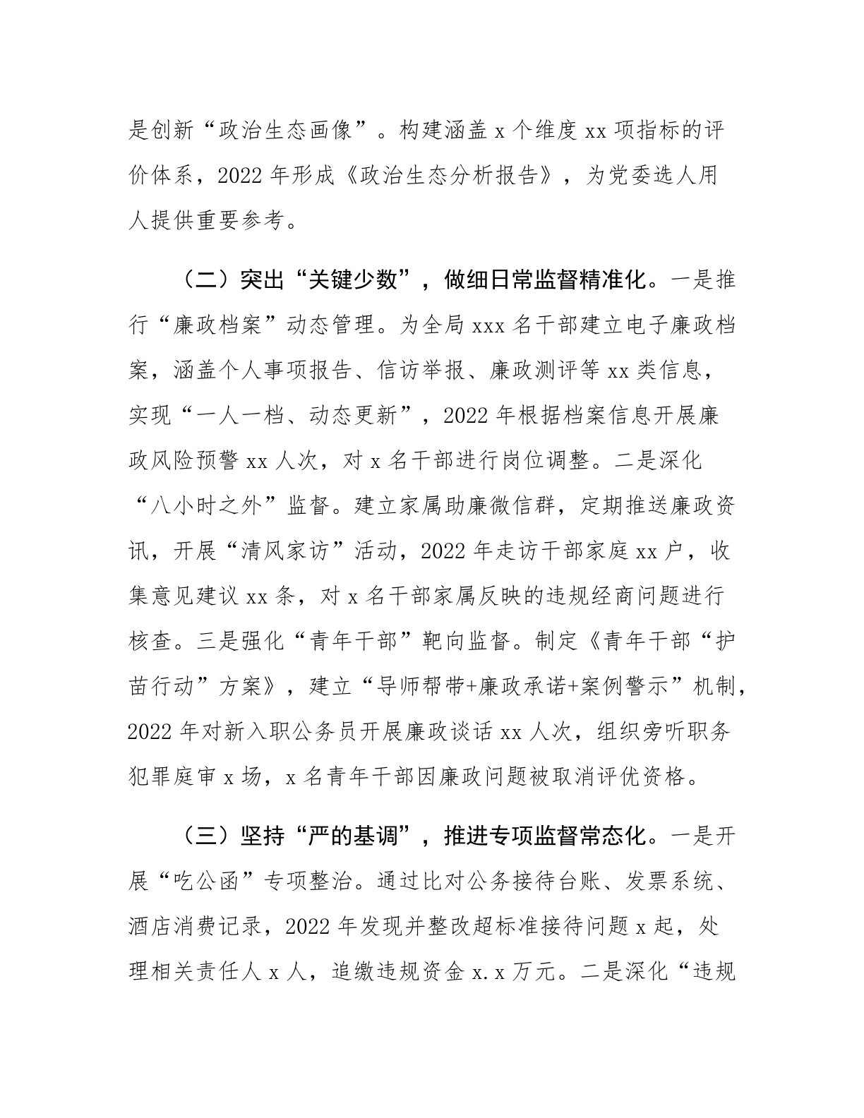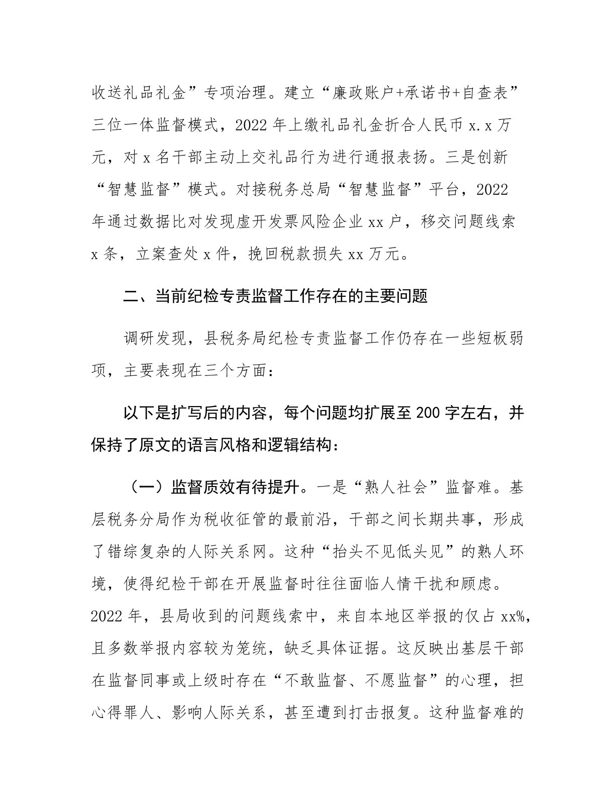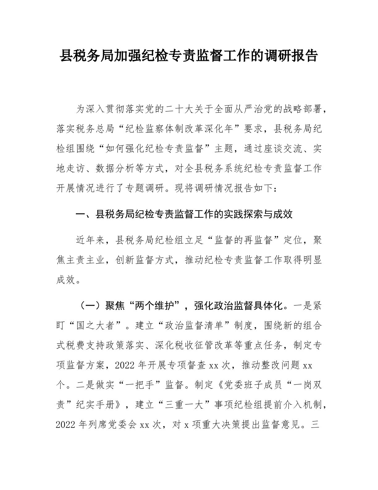 县税务局加强纪检专责监督工作的调研报告为深入贯彻落实党的二十大关于全面从严治党的战略部署,落实税务总局“纪检监察体制改革深化年”要求,县税务局纪检组围绕“如何强化纪检专责监督”主题,通过座谈交流、实地走访、数据分析等方式,对全县税务系统纪检专责监督工作开展情况进行了专题调研。现将调研情况报告如下:一、县税务局纪检专责监督工作的实践探索与成效近年来,县税务局纪检组立足“监督的再监督”定位,聚焦主责主业,创新监督方式,推动纪检专责监督工作取得明显成效。(一)聚焦“两个维护”,强化政治监督具体化。一是紧盯“国之大者”。建立“政治监督清单”制度,围绕新的组合式税费支持政策落实、深化税收征管改革等重点任务,制定专项监督方案,2022年开展专项督查xx次,推动整改问题xx个。二是做实“一把手”监督。制定...