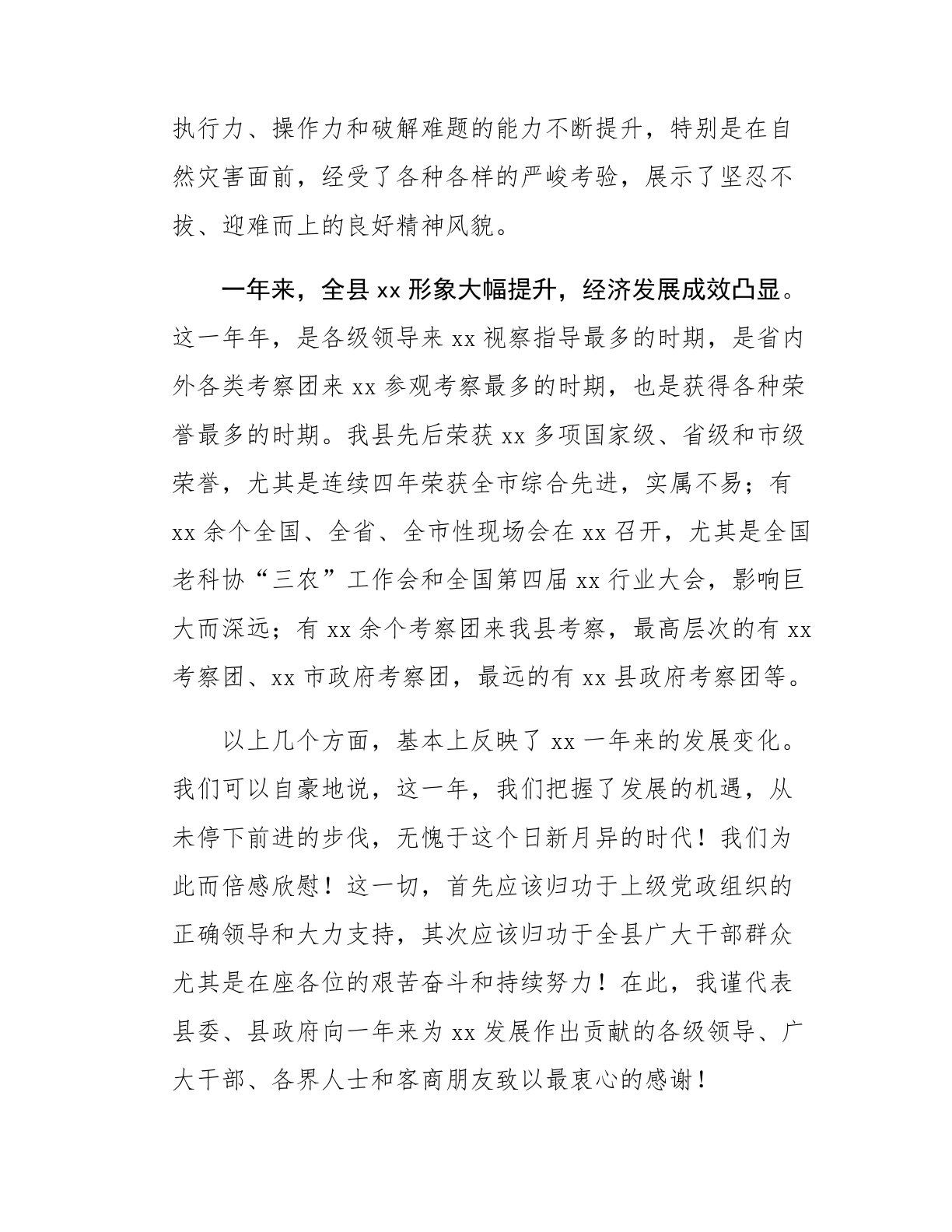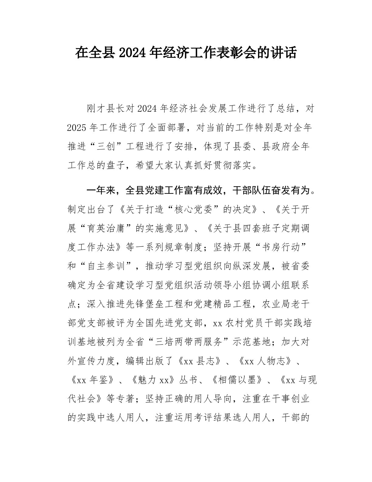 在全县2024年经济工作表彰会的讲话刚才县长对2024年经济社会发展工作进行了总结,对2025年工作进行了全面部署,对当前的工作特别是对全年推进“三创”工程进行了安排,体现了县委、县政府全年工作总的盘子,希望大家认真抓好贯彻落实。一年来,全县党建工作富有成效,干部队伍奋发有为。制定出台了《关于打造“核心党委”的决定》、《关于开展“育英治庸”的实施意见》、《关于县四套班子定期调度工作办法》等一系列规章制度;坚持开展“书房行动”和“自主参训”,推动学习型党组织向纵深发展,被省委确定为全省建设学习型党组织活动领导小组协调小组联系点;深入推进先锋堡垒工程和党建精品工程,农业局老干部党支部被评为全国先进党支部,xx农村党员干部实践培训基地被列为全省“三培两带两服务”示范基地;加大对外宣传力度,编辑出版...
