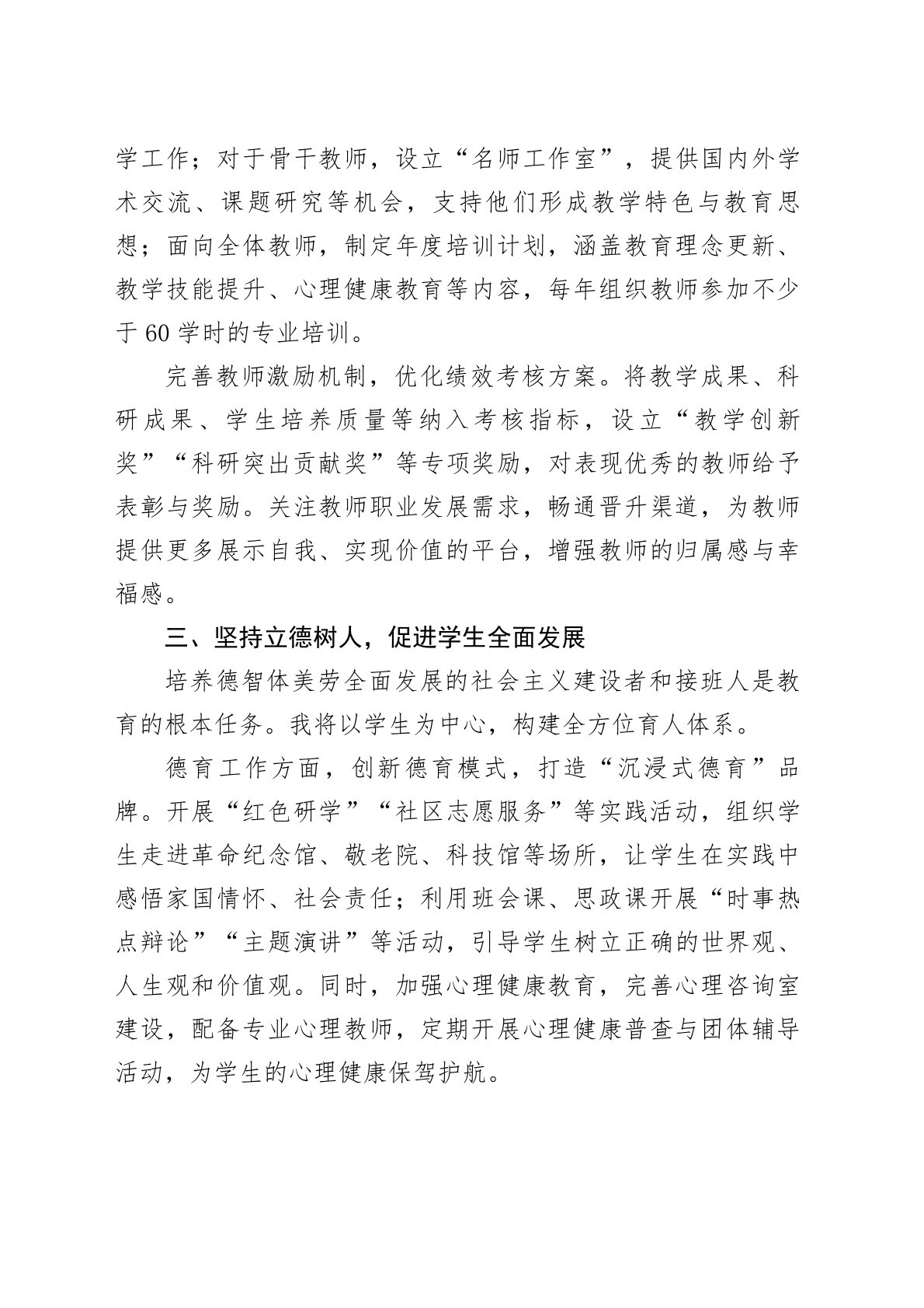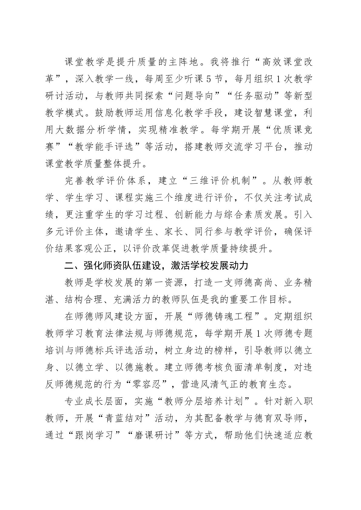 新聘学校校长任职表态发言尊敬的各位领导、全体教职员工:大家好!今天,站在这里接过校长这一重任,我内心满是感恩与敬畏。感谢组织的信任与培养,感谢各位领导一直以来对学校发展的关心与支持,更感谢全体教职员工为学校建设付出的辛勤汗水。这份任命不仅是一份荣誉,更是一份沉甸甸的责任。我深知,学校过往取得的成绩来之不易,未来的发展任重道远。在此,我郑重表态,将全身心投入工作,与大家携手推动学校迈向新高度,现将具体工作方向汇报如下:一、聚焦教学质量提升,筑牢学校发展根基教育教学质量是学校生存与发展的核心命脉。我将从课程、课堂、评价三个维度发力,构建高质量教学体系。在课程建设上,实施“课程优化工程”。一方面,严格落实国家课程标准,确保基础学科教学的扎实性;另一方面,结合学校实际与学生需求,开发特色校本课程。计...
