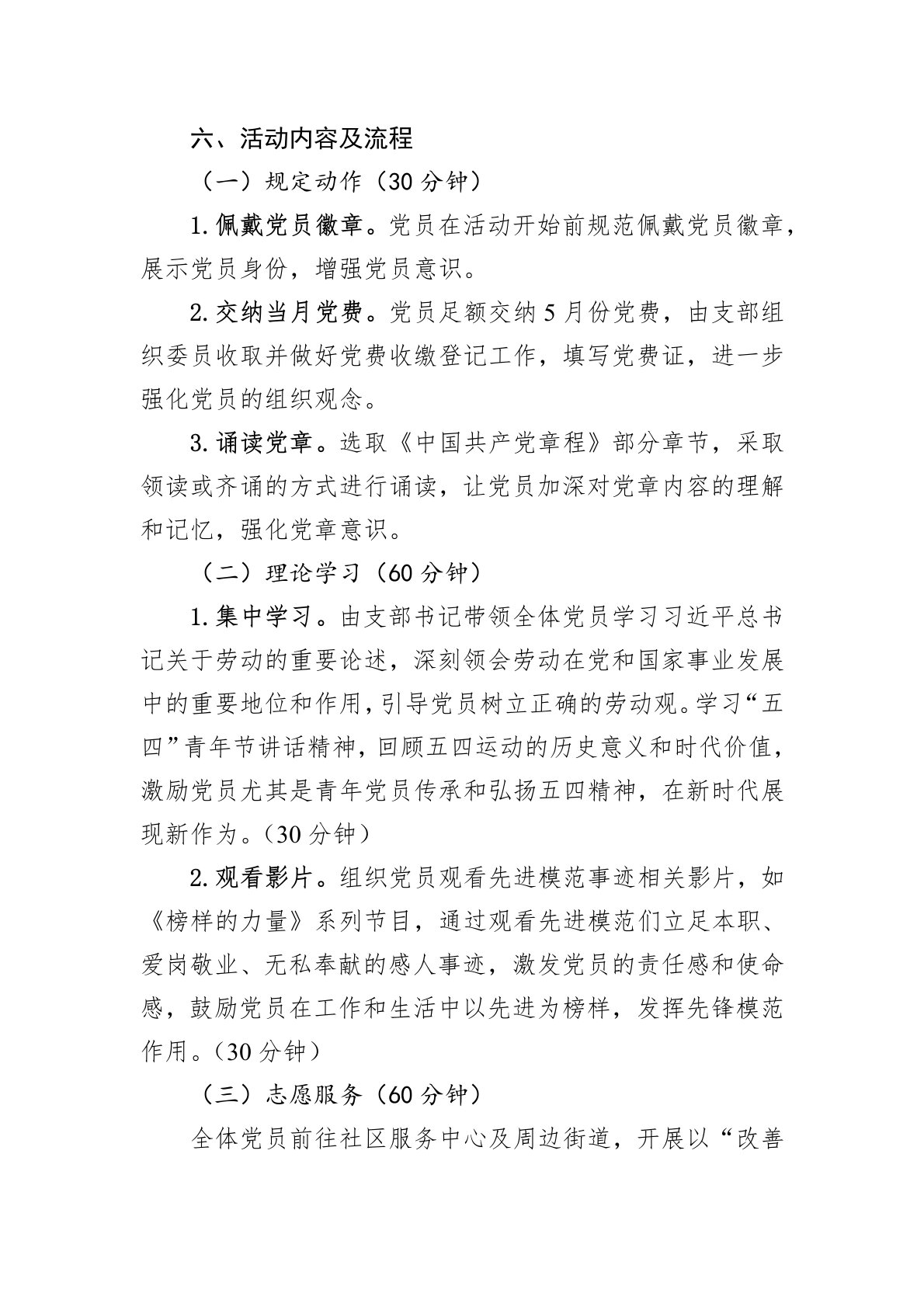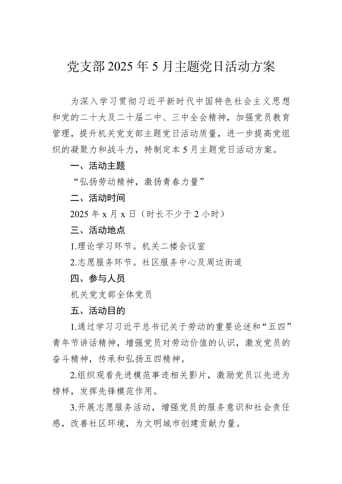 为深入学习贯彻习近平新时代中国特色社会主义思想和党的二十大及二十届二中、三中全会精神,加强党员教育管理,提升机关党支部主题党日活动质量,进一步提高党组织的凝聚力和战斗力,特制定本5月主题党日活动方案。一、活动主题“弘扬劳动精神,激扬青春力量”二、活动时间2025年x月x日(时长不少于2小时)三、活动地点1.理论学习环节。机关二楼会议室2.志愿服务环节。社区服务中心及周边街道四、参与人员机关党支部全体党员五、活动目的1.通过学习习近平总书记关于劳动的重要论述和“五四”青年节讲话精神,增强党员对劳动价值的认识,激发党员的奋斗精神,传承和弘扬五四精神。2.组织观看先进模范事迹相关影片,激励党员以先进为榜样,发挥先锋模范作用。3.开展志愿服务活动,增强党员的服务意识和社会责任感,改善社区环境,为文明...