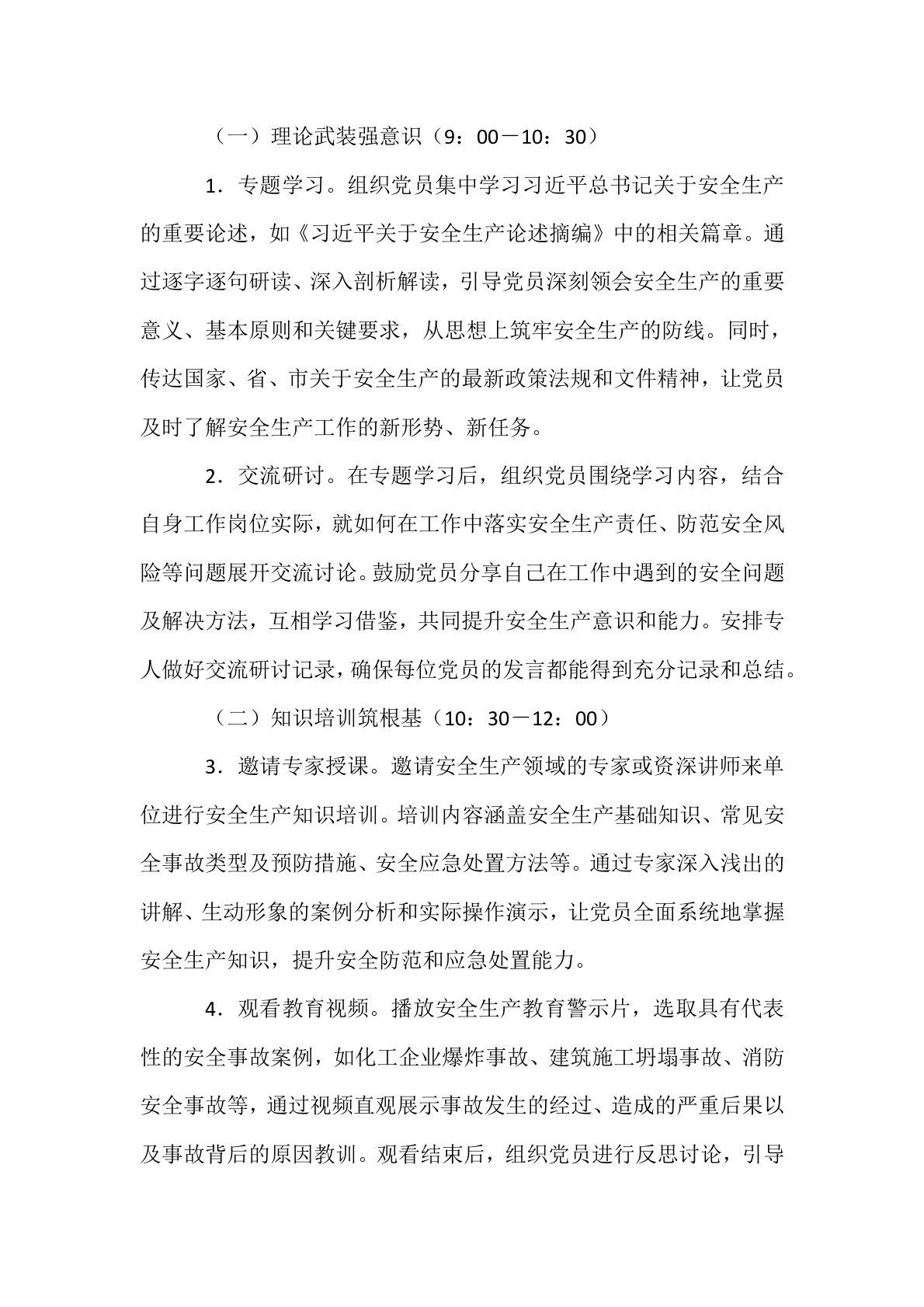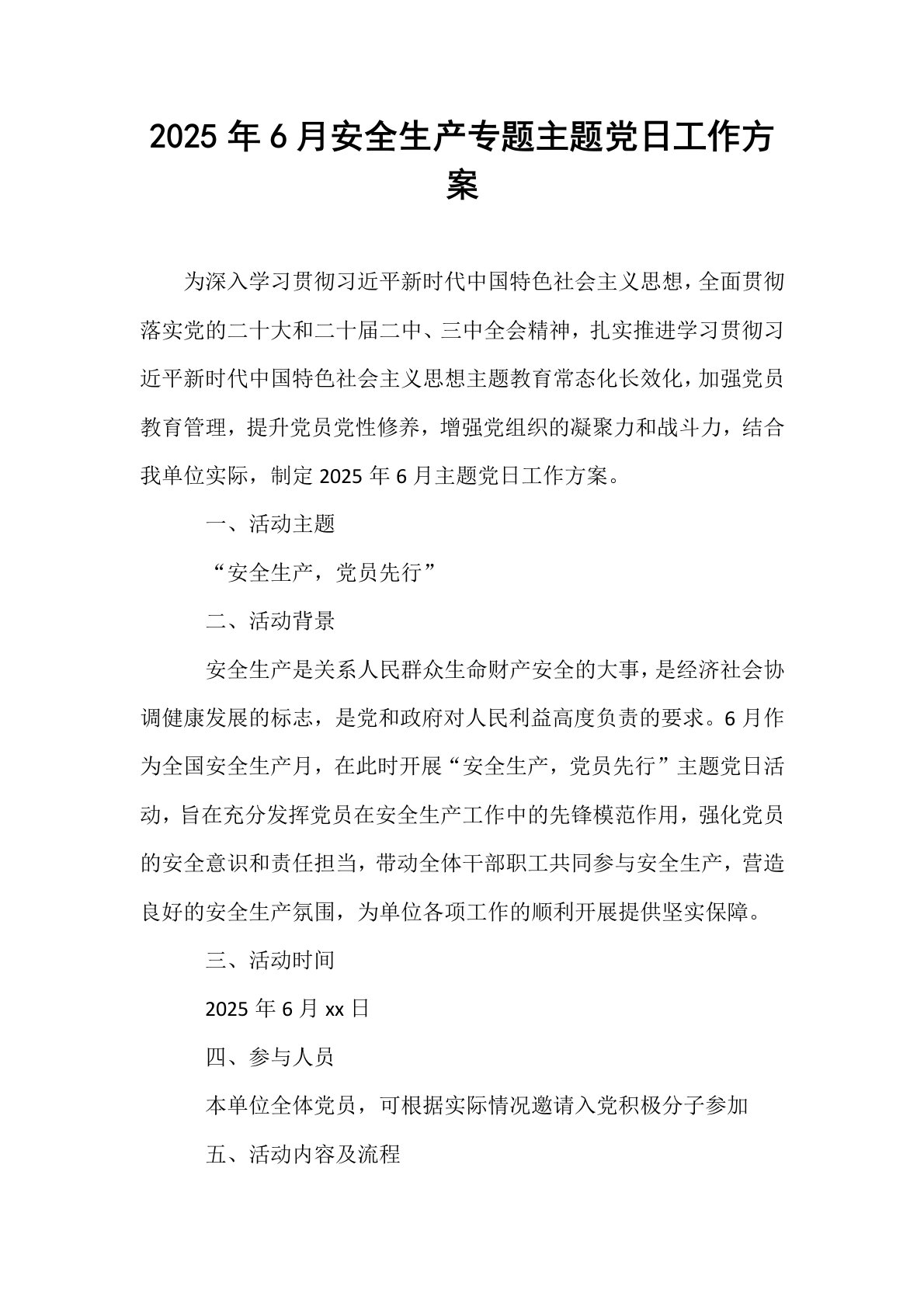 2025年6月安全生产专题主题党日工作方案为深入学习贯彻习近平新时代中国特色社会主义思想,全面贯彻落实党的二十大和二十届二中、三中全会精神,扎实推进学习贯彻习近平新时代中国特色社会主义思想主题教育常态化长效化,加强党员教育管理,提升党员党性修养,增强党组织的凝聚力和战斗力,结合我单位实际,制定2025年6月主题党日工作方案。一、活动主题“安全生产,党员先行”二、活动背景安全生产是关系人民群众生命财产安全的大事,是经济社会协调健康发展的标志,是党和政府对人民利益高度负责的要求。6月作为全国安全生产月,在此时开展“安全生产,党员先行”主题党日活动,旨在充分发挥党员在安全生产工作中的先锋模范作用,强化党员的安全意识和责任担当,带动全体干部职工共同参与安全生产,营造良好的安全生产氛围,为单位各项工作...