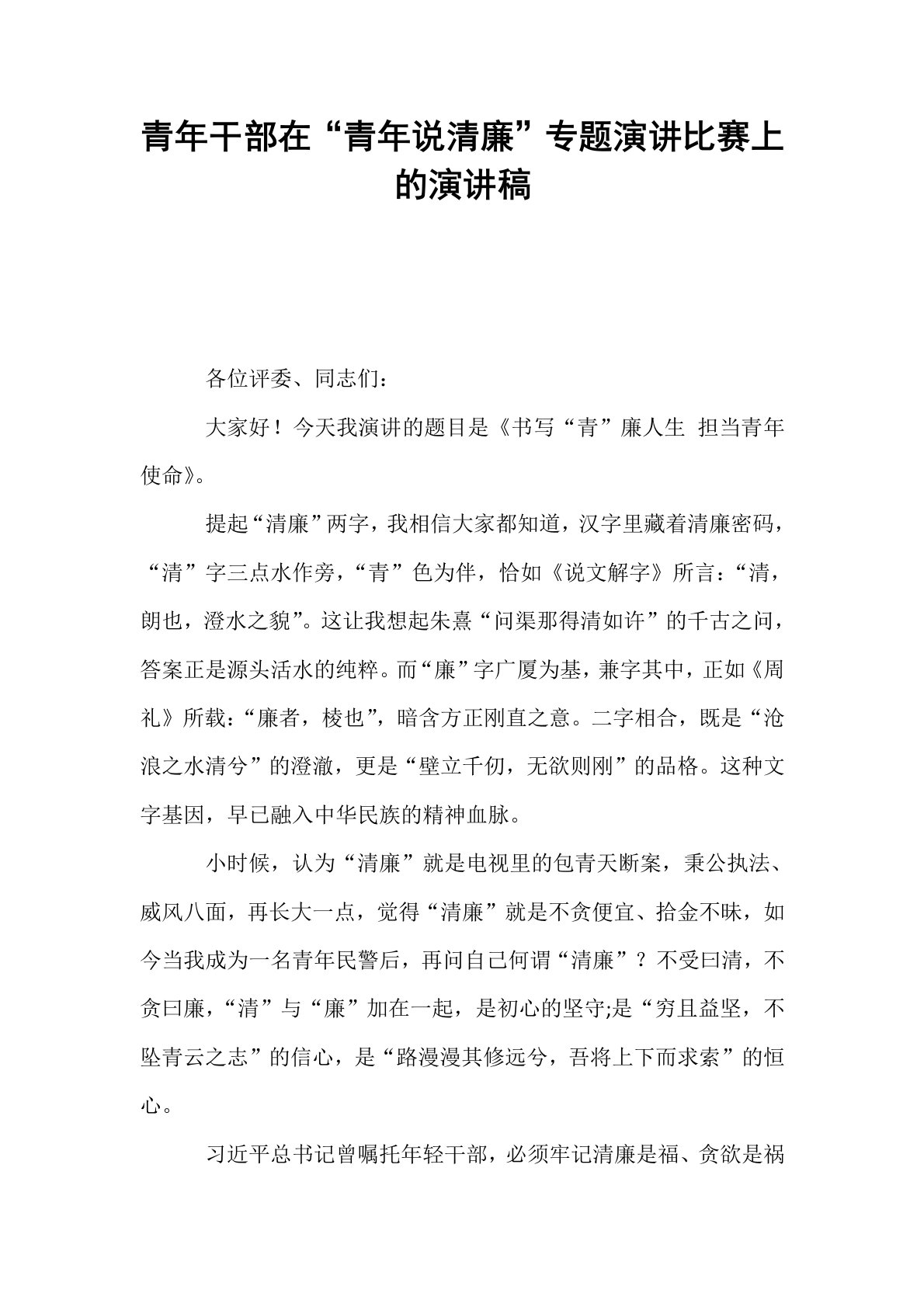 青年干部在“青年说清廉”专题演讲比赛上的演讲稿各位评委、同志们:大家好!今天我演讲的题目是《书写“青”廉人生担当青年使命》。提起“清廉”两字,我相信大家都知道,汉字里藏着清廉密码,“清”字三点水作旁,“青”色为伴,恰如《说文解字》所言:“清,朗也,澄水之貌”。这让我想起朱熹“问渠那得清如许”的千古之问,答案正是源头活水的纯粹。而“廉”字广厦为基,兼字其中,正如《周礼》所载:“廉者,棱也”,暗含方正刚直之意。二字相合,既是“沧浪之水清兮”的澄澈,更是“壁立千仞,无欲则刚”的品格。这种文字基因,早已融入中华民族的精神血脉。小时候,认为“清廉”就是电视里的包青天断案,秉公执法、威风八面,再长大一点,觉得“清廉”就是不贪便宜、拾金不昧,如今当我成为一名青年民警后,再问自己何谓“清廉”?不受曰清,不贪...