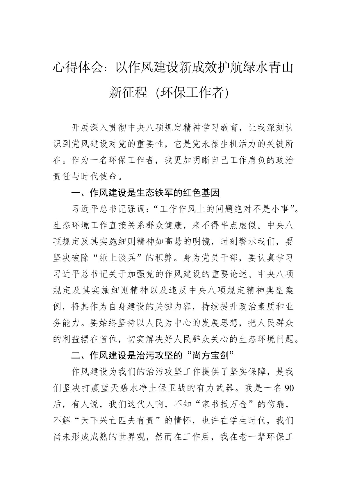 开展深入贯彻中央八项规定精神学习教育,让我深刻认识到党风建设对党的重要性,它是党永葆生机活力的关键所在。作为一名环保工作者,我更加明晰自己工作肩负的政治责任与时代使命。一、作风建设是生态铁军的红色基因习近平总书记强调:“工作作风上的问题绝对不是小事”。生态环境工作直接关系群众健康,来不得半点虚假。中央八项规定及其实施细则精神如高悬的明镜,时刻警示我们,要坚决破除“纸上谈兵”的积弊。身为党员干部,要认真学习习近平总书记关于加强党的作风建设的重要论述、中央八项规定及其实施细则精神以及违反中央八项规定精神典型案例,将其作为自身建设的关键内容,持续提升政治素质和业务能力。要始终坚持以人民为中心的发展思想,把人民群众的利益摆在首位,切实解决好人民群众关心的生态环境问题。二、作风建设是治污攻坚的“尚方宝...