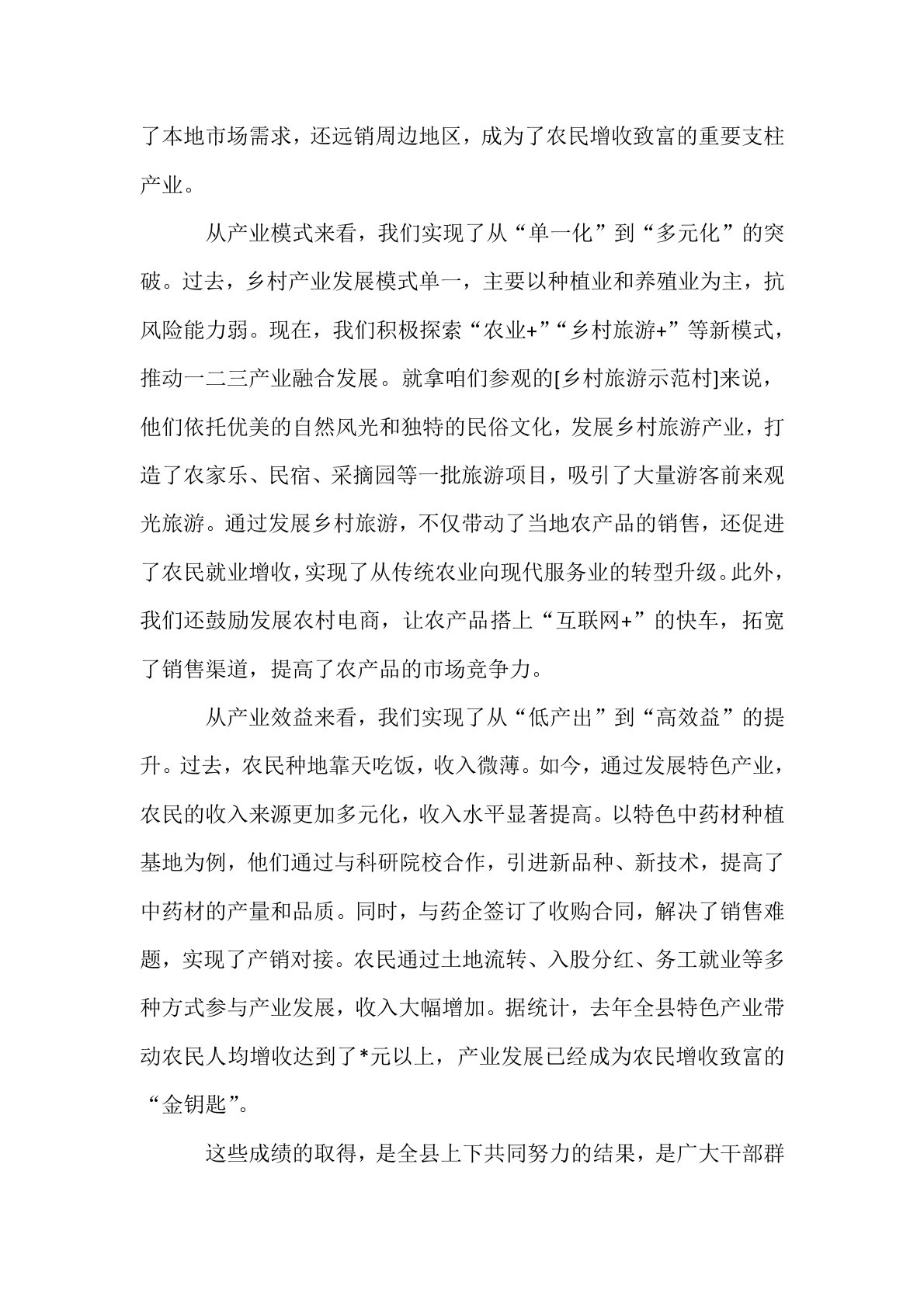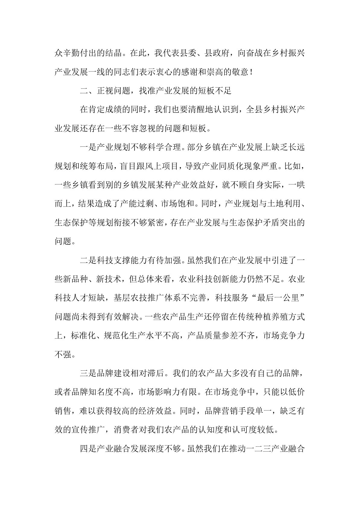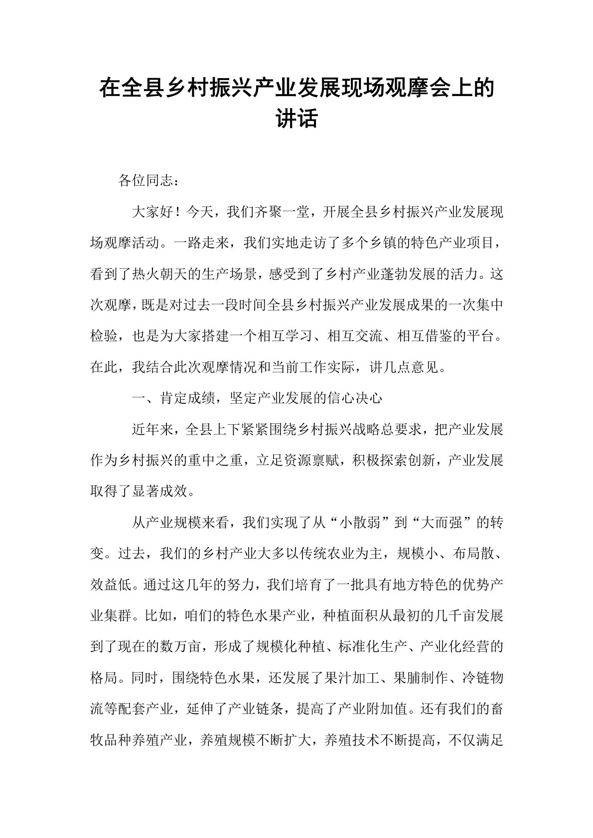 在全县乡村振兴产业发展现场观摩会上的讲话各位同志:大家好!今天,我们齐聚一堂,开展全县乡村振兴产业发展现场观摩活动。一路走来,我们实地走访了多个乡镇的特色产业项目,看到了热火朝天的生产场景,感受到了乡村产业蓬勃发展的活力。这次观摩,既是对过去一段时间全县乡村振兴产业发展成果的一次集中检验,也是为大家搭建一个相互学习、相互交流、相互借鉴的平台。在此,我结合此次观摩情况和当前工作实际,讲几点意见。一、肯定成绩,坚定产业发展的信心决心近年来,全县上下紧紧围绕乡村振兴战略总要求,把产业发展作为乡村振兴的重中之重,立足资源禀赋,积极探索创新,产业发展取得了显著成效。从产业规模来看,我们实现了从“小散弱”到“大而强”的转变。过去,我们的乡村产业大多以传统农业为主,规模小、布局散、效益低。通过这几年的努力...
