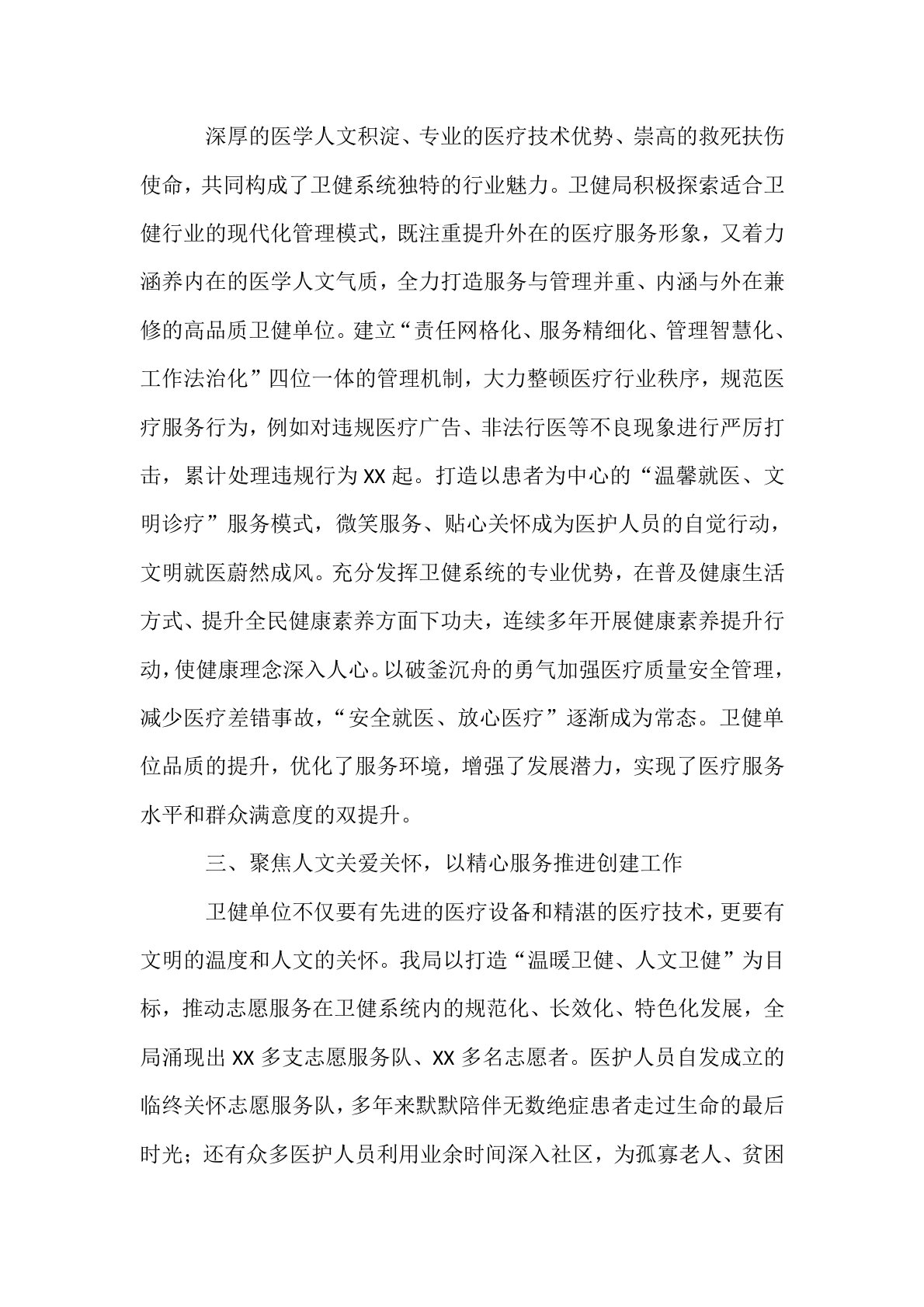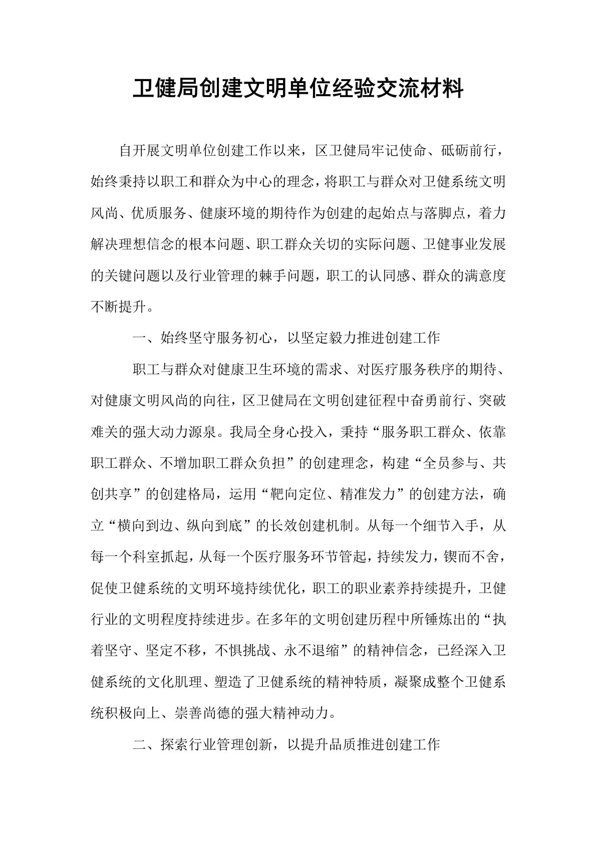卫健局创建文明单位经验交流材料自开展文明单位创建工作以来,区卫健局牢记使命、砥砺前行,始终秉持以职工和群众为中心的理念,将职工与群众对卫健系统文明风尚、优质服务、健康环境的期待作为创建的起始点与落脚点,着力解决理想信念的根本问题、职工群众关切的实际问题、卫健事业发展的关键问题以及行业管理的棘手问题,职工的认同感、群众的满意度不断提升。一、始终坚守服务初心,以坚定毅力推进创建工作职工与群众对健康卫生环境的需求、对医疗服务秩序的期待、对健康文明风尚的向往,区卫健局在文明创建征程中奋勇前行、突破难关的强大动力源泉。我局全身心投入,秉持“服务职工群众、依靠职工群众、不增加职工群众负担”的创建理念,构建“全员参与、共创共享”的创建格局,运用“靶向定位、精准发力”的创建方法,确立“横向到边、纵向到底”的...