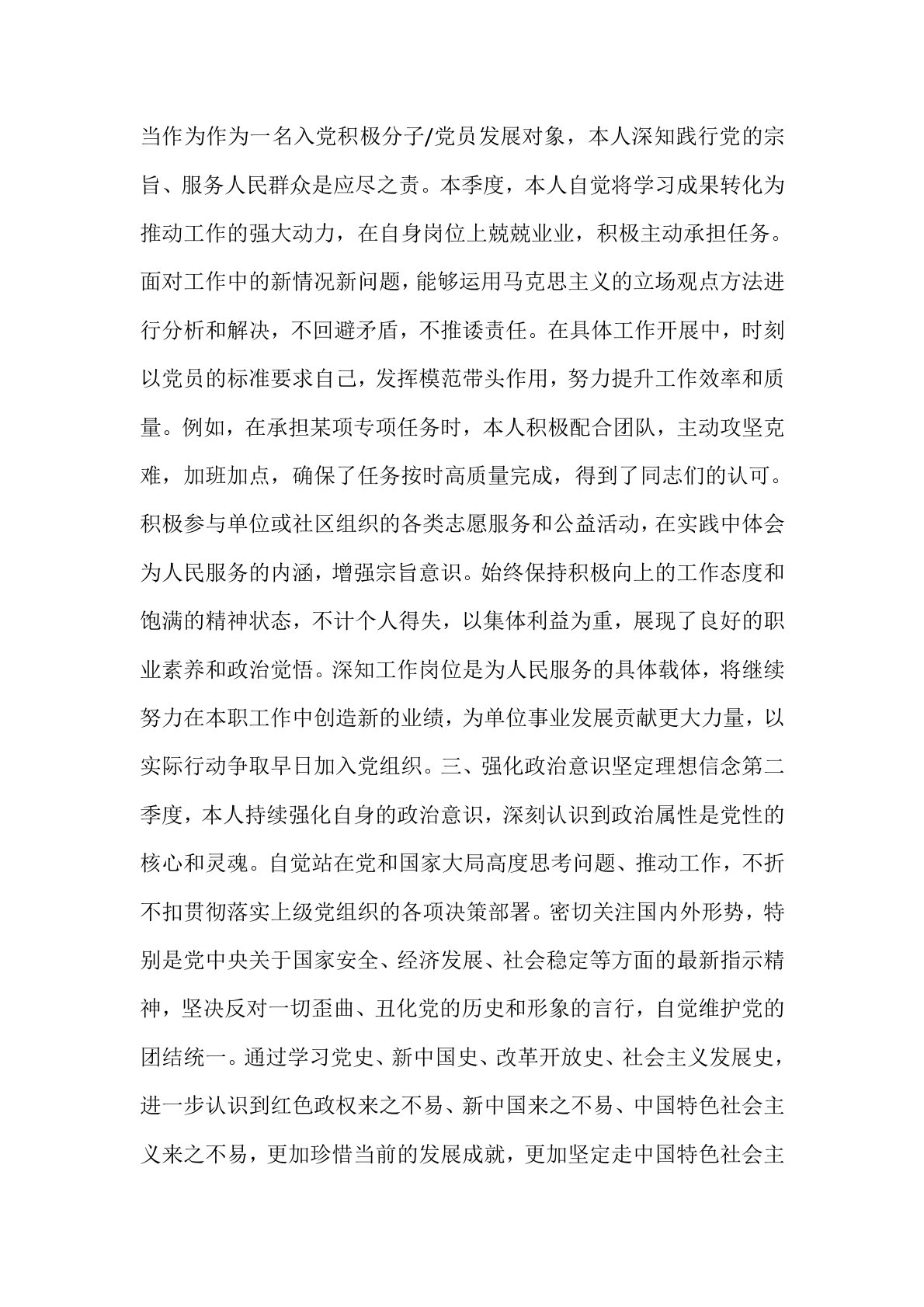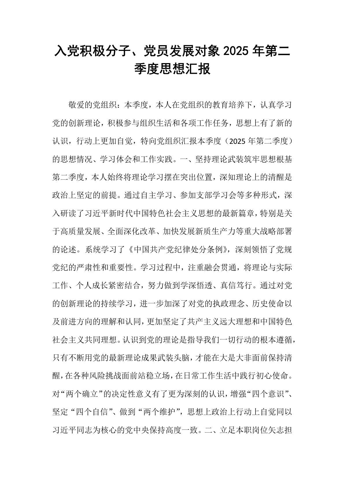 入党积极分子、党员发展对象2025年第二季度思想汇报敬爱的党组织:本季度,本人在党组织的教育培养下,认真学习党的创新理论,积极参与组织生活和各项工作任务,思想上有了新的认识,行动上更加自觉,特向党组织汇报本季度(2025年第二季度)的思想情况、学习体会和工作实践。一、坚持理论武装筑牢思想根基第二季度,本人始终将理论学习摆在突出位置,深知理论上的清醒是政治上坚定的前提。通过自主学习、参加支部学习会等多种形式,深入研读了习近平新时代中国特色社会主义思想的最新篇章,特别是关于高质量发展、全面深化改革、加快发展新质生产力等重大战略部署的论述。系统学习了《中国共产党纪律处分条例》,深刻领悟了党规党纪的严肃性和重要性。学习过程中,注重融会贯通,将理论与实际工作、个人成长紧密结合,努力做到学深悟透、真信笃...