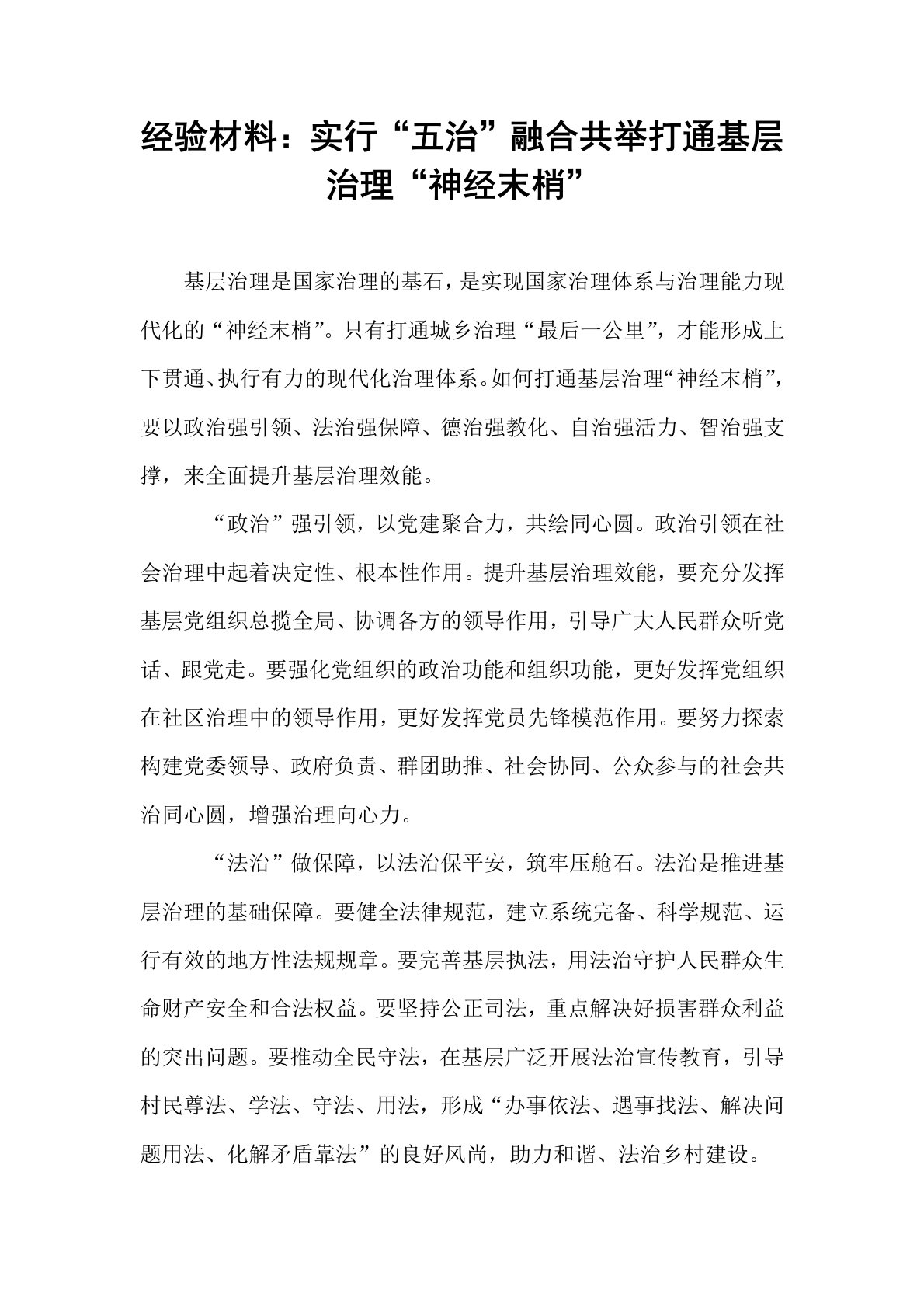 经验材料:实行“五治”融合共举打通基层治理“神经末梢”基层治理是国家治理的基石,是实现国家治理体系与治理能力现代化的“神经末梢”。只有打通城乡治理“最后一公里”,才能形成上下贯通、执行有力的现代化治理体系。如何打通基层治理“神经末梢”,要以政治强引领、法治强保障、德治强教化、自治强活力、智治强支撑,来全面提升基层治理效能。“政治”强引领,以党建聚合力,共绘同心圆。政治引领在社会治理中起着决定性、根本性作用。提升基层治理效能,要充分发挥基层党组织总揽全局、协调各方的领导作用,引导广大人民群众听党话、跟党走。要强化党组织的政治功能和组织功能,更好发挥党组织在社区治理中的领导作用,更好发挥党员先锋模范作用。要努力探索构建党委领导、政府负责、群团助推、社会协同、公众参与的社会共治同心圆,增强治理向心...
