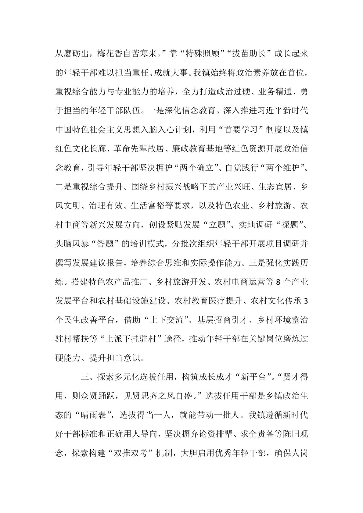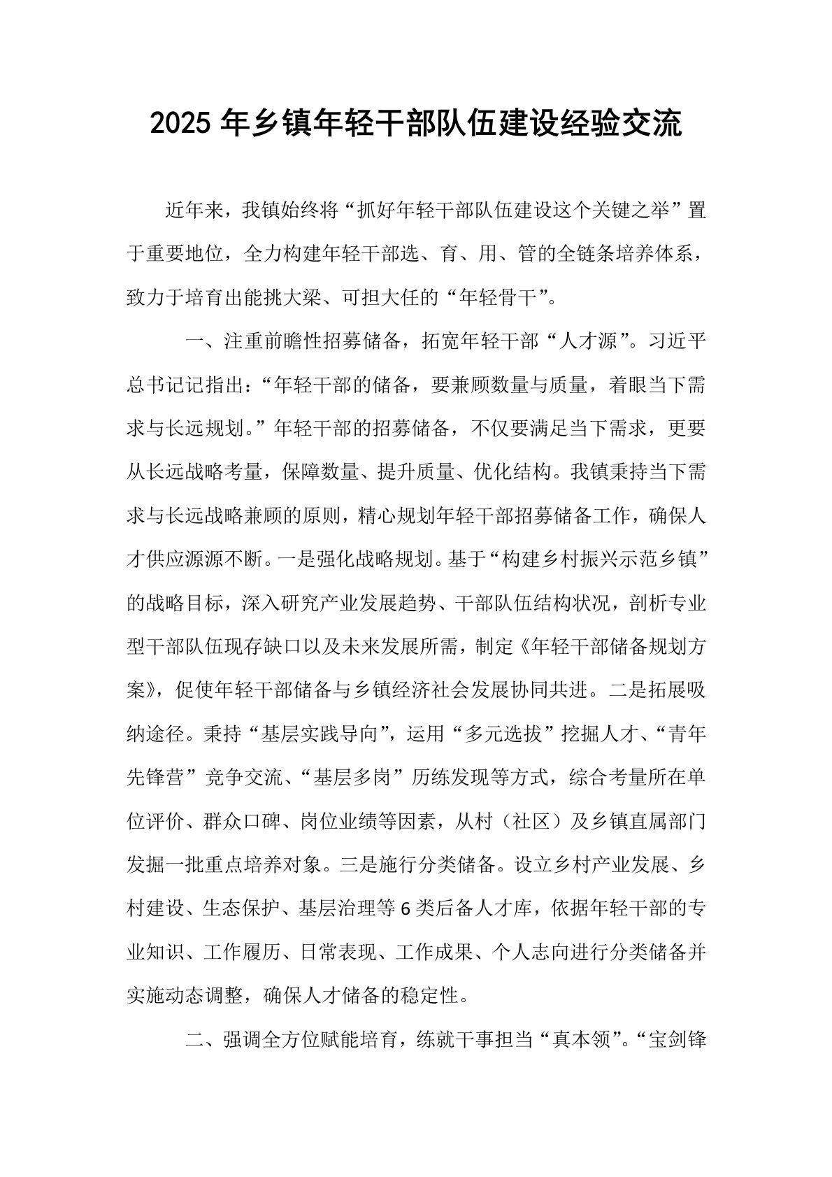 2025年乡镇年轻干部队伍建设经验交流近年来,我镇始终将“抓好年轻干部队伍建设这个关键之举”置于重要地位,全力构建年轻干部选、育、用、管的全链条培养体系,致力于培育出能挑大梁、可担大任的“年轻骨干”。一、注重前瞻性招募储备,拓宽年轻干部“人才源”。习近平总书记记指出:“年轻干部的储备,要兼顾数量与质量,着眼当下需求与长远规划。”年轻干部的招募储备,不仅要满足当下需求,更要从长远战略考量,保障数量、提升质量、优化结构。我镇秉持当下需求与长远战略兼顾的原则,精心规划年轻干部招募储备工作,确保人才供应源源不断。一是强化战略规划。基于“构建乡村振兴示范乡镇”的战略目标,深入研究产业发展趋势、干部队伍结构状况,剖析专业型干部队伍现存缺口以及未来发展所需,制定《年轻干部储备规划方案》,促使年轻干部储备与...