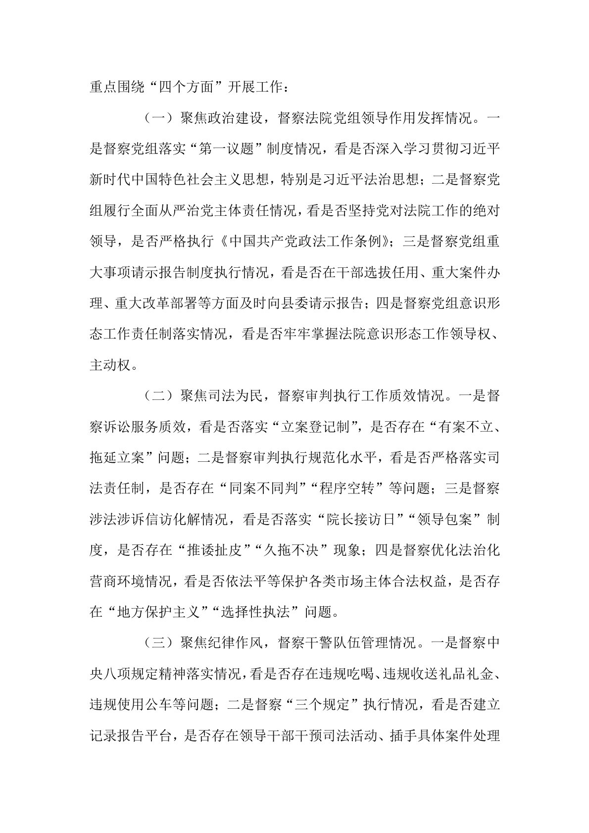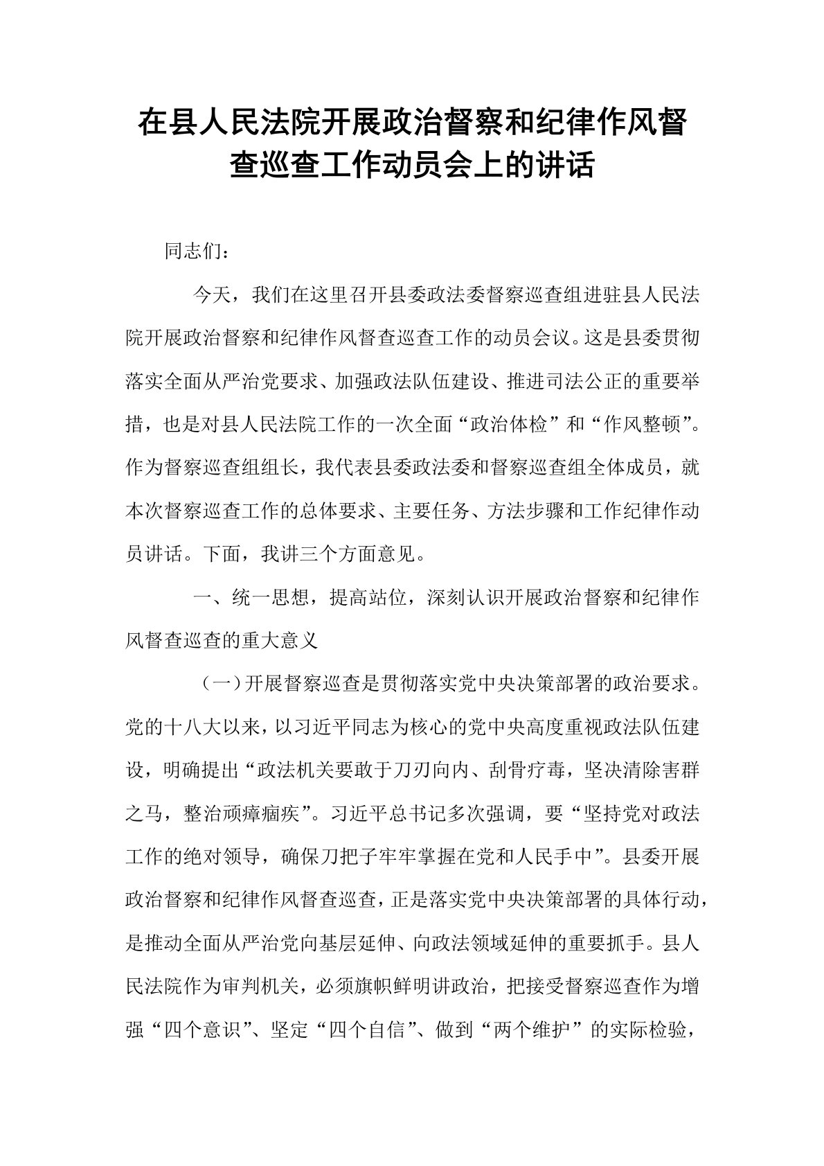 在县人民法院开展政治督察和纪律作风督查巡查工作动员会上的讲话同志们:今天,我们在这里召开县委政法委督察巡查组进驻县人民法院开展政治督察和纪律作风督查巡查工作的动员会议。这是县委贯彻落实全面从严治党要求、加强政法队伍建设、推进司法公正的重要举措,也是对县人民法院工作的一次全面“政治体检”和“作风整顿”。作为督察巡查组组长,我代表县委政法委和督察巡查组全体成员,就本次督察巡查工作的总体要求、主要任务、方法步骤和工作纪律作动员讲话。下面,我讲三个方面意见。一、统一思想,提高站位,深刻认识开展政治督察和纪律作风督查巡查的重大意义(一)开展督察巡查是贯彻落实党中央决策部署的政治要求。党的十八大以来,以习近平同志为核心的党中央高度重视政法队伍建设,明确提出“政法机关要敢于刀刃向内、刮骨疗毒,坚决清除害群...