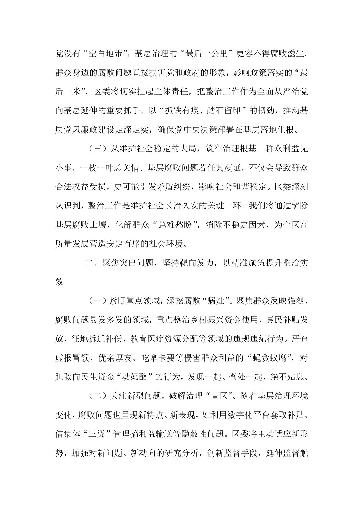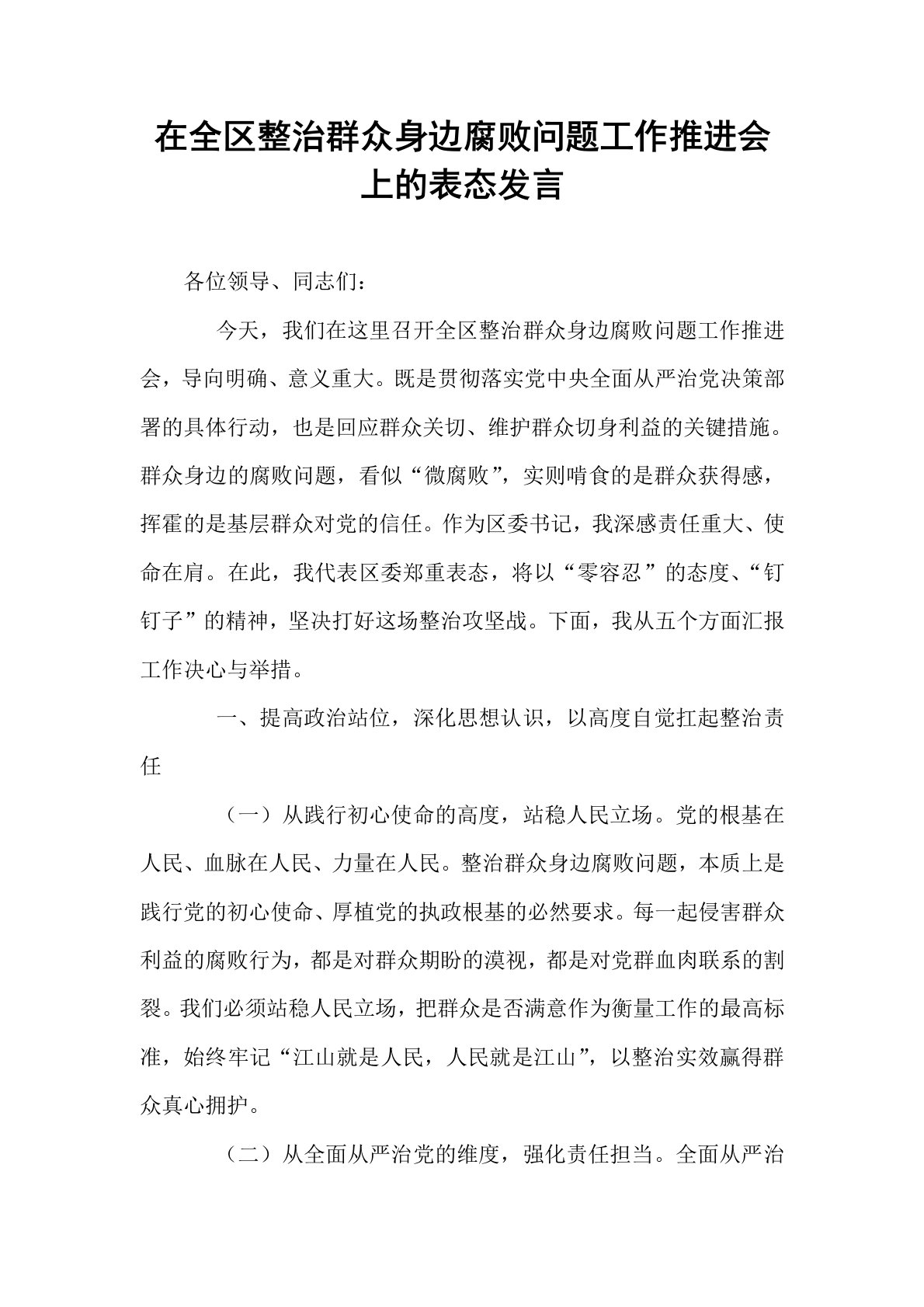 在全区整治群众身边腐败问题工作推进会上的表态发言各位领导、同志们:今天,我们在这里召开全区整治群众身边腐败问题工作推进会,导向明确、意义重大。既是贯彻落实党中央全面从严治党决策部署的具体行动,也是回应群众关切、维护群众切身利益的关键措施。群众身边的腐败问题,看似“微腐败”,实则啃食的是群众获得感,挥霍的是基层群众对党的信任。作为区委书记,我深感责任重大、使命在肩。在此,我代表区委郑重表态,将以“零容忍”的态度、“钉钉子”的精神,坚决打好这场整治攻坚战。下面,我从五个方面汇报工作决心与举措。一、提高政治站位,深化思想认识,以高度自觉扛起整治责任(一)从践行初心使命的高度,站稳人民立场。党的根基在人民、血脉在人民、力量在人民。整治群众身边腐败问题,本质上是践行党的初心使命、厚植党的执政根基的必然...