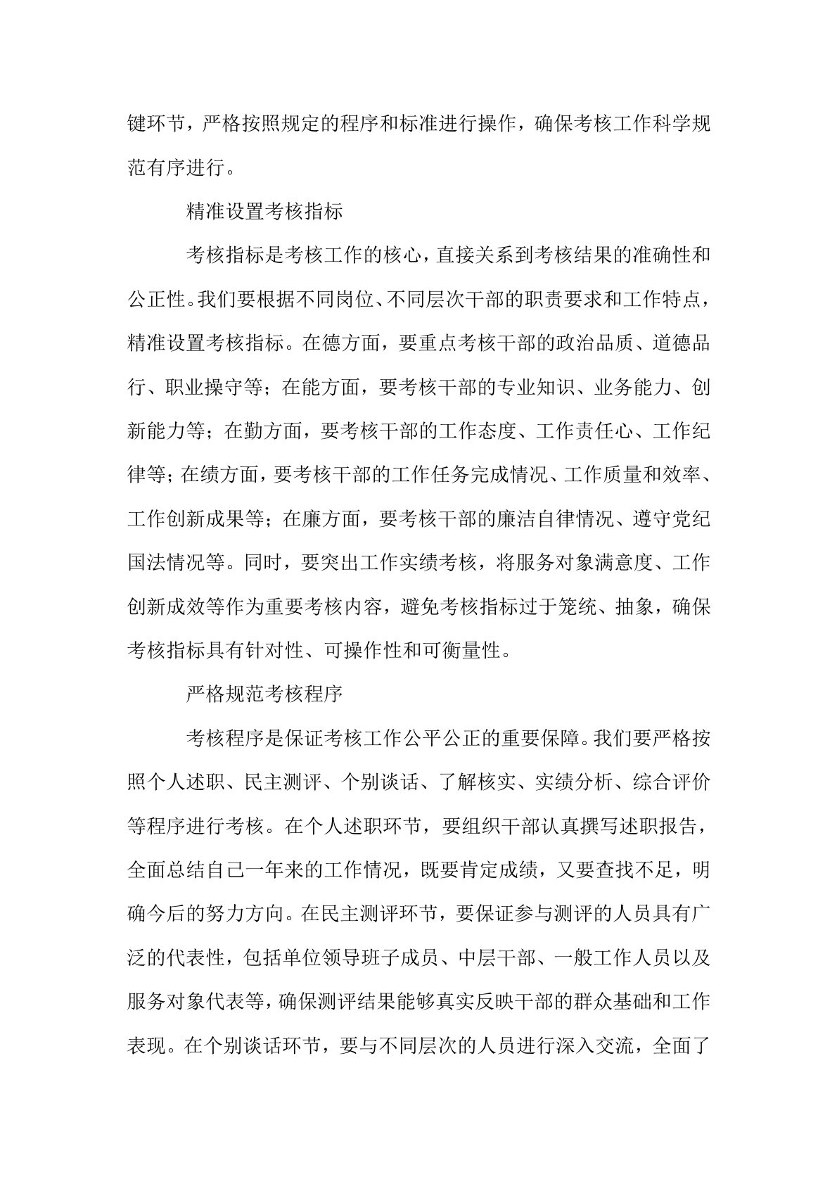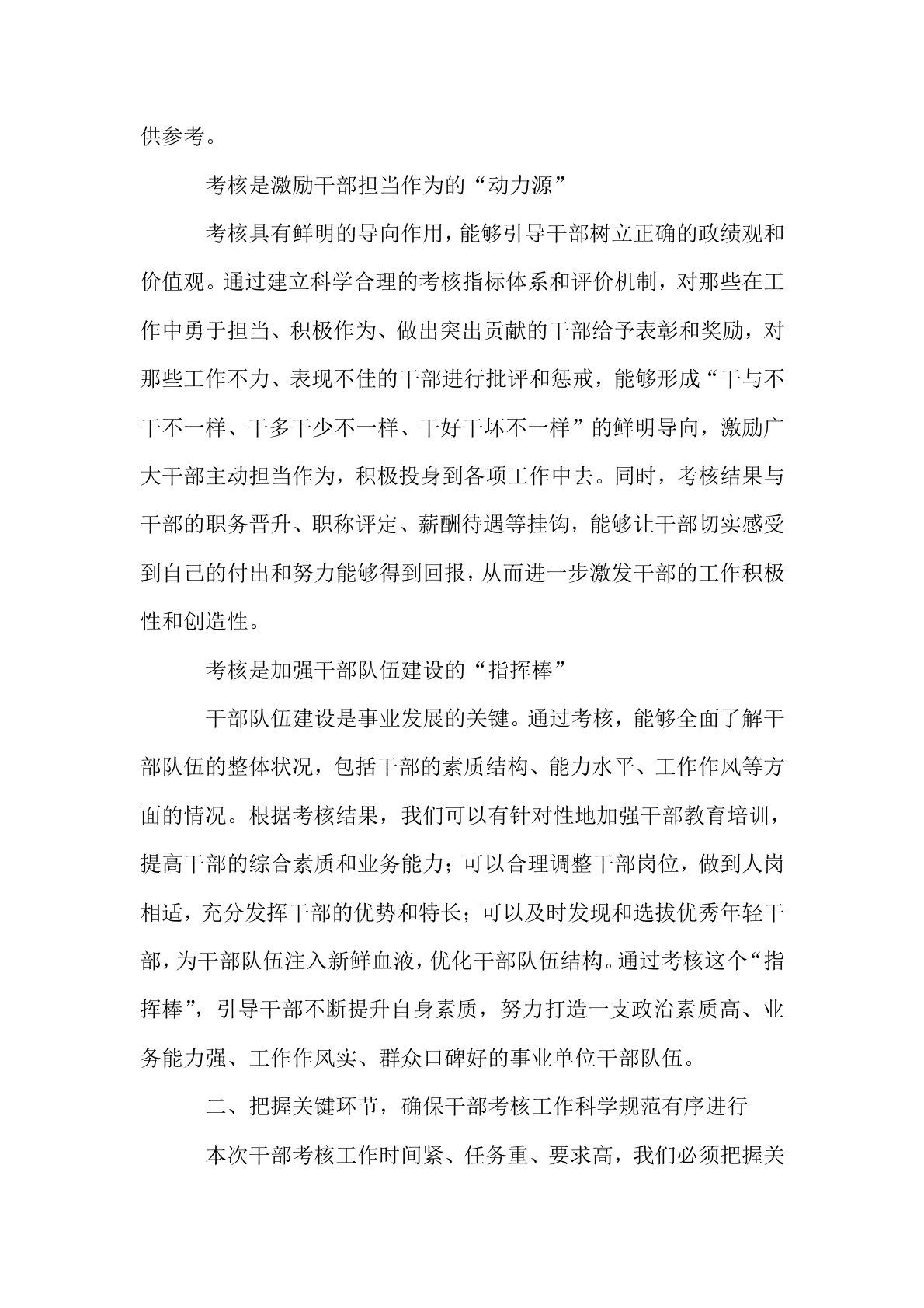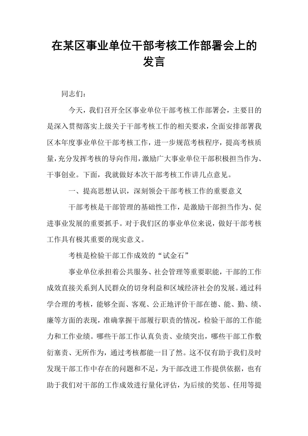 在某区事业单位干部考核工作部署会上的发言同志们:今天,我们召开全区事业单位干部考核工作部署会,主要目的是深入贯彻落实上级关于干部考核工作的相关要求,全面安排部署我区本年度事业单位干部考核工作,进一步规范考核程序,提高考核质量,充分发挥考核的导向作用,激励广大事业单位干部积极担当作为、干事创业。下面,我就做好本次干部考核工作讲几点意见。一、提高思想认识,深刻领会干部考核工作的重要意义干部考核是干部管理的基础性工作,是激励干部担当作为、促进事业发展的重要抓手。对于我们区的事业单位来说,做好干部考核工作具有极其重要的现实意义。考核是检验干部工作成效的“试金石”事业单位承担着公共服务、社会管理等重要职能,干部的工作成效直接关系到人民群众的切身利益和区域经济社会的发展。通过科学合理的考核,能够全面、客...
