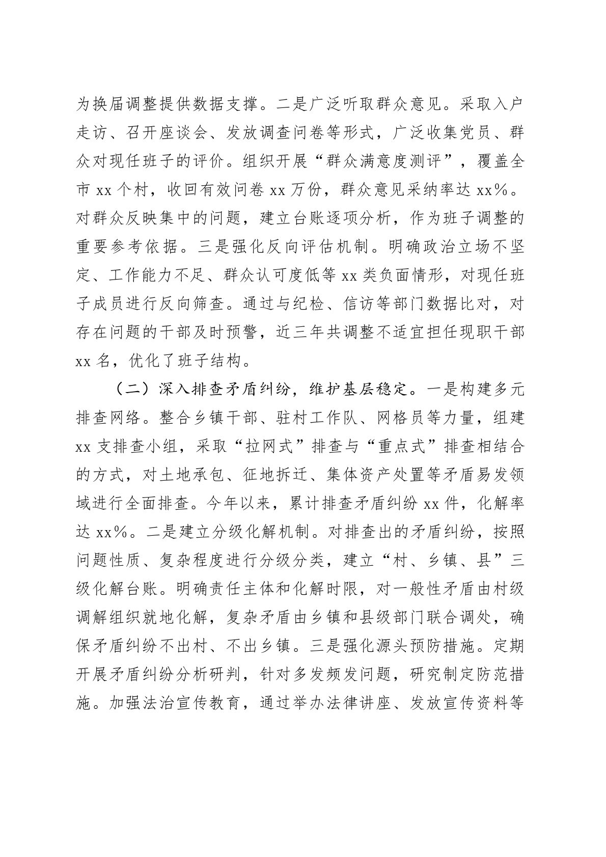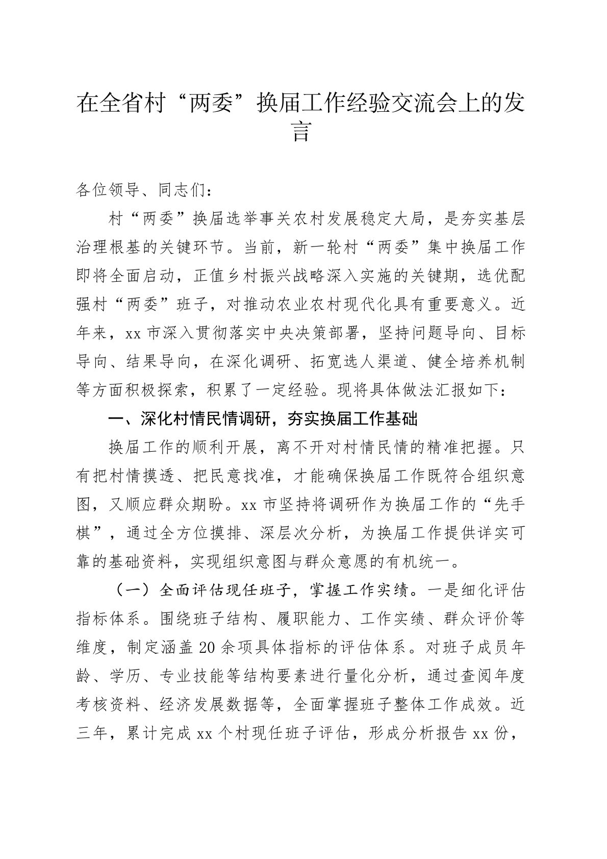 在全省村“两委”换届工作经验交流会上的发言各位领导、同志们:村“两委”换届选举事关农村发展稳定大局,是夯实基层治理根基的关键环节。当前,新一轮村“两委”集中换届工作即将全面启动,正值乡村振兴战略深入实施的关键期,选优配强村“两委”班子,对推动农业农村现代化具有重要意义。近年来,xx市深入贯彻落实中央决策部署,坚持问题导向、目标导向、结果导向,在深化调研、拓宽选人渠道、健全培养机制等方面积极探索,积累了一定经验。现将具体做法汇报如下:一、深化村情民情调研,夯实换届工作基础换届工作的顺利开展,离不开对村情民情的精准把握。只有把村情摸透、把民意找准,才能确保换届工作既符合组织意图,又顺应群众期盼。xx市坚持将调研作为换届工作的“先手棋”,通过全方位摸排、深层次分析,为换届工作提供详实可靠的基础资料...