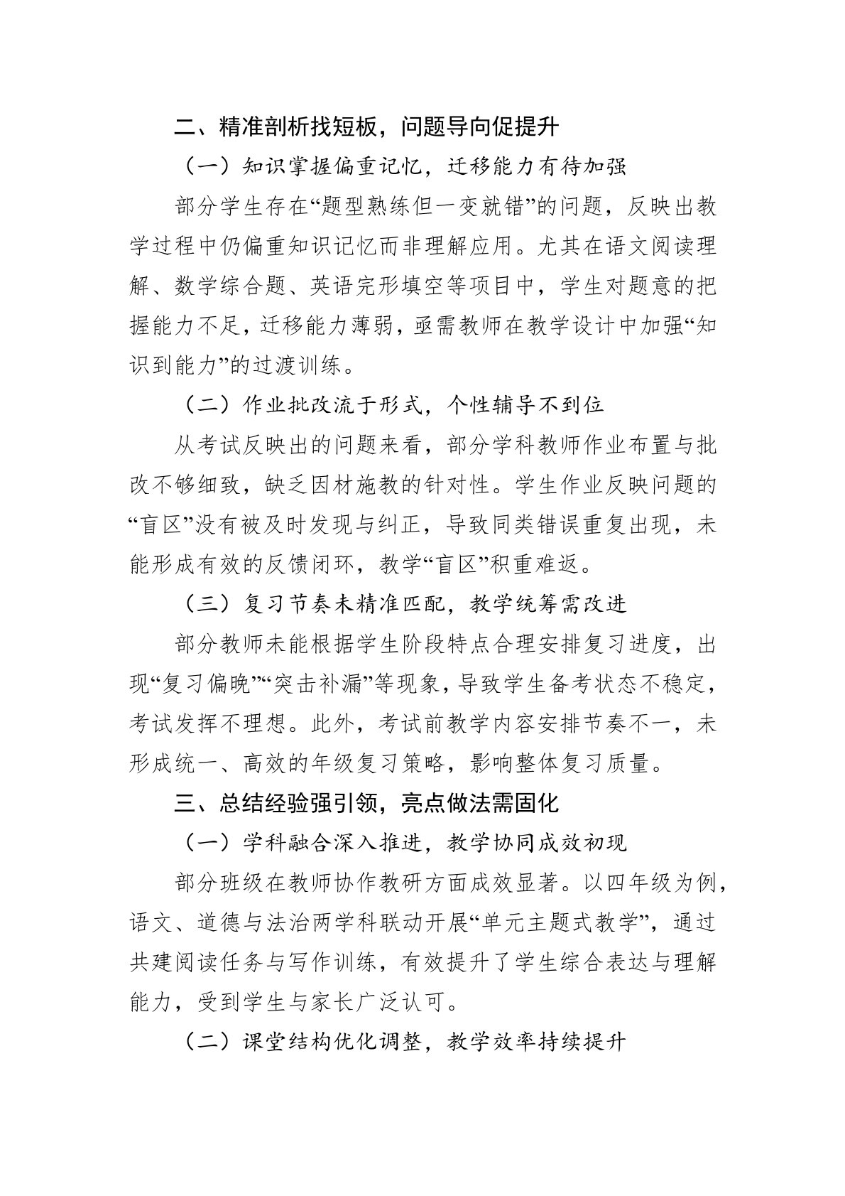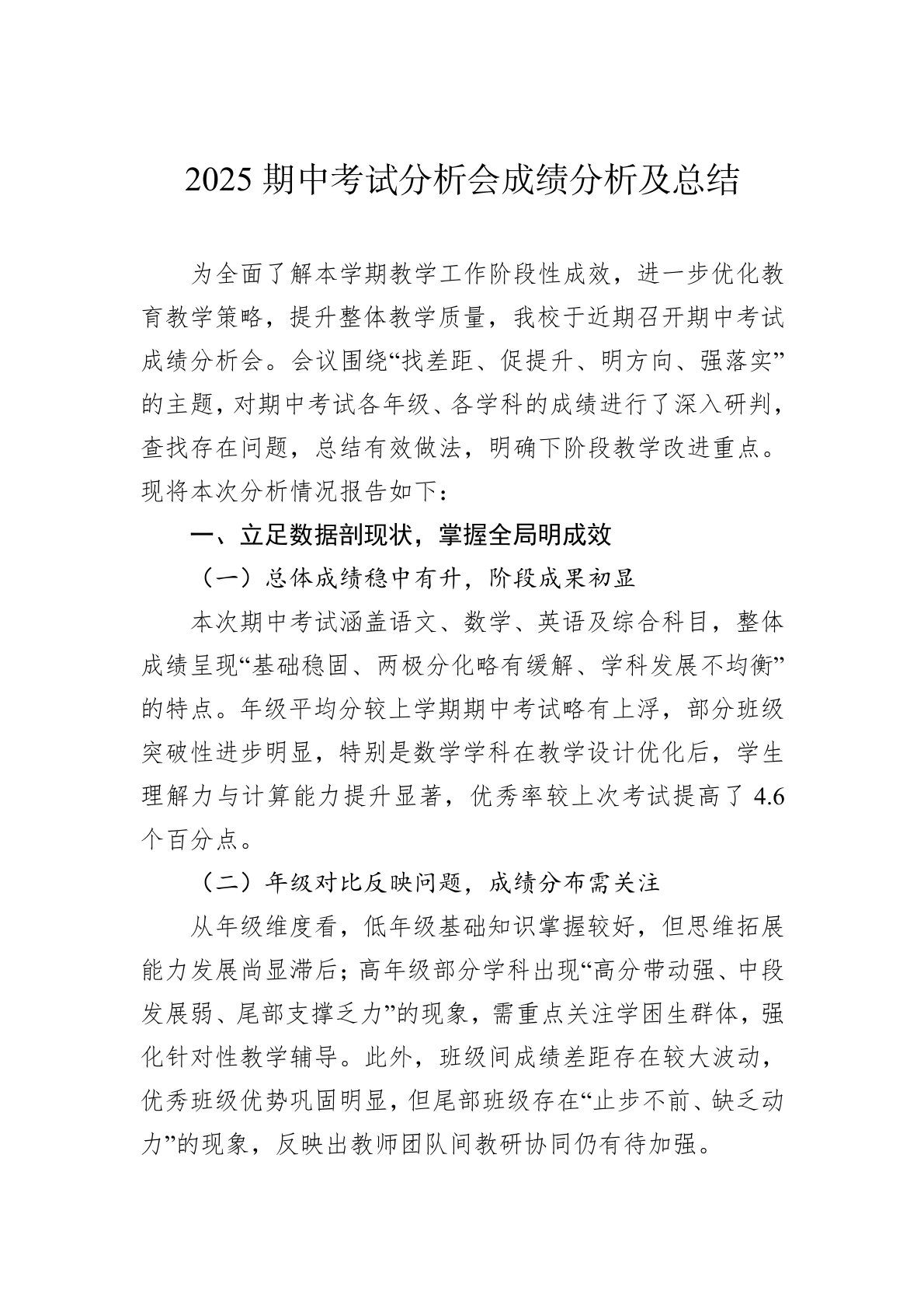 为全面了解本学期教学工作阶段性成效,进一步优化教育教学策略,提升整体教学质量,我校于近期召开期中考试成绩分析会。会议围绕“找差距、促提升、明方向、强落实”的主题,对期中考试各年级、各学科的成绩进行了深入研判,查找存在问题,总结有效做法,明确下阶段教学改进重点。现将本次分析情况报告如下:一、立足数据剖现状,掌握全局明成效(一)总体成绩稳中有升,阶段成果初显本次期中考试涵盖语文、数学、英语及综合科目,整体成绩呈现“基础稳固、两极分化略有缓解、学科发展不均衡”的特点。年级平均分较上学期期中考试略有上浮,部分班级突破性进步明显,特别是数学学科在教学设计优化后,学生理解力与计算能力提升显著,优秀率较上次考试提高了4.6个百分点。(二)年级对比反映问题,成绩分布需关注从年级维度看,低年级基础知识掌握较好...