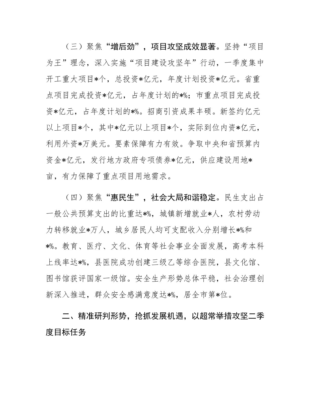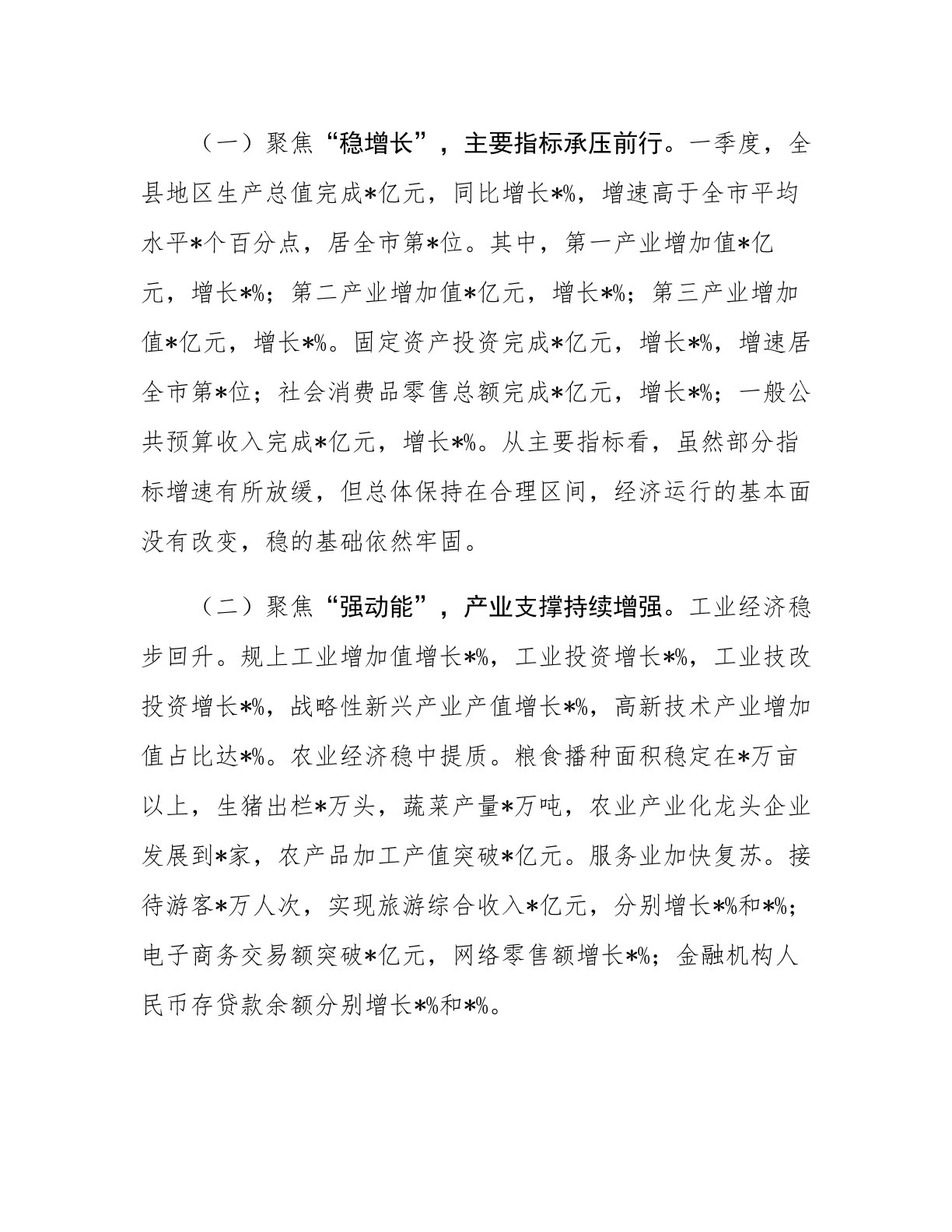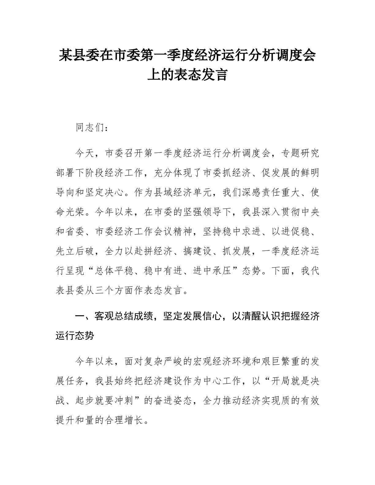 某县委在市委第一季度经济运行分析调度会上的表态发言同志们:今天,市委召开第一季度经济运行分析调度会,专题研究部署下阶段经济工作,充分体现了市委抓经济、促发展的鲜明导向和坚定决心。作为县域经济单元,我们深感责任重大、使命光荣。今年以来,在市委的坚强领导下,我县深入贯彻中央和省委、市委经济工作会议精神,坚持稳中求进、以进促稳、先立后破,全力以赴拼经济、搞建设、抓发展,一季度经济运行呈现“总体平稳、稳中有进、进中承压”态势。下面,我代表县委从三个方面作表态发言。一、客观总结成绩,坚定发展信心,以清醒认识把握经济运行态势今年以来,面对复杂严峻的宏观经济环境和艰巨繁重的发展任务,我县始终把经济建设作为中心工作,以“开局就是决战、起步就要冲刺”的奋进姿态,全力推动经济实现质的有效提升和量的合理增长。(一...