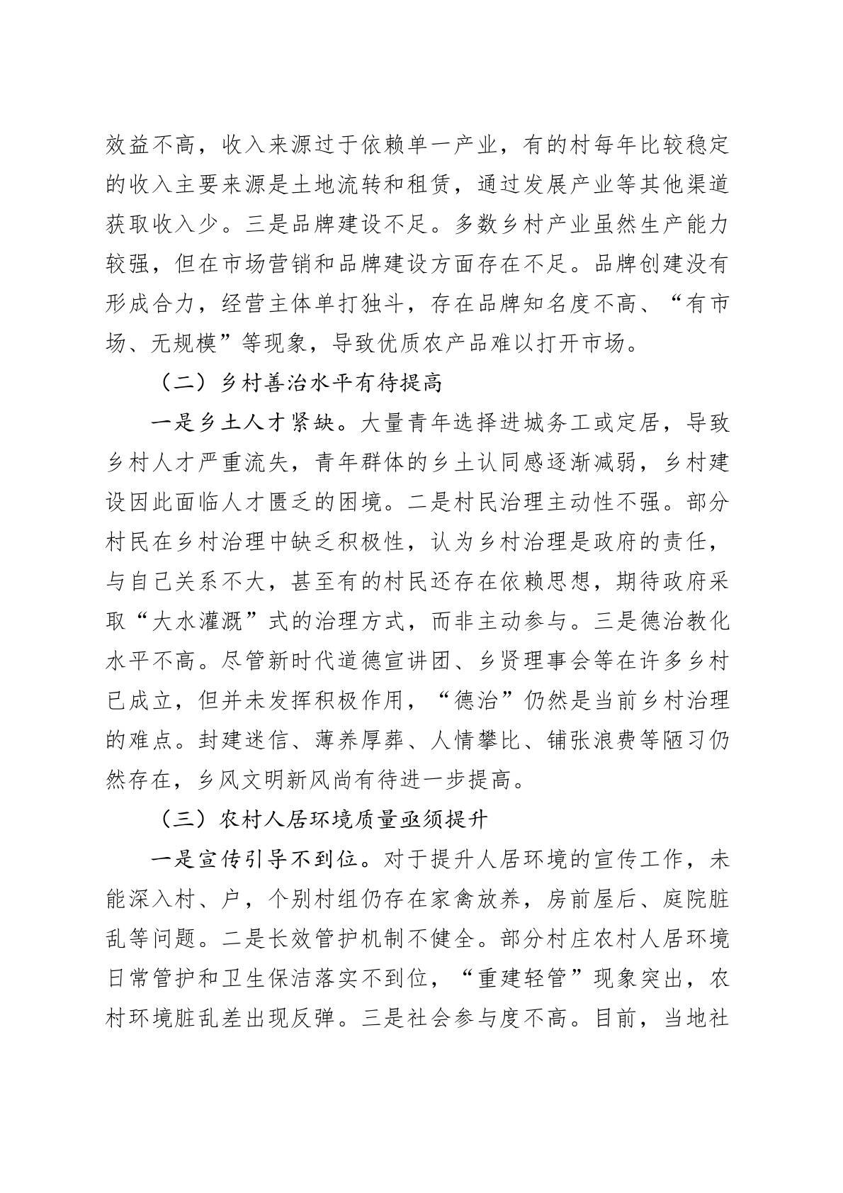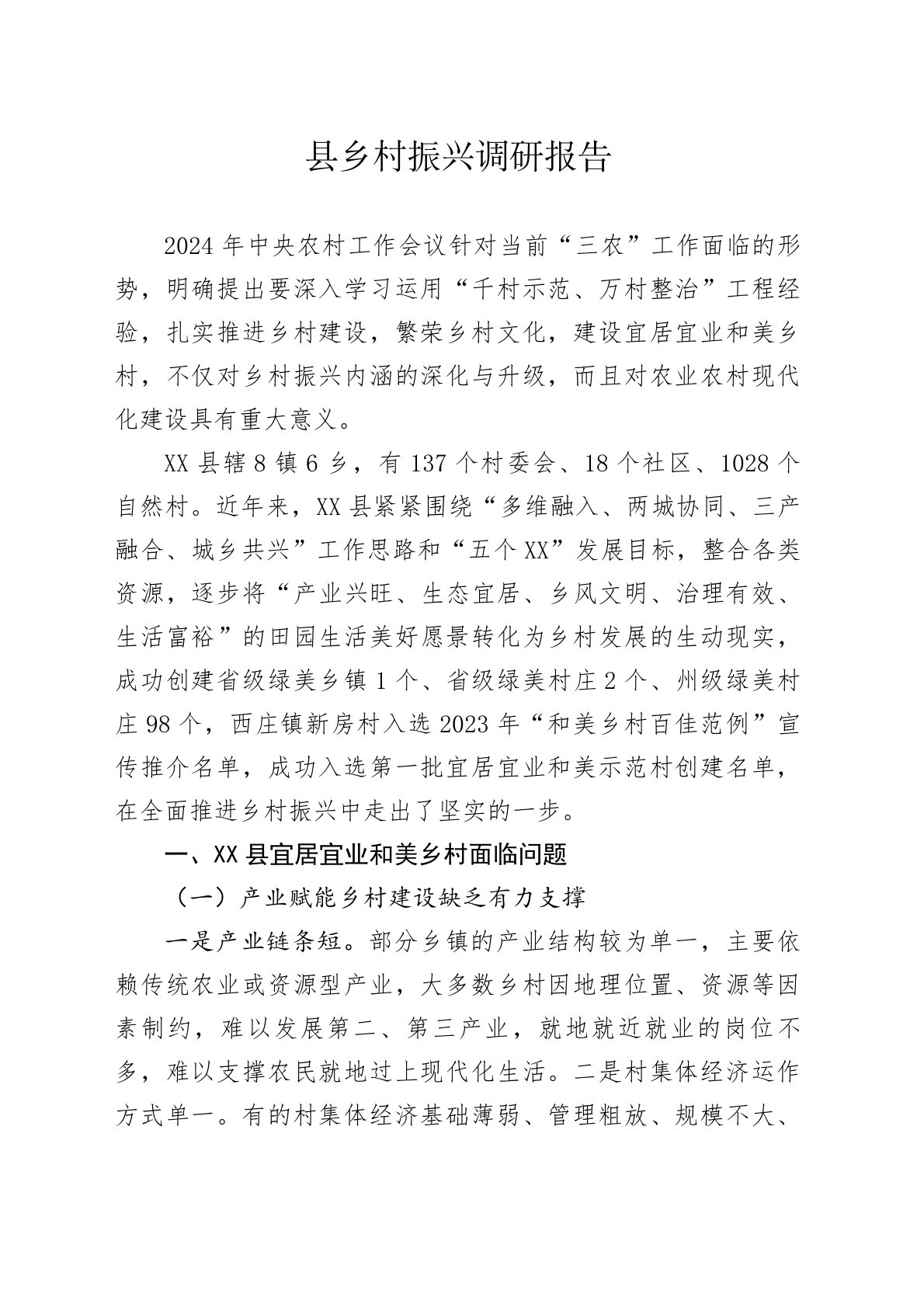 县乡村振兴调研报告2024年中央农村工作会议针对当前“三农”工作面临的形势,明确提出要深入学习运用“千村示范、万村整治”工程经验,扎实推进乡村建设,繁荣乡村文化,建设宜居宜业和美乡村,不仅对乡村振兴内涵的深化与升级,而且对农业农村现代化建设具有重大意义。XX县辖8镇6乡,有137个村委会、18个社区、1028个自然村。近年来,XX县紧紧围绕“多维融入、两城协同、三产融合、城乡共兴”工作思路和“五个XX”发展目标,整合各类资源,逐步将“产业兴旺、生态宜居、乡风文明、治理有效、生活富裕”的田园生活美好愿景转化为乡村发展的生动现实,成功创建省级绿美乡镇1个、省级绿美村庄2个、州级绿美村庄98个,西庄镇新房村入选2023年“和美乡村百佳范例”宣传推介名单,成功入选第一批宜居宜业和美示范村创建名单,在...
