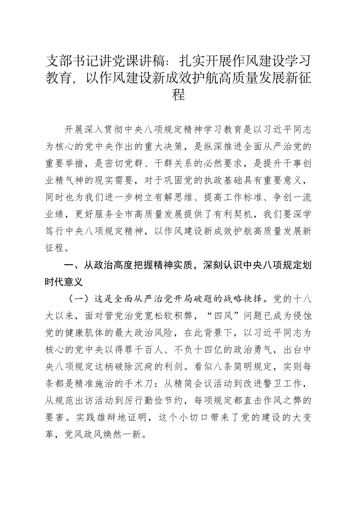 支部书记讲党课讲稿:扎实开展作风建设学习教育,以作风建设新成效护航高质量发展新征程开展深入贯彻中央八项规定精神学习教育是以习近平同志为核心的党中央作出的重大决策,是纵深推进全面从严治党的重要举措,是密切党群、干群关系的必然要求,是提升干事创业精气神的现实需要,对于巩固党的执政基础具有重要意义,同时也为我们进一步树立有解思维、提高工作标准、争创一流业绩,更好服务全市高质量发展提供了有利契机,我们要深学笃行中央八项规定精神,以作风建设新成效护航高质量发展新征程。一、从政治高度把握精神实质,深刻认识中央八项规定划时代意义(一)这是全面从严治党开局破题的战略抉择。党的十八大以来,面对管党治党宽松软积弊,“四风”问题已成为侵蚀党的健康肌体的最大政治风险,在此背景下,以习近平同志为核心的党中央以得罪千百...