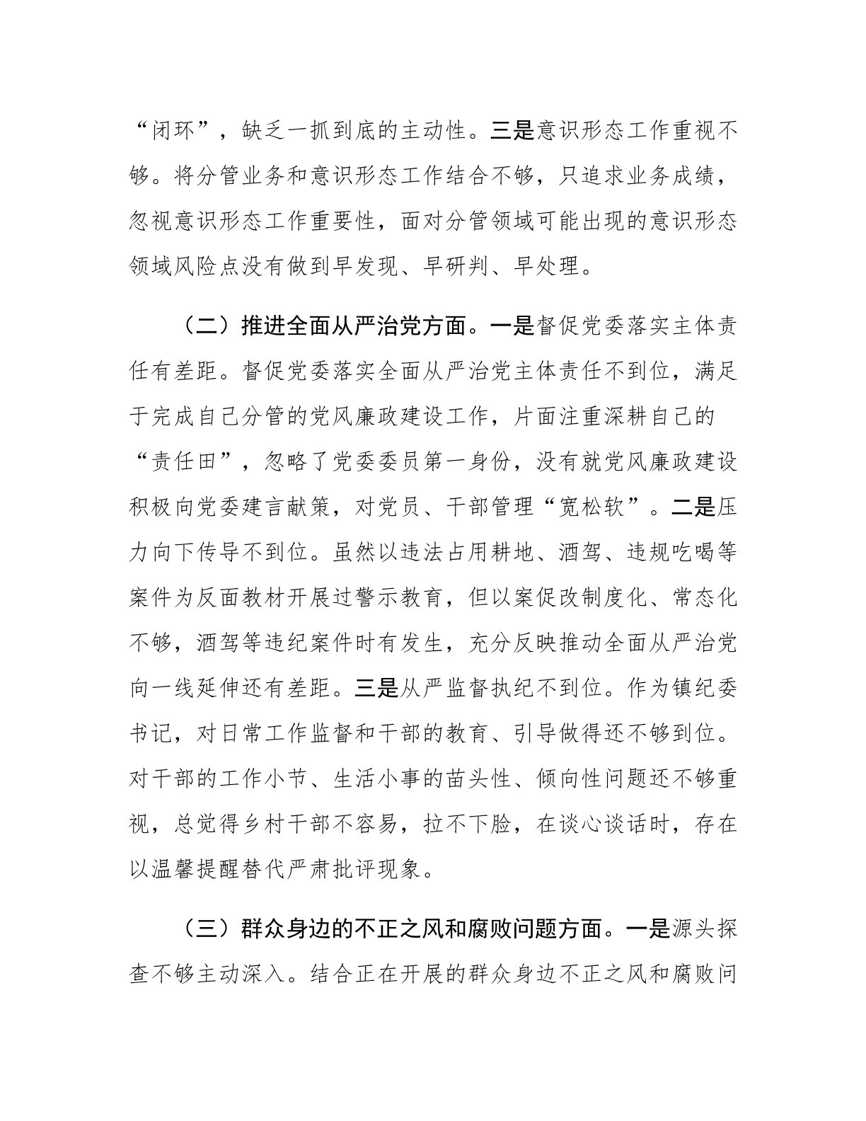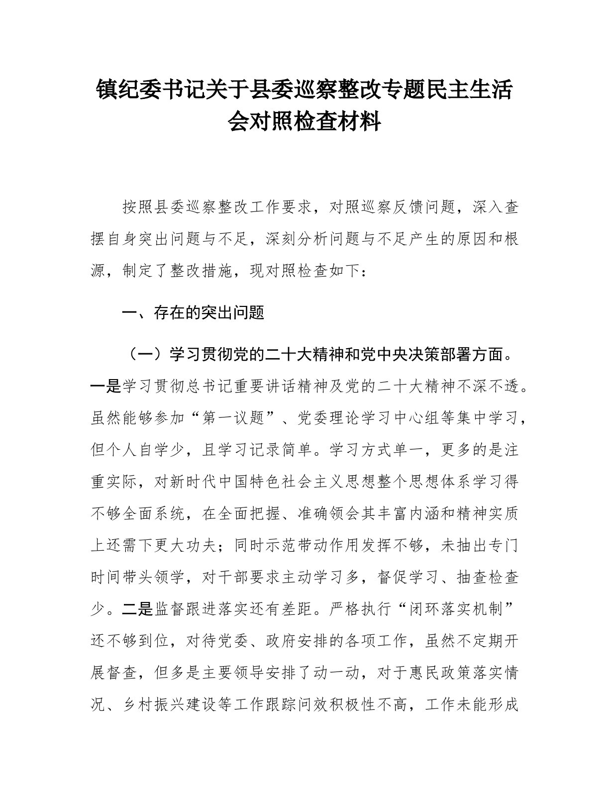 镇纪委书记关于县委巡察整改专题民主生活会对照检查材料按照县委巡察整改工作要求,对照巡察反馈问题,深入查摆自身突出问题与不足,深刻分析问题与不足产生的原因和根源,制定了整改措施,现对照检查如下:一、存在的突出问题(一)学习贯彻党的二十大精神和党中央决策部署方面。一是学习贯彻总书记重要讲话精神及党的二十大精神不深不透。虽然能够参加“第一议题”、党委理论学习中心组等集中学习,但个人自学少,且学习记录简单。学习方式单一,更多的是注重实际,对新时代中国特色社会主义思想整个思想体系学习得不够全面系统,在全面把握、准确领会其丰富内涵和精神实质上还需下更大功夫;同时示范带动作用发挥不够,未抽出专门时间带头领学,对干部要求主动学习多,督促学习、抽查检查少。二是监督跟进落实还有差距。严格执行“闭环落实机制”还不...