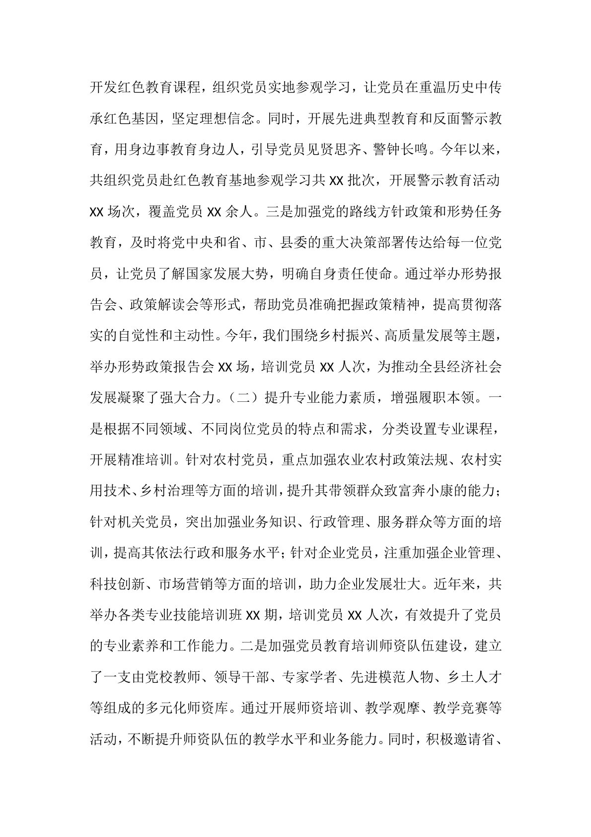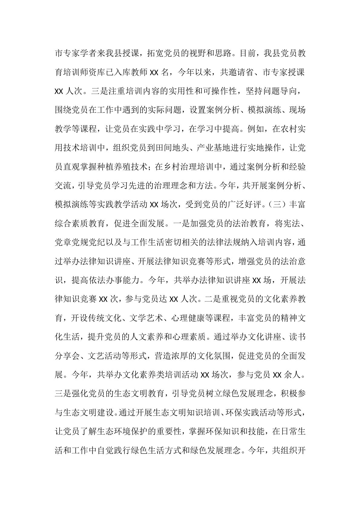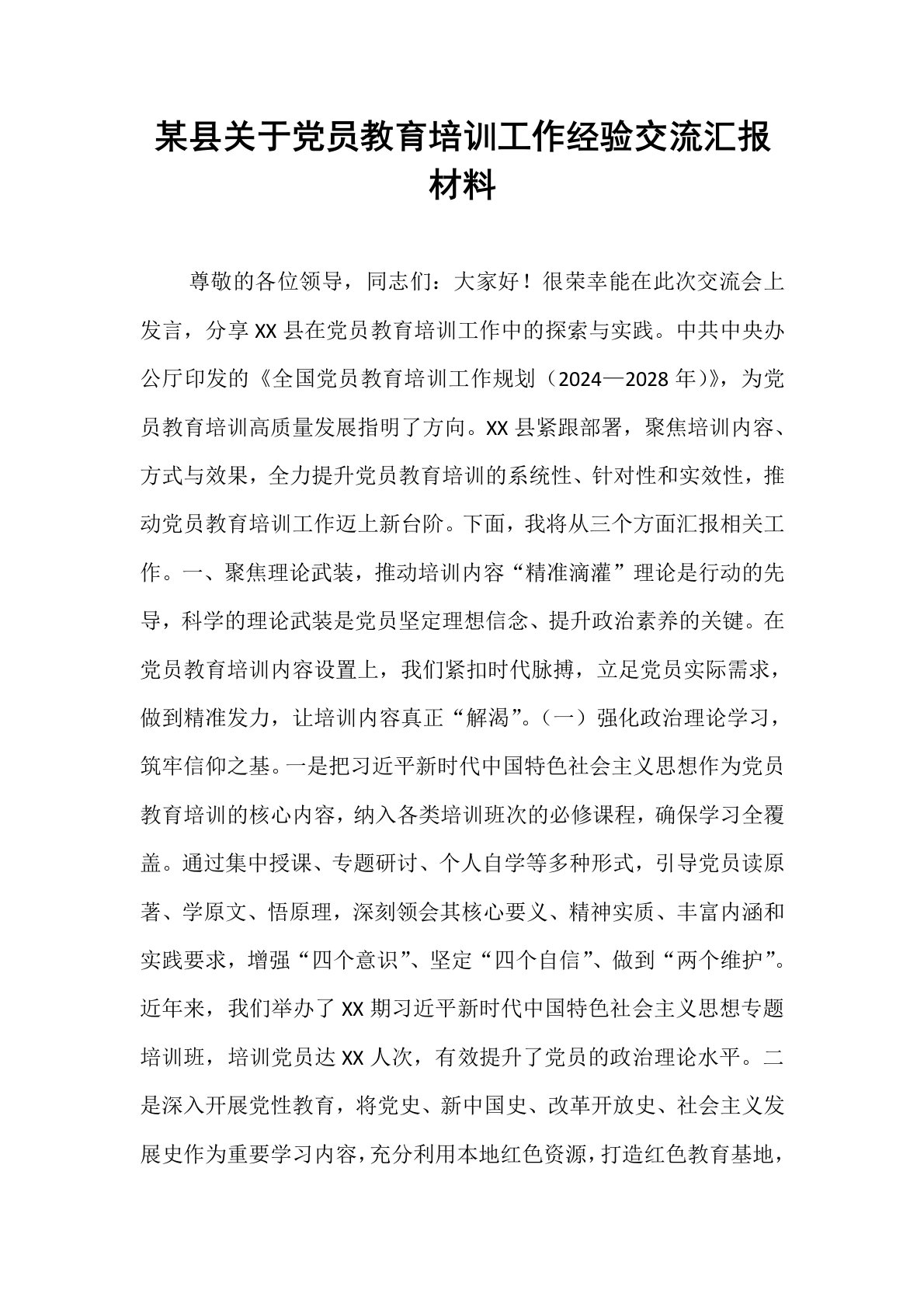 某县关于党员教育培训工作经验交流汇报材料 尊敬的各位领导,同志们:大家好!很荣幸能在此次交流会上发言,分享XX县在党员教育培训工作中的探索与实践。中共中央办公厅印发的《全国党员教育培训工作规划(2024—2028年)》,为党员教育培训高质量发展指明了方向。XX县紧跟部署,聚焦培训内容、方式与效果,全力提升党员教育培训的系统性、针对性和实效性,推动党员教育培训工作迈上新台阶。下面,我将从三个方面汇报相关工作。一、聚焦理论武装,推动培训内容“精准滴灌”理论是行动的先导,科学的理论武装是党员坚定理想信念、提升政治素养的关键。在党员教育培训内容设置上,我们紧扣时代脉搏,立足党员实际需求,做到精准发力,让培训内容真正“解渴”。(一)强化政治理论学习,筑牢信仰之基。一是把习近平新时代中国特色社会主义思想...
