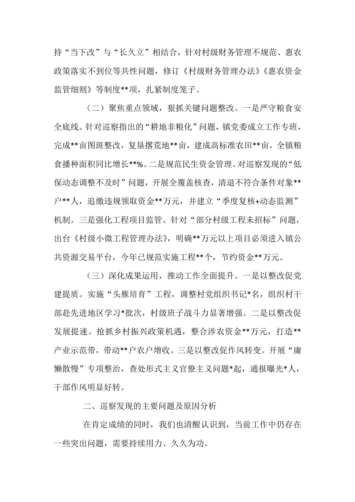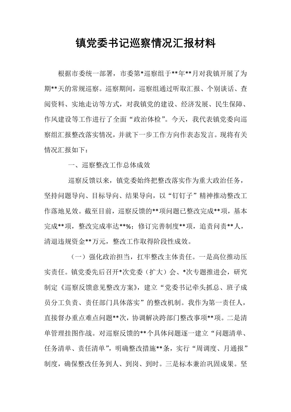 镇党委书记巡察情况汇报材料根据市委统一部署,市委第*巡察组于**年**月对我镇开展了为期**天的常规巡察。巡察期间,巡察组通过听取汇报、个别谈话、查阅资料、实地走访等方式,对我镇党的建设、经济发展、民生保障、作风建设等工作进行了全面“政治体检”。今天,我代表镇党委向巡察组汇报整改落实情况,并就下一步工作方向作表态发言。现将有关情况汇报如下:一、巡察整改工作总体成效巡察反馈以来,镇党委始终把整改落实作为重大政治任务,坚持问题导向、目标导向、结果导向,以“钉钉子”精神推动整改工作落地见效。截至目前,巡察反馈的**项问题已整改完成**项,基本完成**项,整改完成率达**%;修订完善制度**项,追责问责**人,清退违规资金**万元,整改工作取得阶段性成效。(一)强化政治担当,扛牢整改主体责任。一是高...