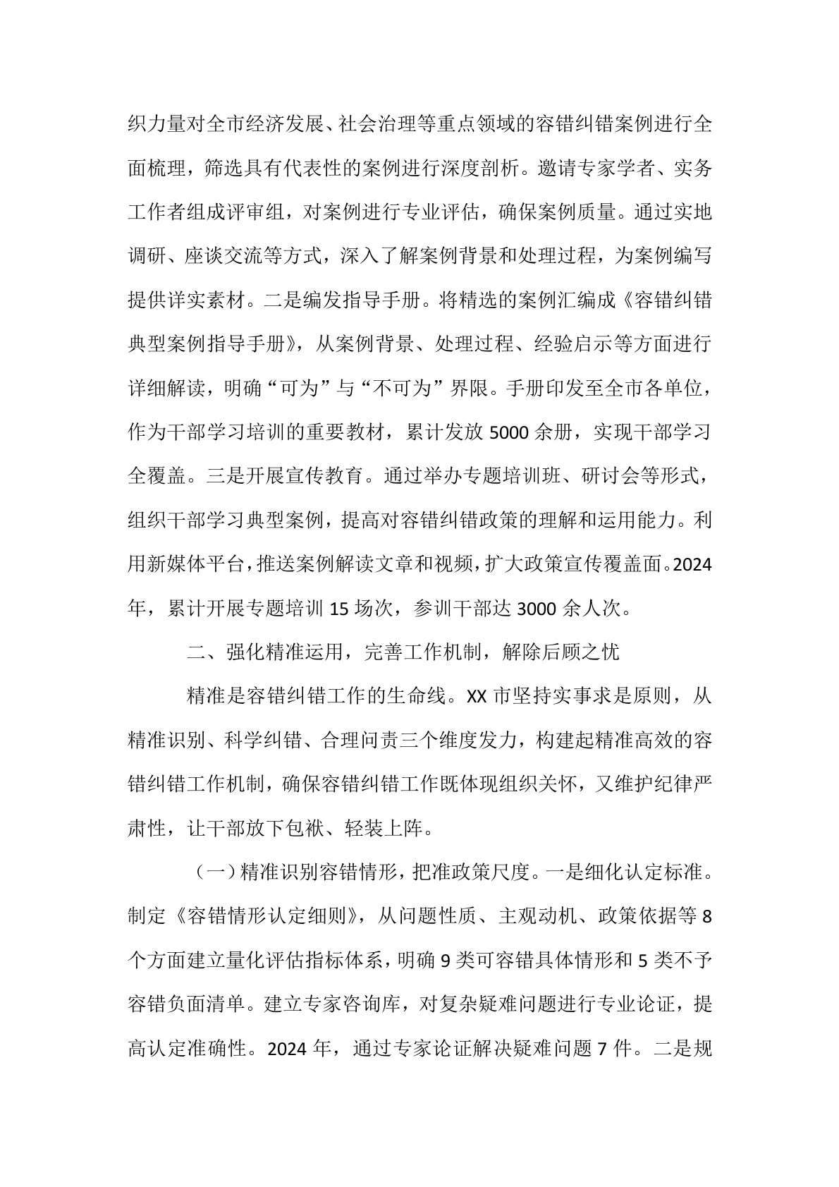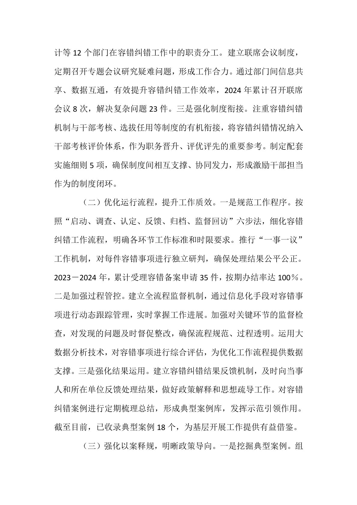 在全省干部激励机制建设经验交流会上的发言尊敬的各位领导、同志们:党的二十届三中全会《决定》明确提出落实“三个区分开来”,为干部干事创业指明方向。全国组织部长会议进一步强调将从严管理监督与鼓励担当作为有机统一。近年来,*市深入贯彻中央精神,积极探索容错纠错机制创新实践,构建全周期管理体系,实现从被动纠错向主动护航转变,为干部担当作为注入强劲动力。现将相关经验汇报如下:一、突出顶层设计,筑牢制度根基,激发先行活力制度是干事创业的根本保障。为破解容错纠错机制运行中的堵点难点,XX市坚持问题导向,聚焦制度空白、流程短板、执行偏差等问题,以系统性思维推进制度创新和流程再造,构建起权责清晰、程序规范、运行高效的容错纠错体系,为干部先行先试吃下“定心丸”。(一)健全制度体系,明确权责边界。一是完善制度框架...