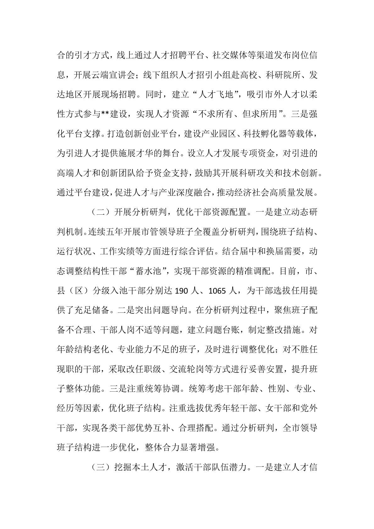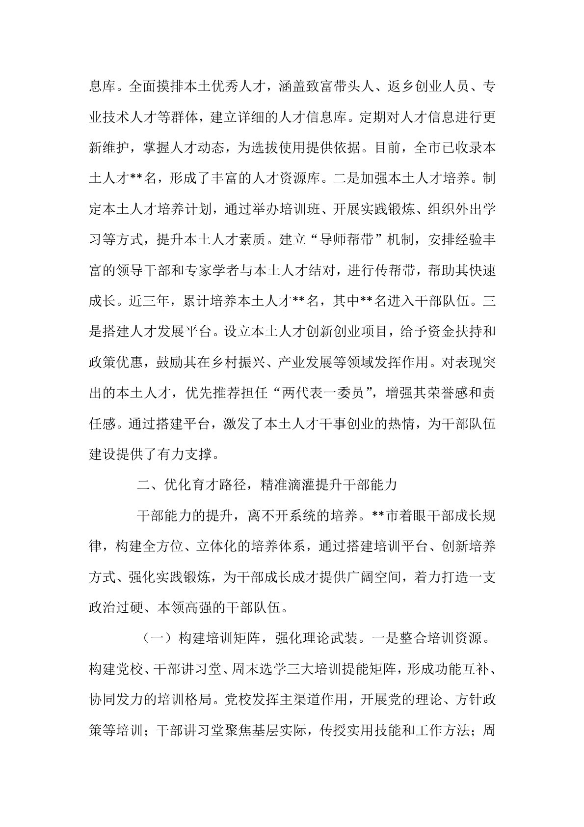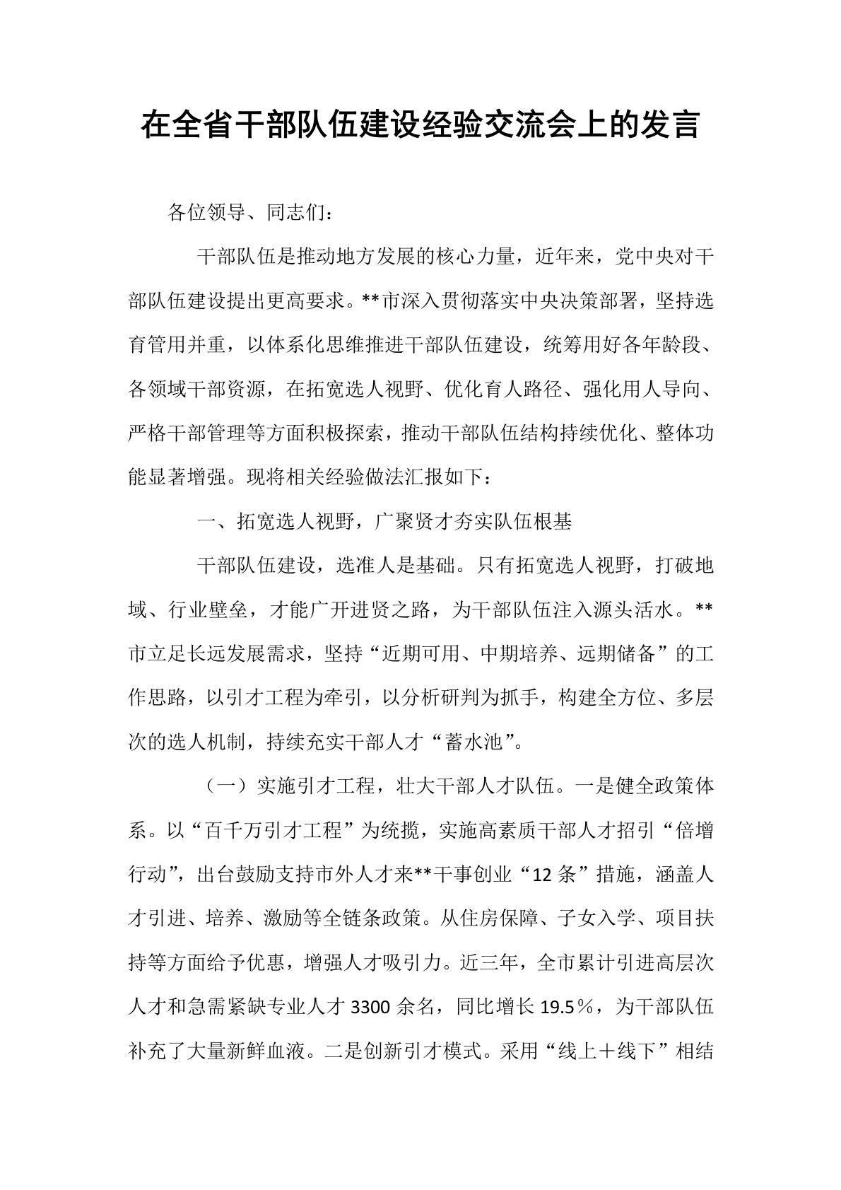 在全省干部队伍建设经验交流会上的发言各位领导、同志们:干部队伍是推动地方发展的核心力量,近年来,党中央对干部队伍建设提出更高要求。**市深入贯彻落实中央决策部署,坚持选育管用并重,以体系化思维推进干部队伍建设,统筹用好各年龄段、各领域干部资源,在拓宽选人视野、优化育人路径、强化用人导向、严格干部管理等方面积极探索,推动干部队伍结构持续优化、整体功能显著增强。现将相关经验做法汇报如下:一、拓宽选人视野,广聚贤才夯实队伍根基干部队伍建设,选准人是基础。只有拓宽选人视野,打破地域、行业壁垒,才能广开进贤之路,为干部队伍注入源头活水。**市立足长远发展需求,坚持“近期可用、中期培养、远期储备”的工作思路,以引才工程为牵引,以分析研判为抓手,构建全方位、多层次的选人机制,持续充实干部人才“蓄水池”。(...