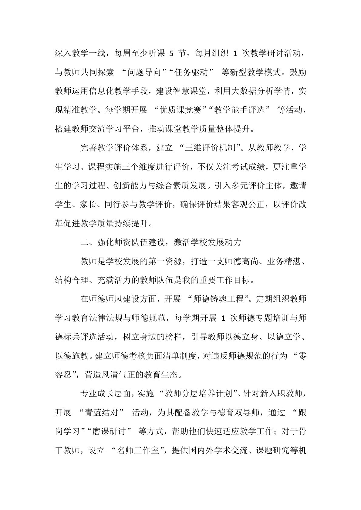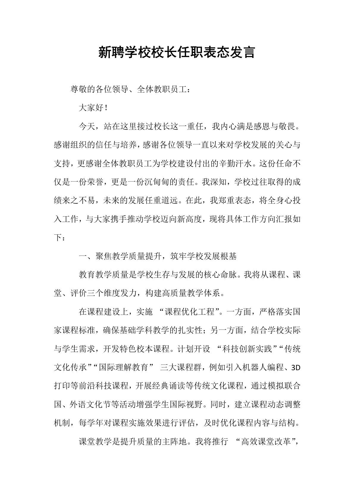 新聘学校校长任职表态发言尊敬的各位领导、全体教职员工:大家好!今天,站在这里接过校长这一重任,我内心满是感恩与敬畏。感谢组织的信任与培养,感谢各位领导一直以来对学校发展的关心与支持,更感谢全体教职员工为学校建设付出的辛勤汗水。这份任命不仅是一份荣誉,更是一份沉甸甸的责任。我深知,学校过往取得的成绩来之不易,未来的发展任重道远。在此,我郑重表态,将全身心投入工作,与大家携手推动学校迈向新高度,现将具体工作方向汇报如下:一、聚焦教学质量提升,筑牢学校发展根基教育教学质量是学校生存与发展的核心命脉。我将从课程、课堂、评价三个维度发力,构建高质量教学体系。在课程建设上,实施“课程优化工程”。一方面,严格落实国家课程标准,确保基础学科教学的扎实性;另一方面,结合学校实际与学生需求,开发特色校本课程。计...