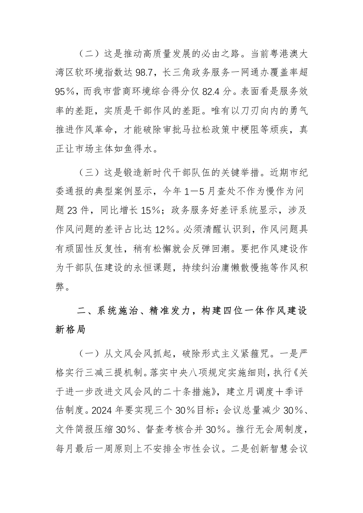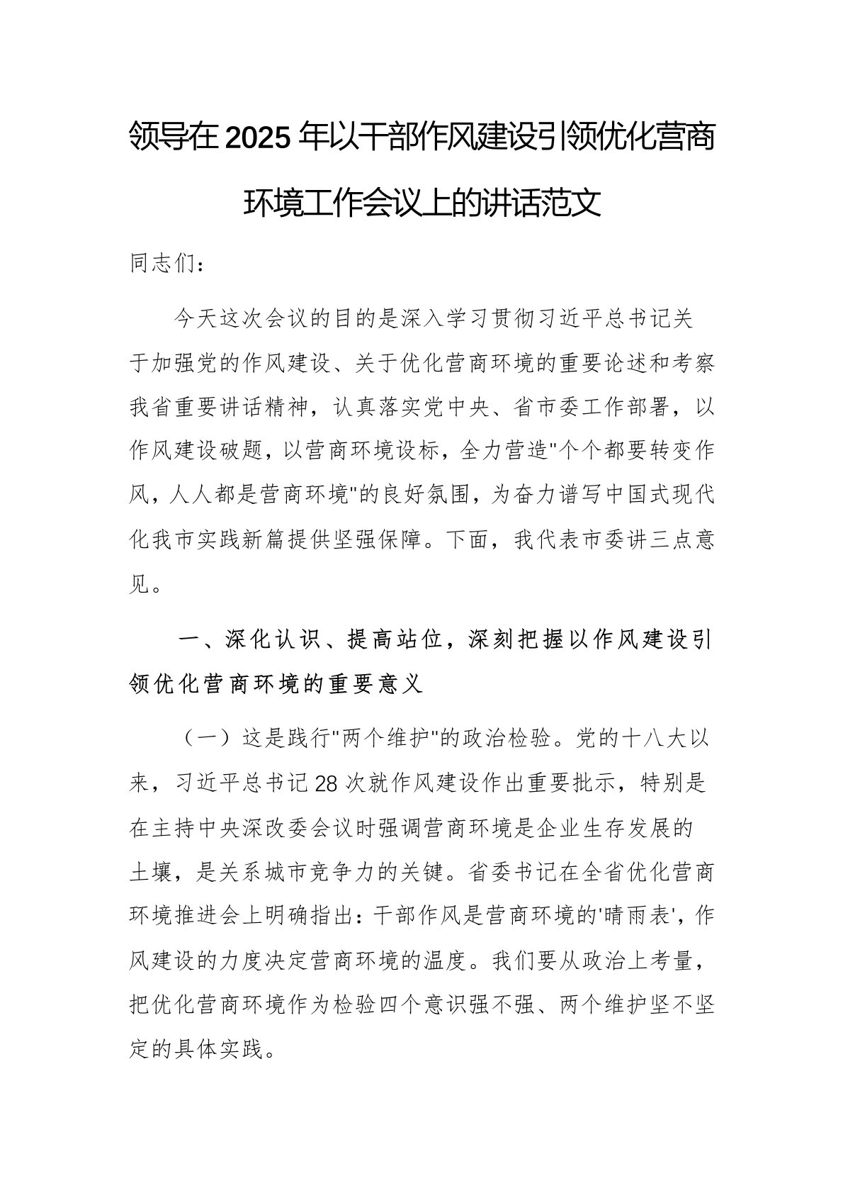领导在2025年以干部作风建设引领优化营商环境工作会议上的讲话范文同志们:今天这次会议的目的是深入学习贯彻习近平总书记关于加强党的作风建设、关于优化营商环境的重要论述和考察我省重要讲话精神,认真落实党中央、省市委工作部署,以作风建设破题,以营商环境设标,全力营造"个个都要转变作风,人人都是营商环境"的良好氛围,为奋力谱写中国式现代化我市实践新篇提供坚强保障。下面,我代表市委讲三点意见。一、深化认识、提高站位,深刻把握以作风建设引领优化营商环境的重要意义(一)这是践行"两个维护"的政治检验。党的十八大以来,习近平总书记28次就作风建设作出重要批示,特别是在主持中央深改委会议时强调营商环境是企业生存发展的土壤,是关系城市竞争力的关键。省委书记在全省优化营商环境推进会上明确指出:干部作风是营商环境...