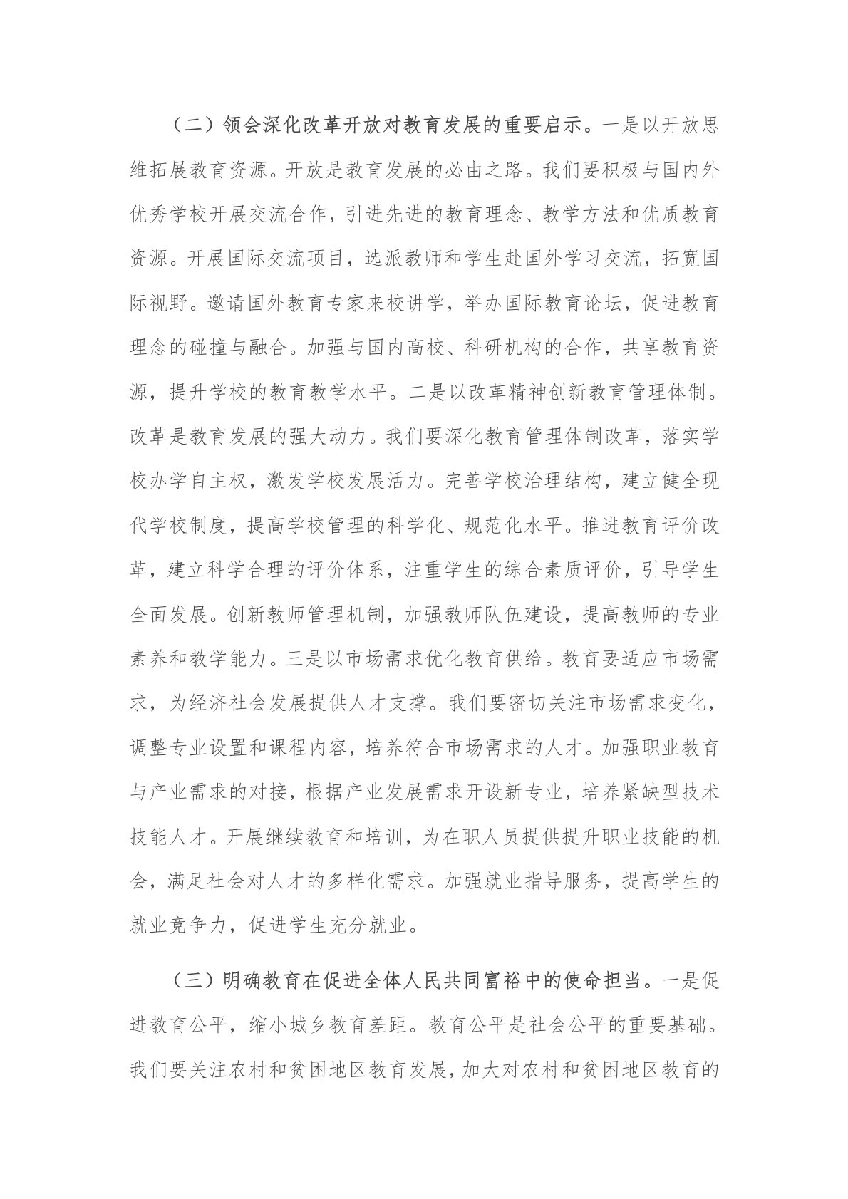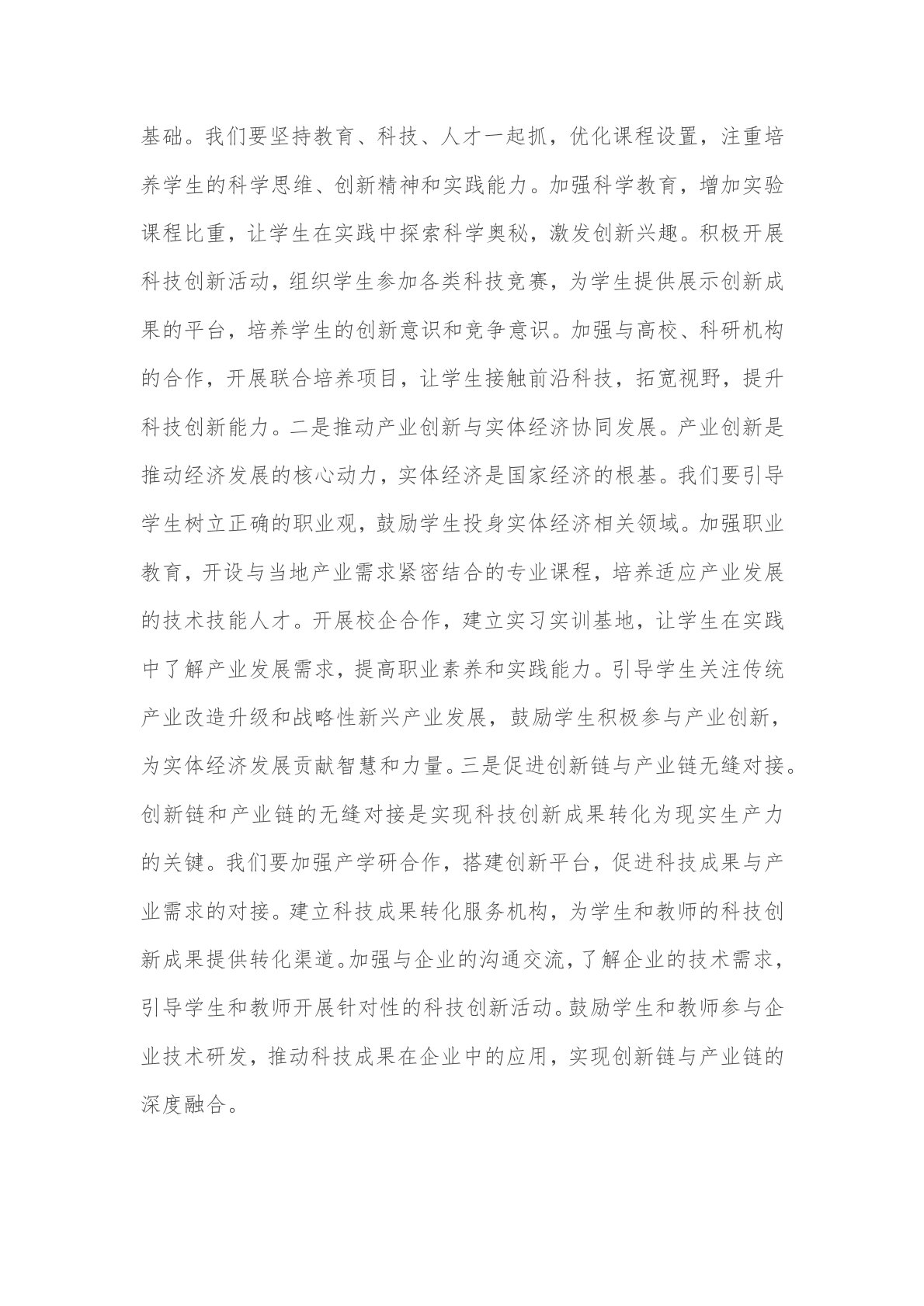 2025年在党委理论学习中心组专题学习全国“两会”上重要讲话精神研讨交流会上的讲话2篇同志们:在全国上下深入贯彻落实党的二十届三中全会精神、全面推进中国式现代化的关键时刻,2025年全国“两会”胜利召开。习近平总书记在两会期间的重要讲话,高屋建瓴、思想深邃、内涵丰富,为我们指明了前进方向、提供了根本遵循。作为教育工作者,我们肩负着为党育人、为国育才的神圣使命,更应深入学习领会,将其转化为推动学校发展、提升教育质量的强大动力。下面,结合我校工作实际,我谈几点体会。一、深化思想认识,把握核心要义思想是行动的先导,理论是实践的指南。习近平总书记在全国“两会”上的重要讲话,涉及经济、教育、科技、人才等多个领域,对我们深刻理解国家发展战略、明确教育工作方向具有重大意义。我们必须深入学习、深刻领会,准确...