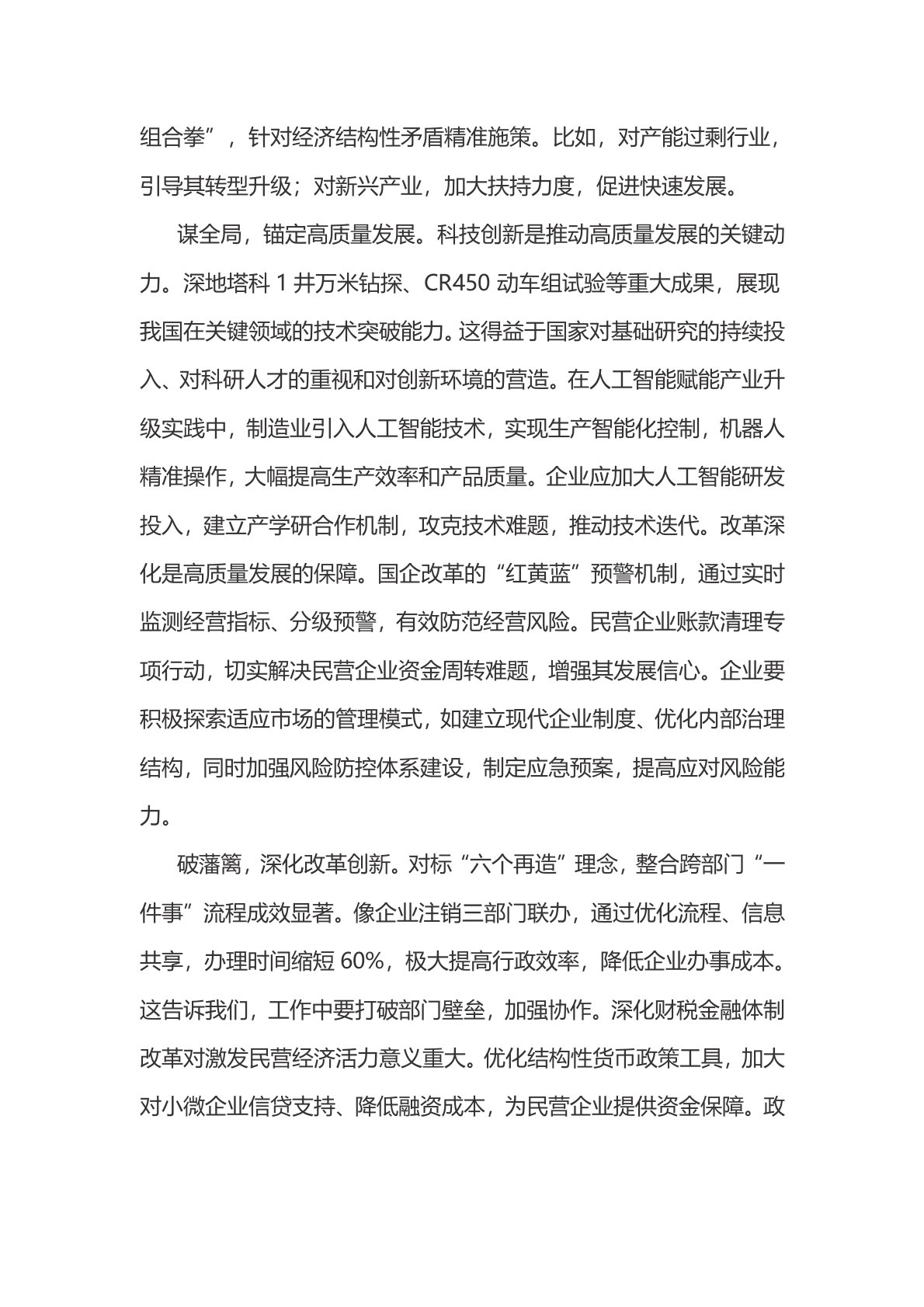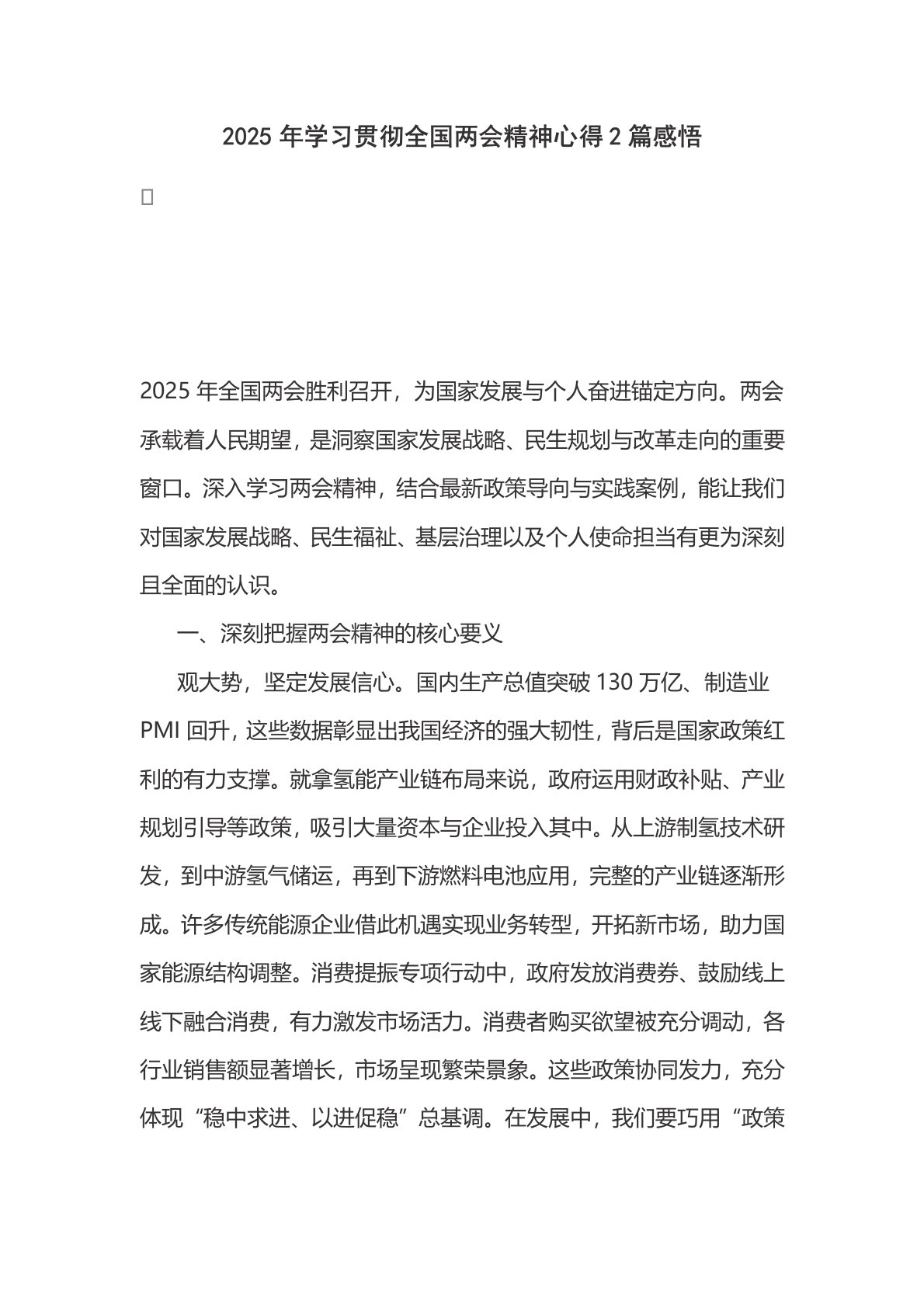 2025年学习贯彻全国两会精神心得2篇感悟2025年全国两会胜利召开,为国家发展与个人奋进锚定方向。两会承载着人民期望,是洞察国家发展战略、民生规划与改革走向的重要窗口。深入学习两会精神,结合最新政策导向与实践案例,能让我们对国家发展战略、民生福祉、基层治理以及个人使命担当有更为深刻且全面的认识。一、深刻把握两会精神的核心要义观大势,坚定发展信心。国内生产总值突破130万亿、制造业PMI回升,这些数据彰显出我国经济的强大韧性,背后是国家政策红利的有力支撑。就拿氢能产业链布局来说,政府运用财政补贴、产业规划引导等政策,吸引大量资本与企业投入其中。从上游制氢技术研发,到中游氢气储运,再到下游燃料电池应用,完整的产业链逐渐形成。许多传统能源企业借此机遇实现业务转型,开拓新市场,助力国家能源结构调...