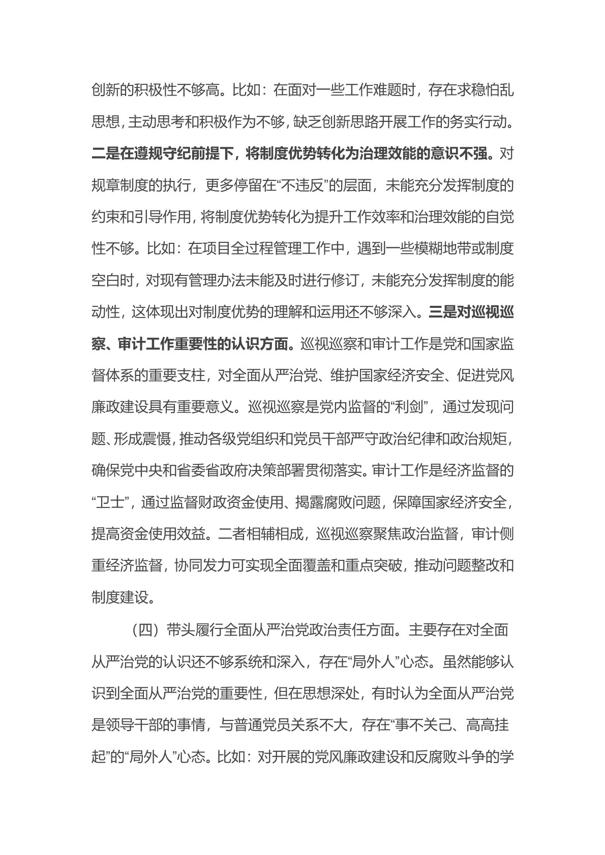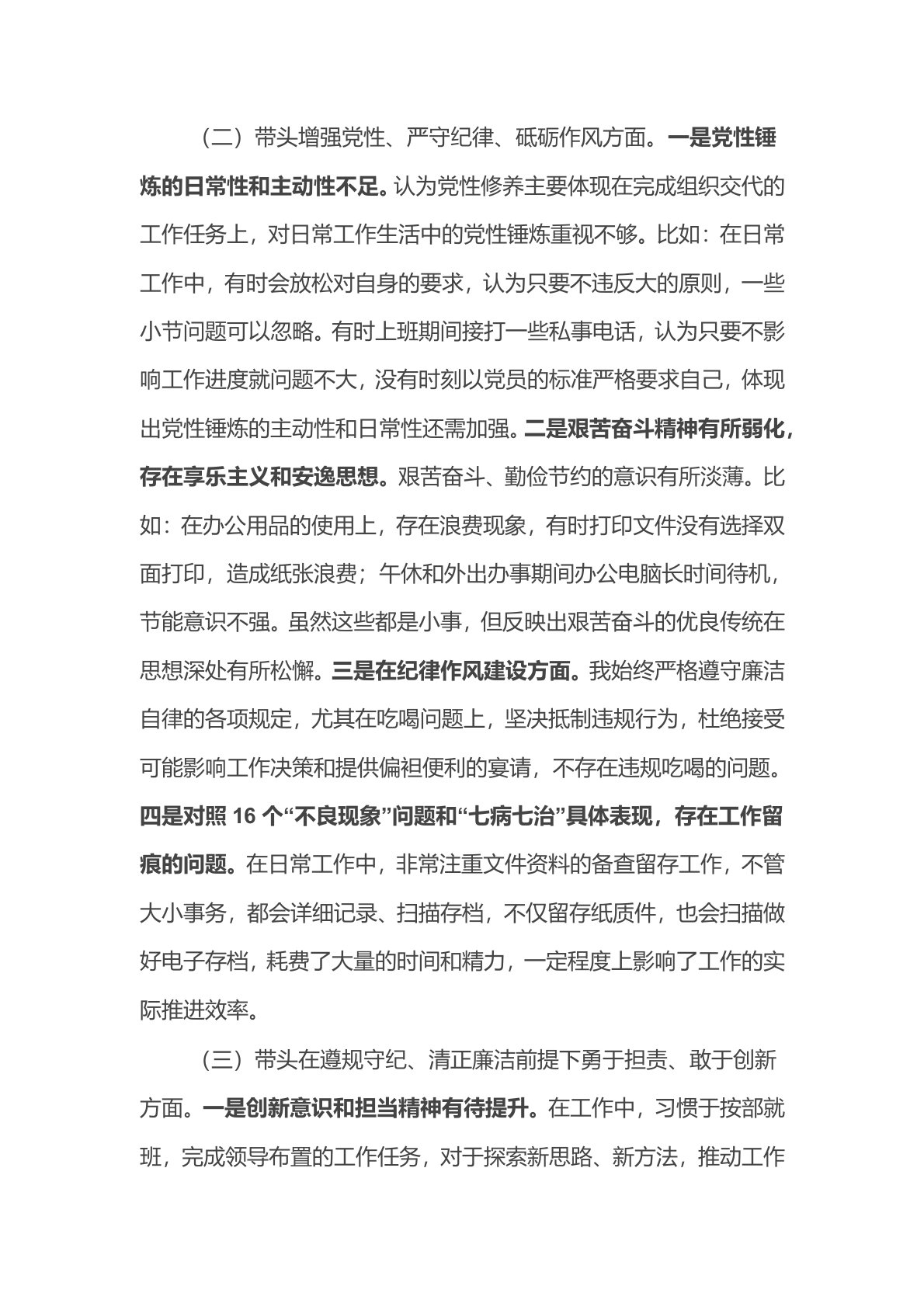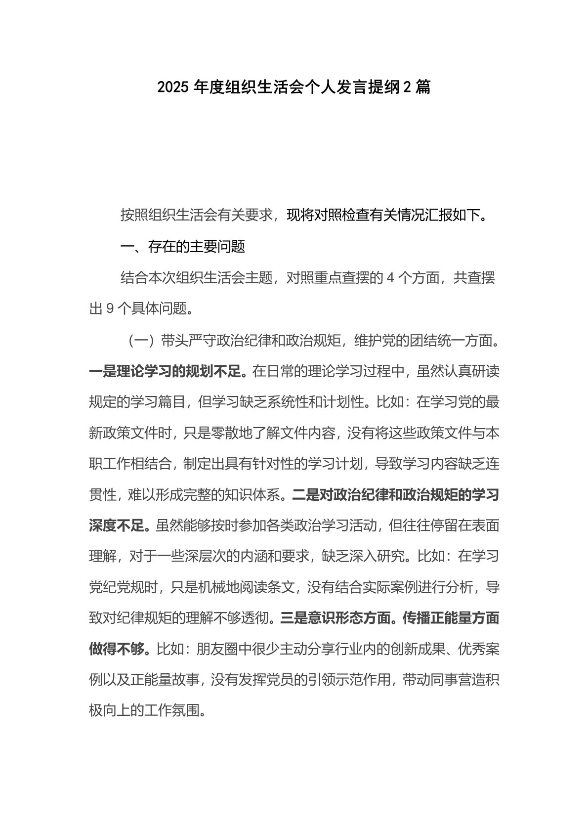 2025年度组织生活会个人发言提纲2篇按照组织生活会有关要求,现将对照检查有关情况汇报如下。一、存在的主要问题结合本次组织生活会主题,对照重点查摆的4个方面,共查摆出9个具体问题。(一)带头严守政治纪律和政治规矩,维护党的团结统一方面。一是理论学习的规划不足。在日常的理论学习过程中,虽然认真研读规定的学习篇目,但学习缺乏系统性和计划性。比如:在学习党的最新政策文件时,只是零散地了解文件内容,没有将这些政策文件与本职工作相结合,制定出具有针对性的学习计划,导致学习内容缺乏连贯性,难以形成完整的知识体系。二是对政治纪律和政治规矩的学习深度不足。虽然能够按时参加各类政治学习活动,但往往停留在表面理解,对于一些深层次的内涵和要求,缺乏深入研究。比如:在学习党纪党规时,只是机械地阅读条文,没有结合实际...