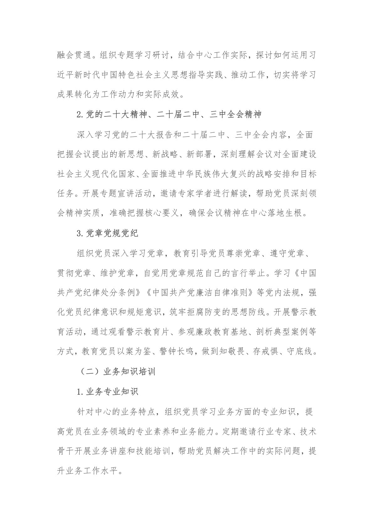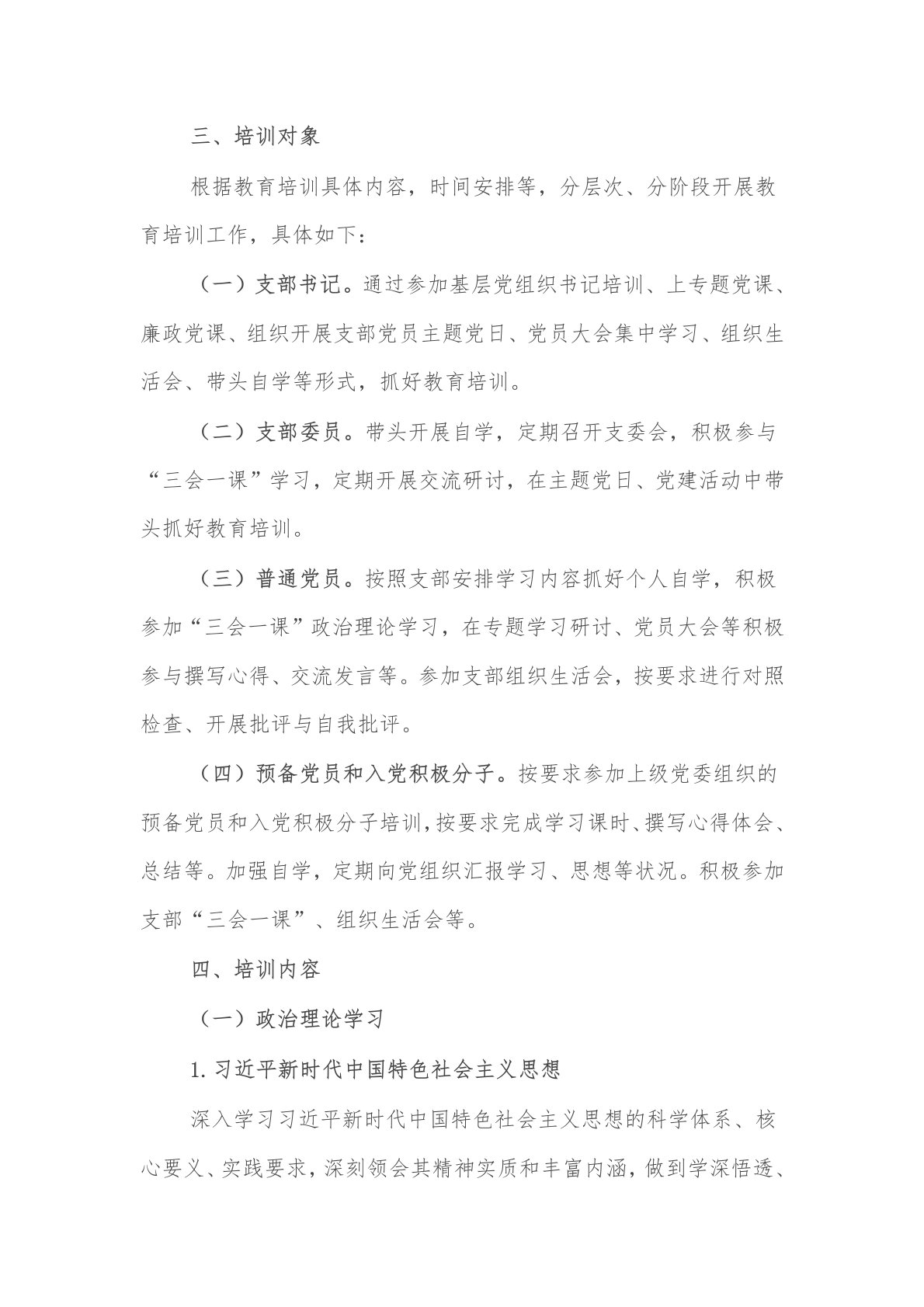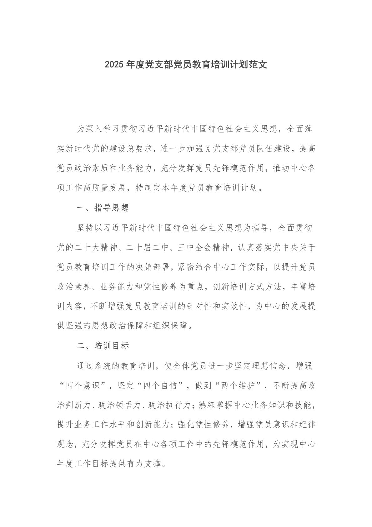 2025年度党支部党员教育培训计划范文为深入学习贯彻习近平新时代中国特色社会主义思想,全面落实新时代党的建设总要求,进一步加强X党支部党员队伍建设,提高党员政治素质和业务能力,充分发挥党员先锋模范作用,推动中心各项工作高质量发展,特制定本年度党员教育培训计划。一、指导思想坚持以习近平新时代中国特色社会主义思想为指导,全面贯彻党的二十大精神、二十届二中、三中全会精神,认真落实党中央关于党员教育培训工作的决策部署,紧密结合中心工作实际,以提升党员政治素养、业务能力和党性修养为重点,创新培训方式方法,丰富培训内容,不断增强党员教育培训的针对性和实效性,为中心的发展提供坚强的思想政治保障和组织保障。二、培训目标通过系统的教育培训,使全体党员进一步坚定理想信念,增强“四个意识”,坚定“四个自信”,做到...