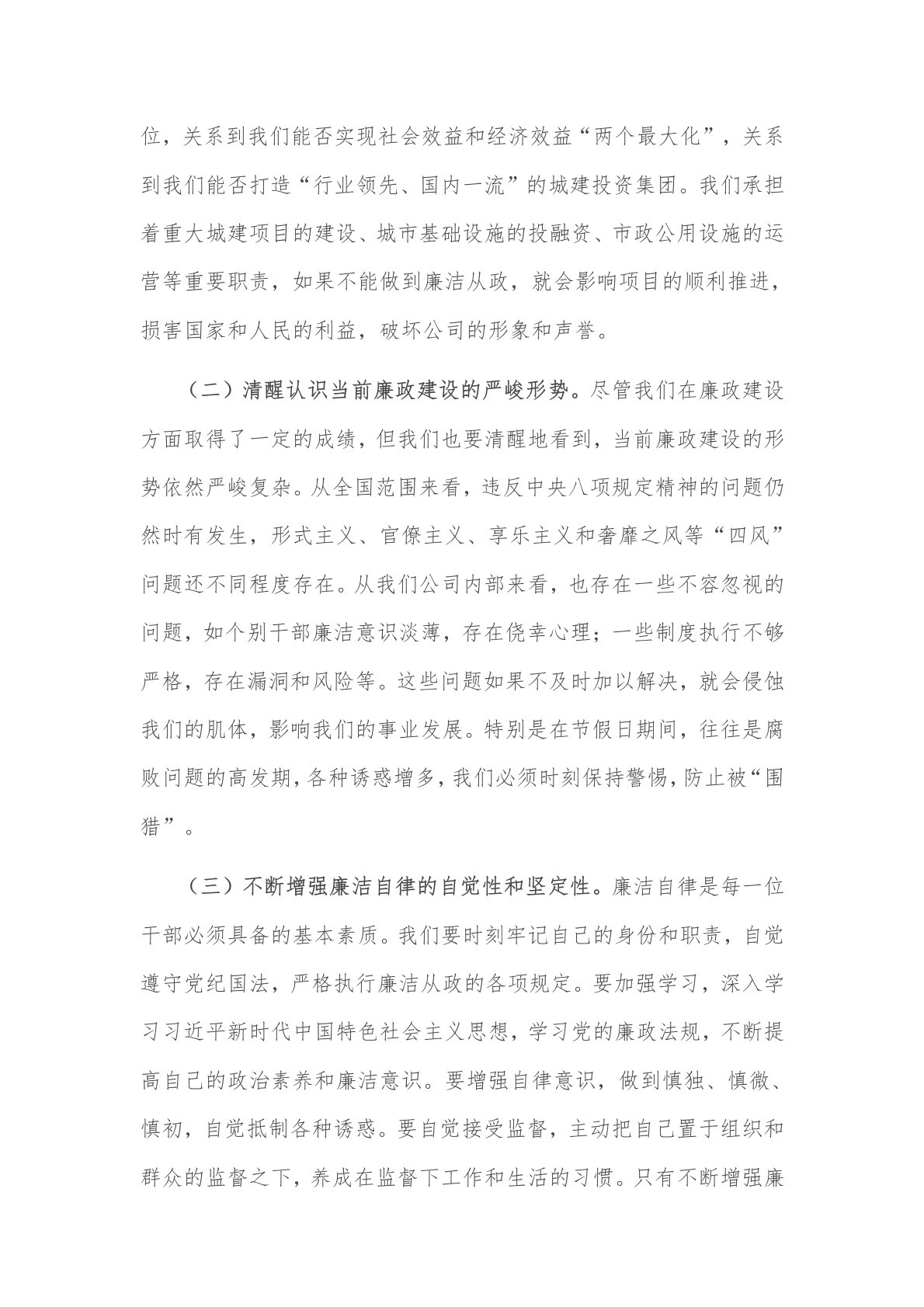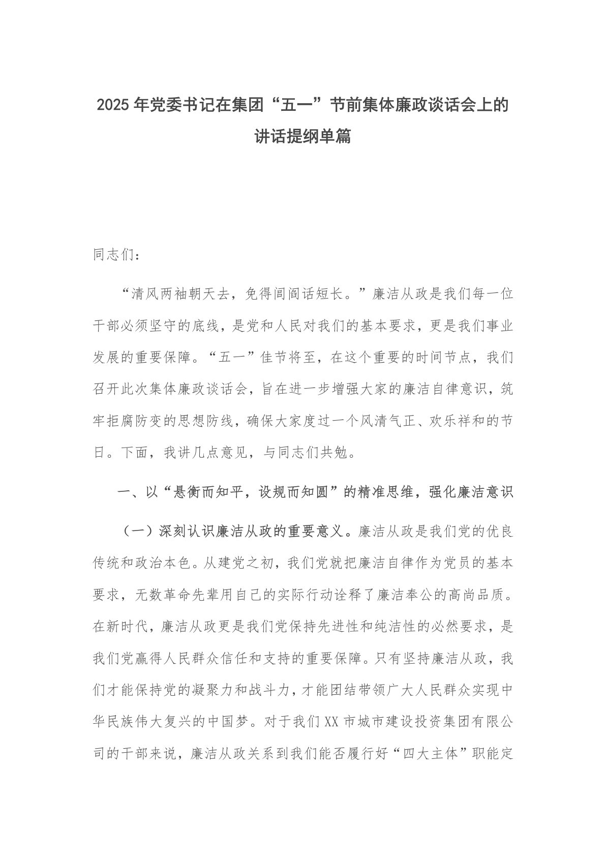 2025年党委书记在集团“五一”节前集体廉政谈话会上的讲话提纲单篇同志们:“清风两袖朝天去,免得闾阎话短长。”廉洁从政是我们每一位干部必须坚守的底线,是党和人民对我们的基本要求,更是我们事业发展的重要保障。“五一”佳节将至,在这个重要的时间节点,我们召开此次集体廉政谈话会,旨在进一步增强大家的廉洁自律意识,筑牢拒腐防变的思想防线,确保大家度过一个风清气正、欢乐祥和的节日。下面,我讲几点意见,与同志们共勉。一、以“悬衡而知平,设规而知圆”的精准思维,强化廉洁意识(一)深刻认识廉洁从政的重要意义。廉洁从政是我们党的优良传统和政治本色。从建党之初,我们党就把廉洁自律作为党员的基本要求,无数革命先辈用自己的实际行动诠释了廉洁奉公的高尚品质。在新时代,廉洁从政更是我们党保持先进性和纯洁性的必然要求,是...
