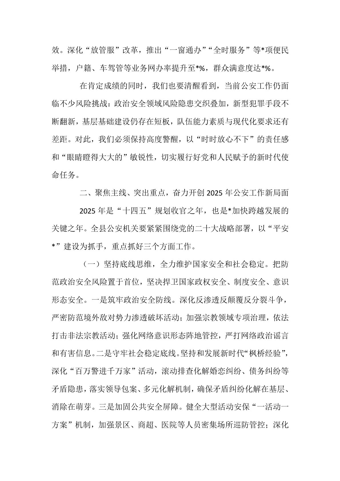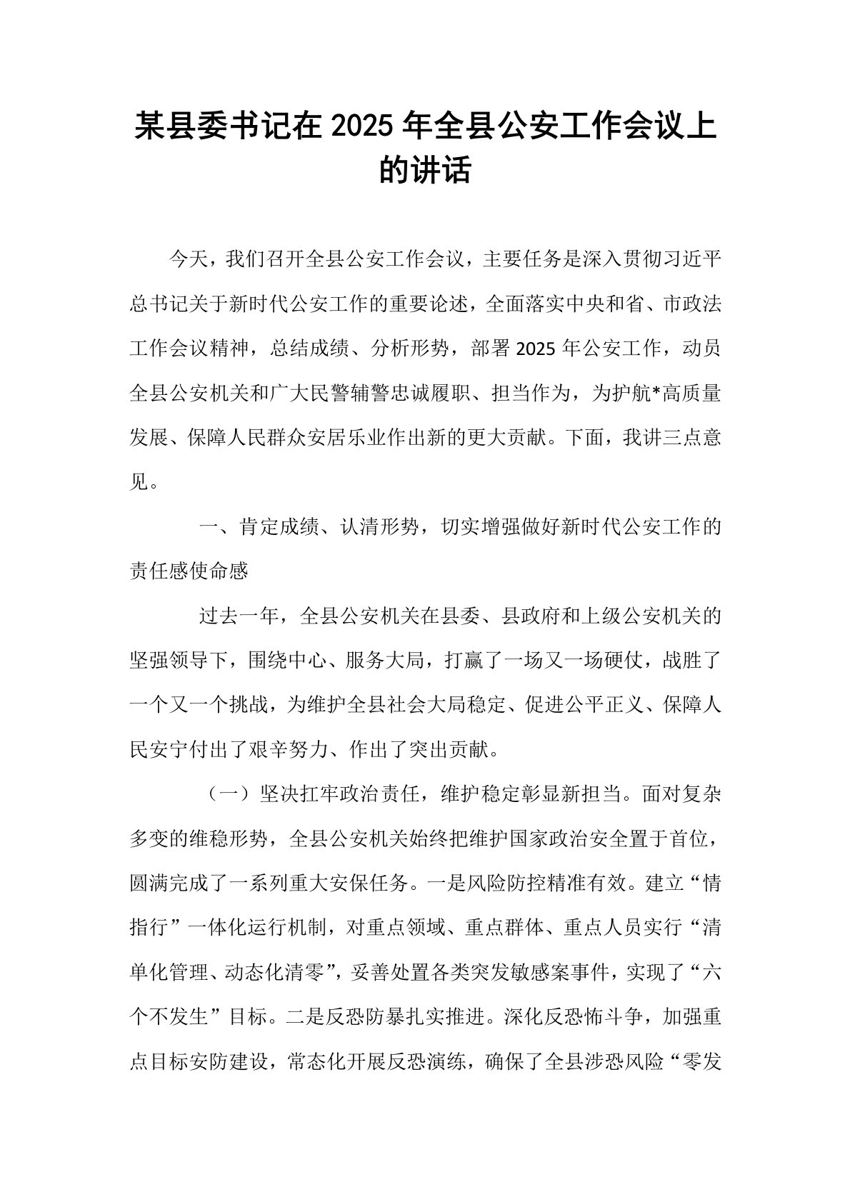 某县委书记在2025年全县公安工作会议上的讲话今天,我们召开全县公安工作会议,主要任务是深入贯彻习近平总书记关于新时代公安工作的重要论述,全面落实中央和省、市政法工作会议精神,总结成绩、分析形势,部署2025年公安工作,动员全县公安机关和广大民警辅警忠诚履职、担当作为,为护航*高质量发展、保障人民群众安居乐业作出新的更大贡献。下面,我讲三点意见。一、肯定成绩、认清形势,切实增强做好新时代公安工作的责任感使命感过去一年,全县公安机关在县委、县政府和上级公安机关的坚强领导下,围绕中心、服务大局,打赢了一场又一场硬仗,战胜了一个又一个挑战,为维护全县社会大局稳定、促进公平正义、保障人民安宁付出了艰辛努力、作出了突出贡献。(一)坚决扛牢政治责任,维护稳定彰显新担当。面对复杂多变的维稳形势,全县公安机...