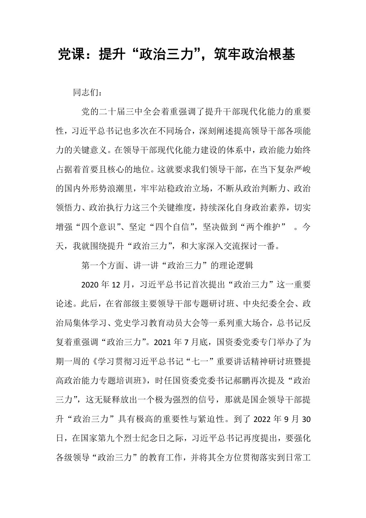 党课:提升“政治三力”,筑牢政治根基同志们:党的二十届三中全会着重强调了提升干部现代化能力的重要性,习近平总书记也多次在不同场合,深刻阐述提高领导干部各项能力的关键意义。在领导干部现代化能力建设的体系中,政治能力始终占据着首要且核心的地位。这就要求我们领导干部,在当下复杂严峻的国内外形势浪潮里,牢牢站稳政治立场,不断从政治判断力、政治领悟力、政治执行力这三个关键维度,持续深化自身政治素养,切实增强“四个意识”、坚定“四个自信”,坚决做到“两个维护”。今天,我就围绕提升“政治三力”,和大家深入交流探讨一番。第一个方面、讲一讲“政治三力”的理论逻辑2020年12月,习近平总书记首次提出“政治三力”这一重要论述。此后,在省部级主要领导干部专题研讨班、中央纪委全会、政治局集体学习、党史学习教育动员...